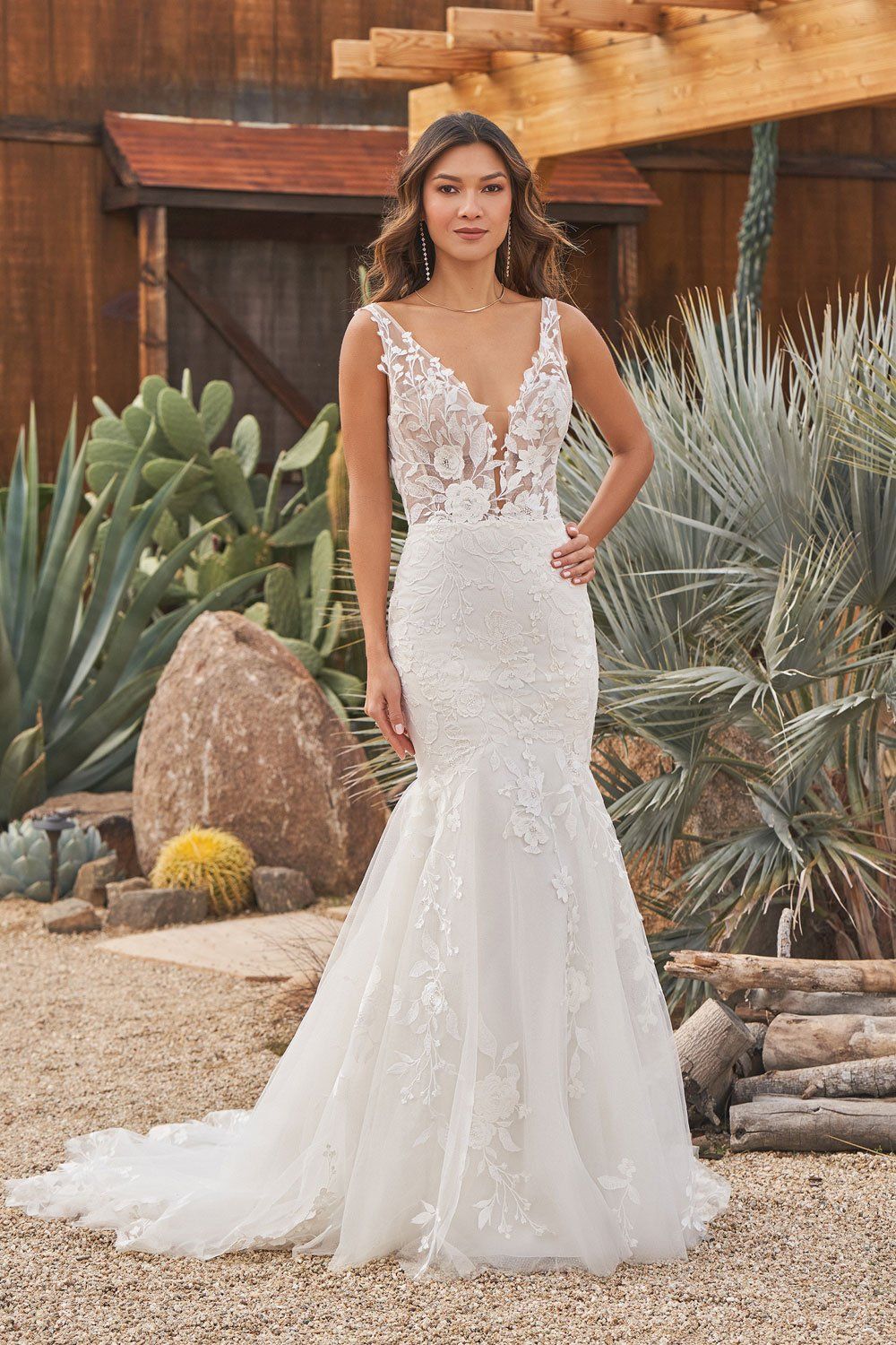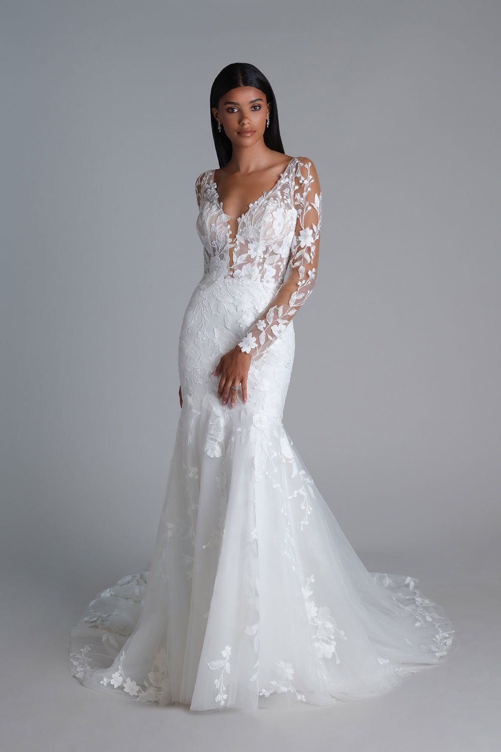 Allover lace fit and flare dress with sheer bodice. Features plunging V-neckline, long sleeves, and V-back. Whisker ruching details back hip area. Trim lace accents natural waist while a scalloped eyelash trim lace finishes neckline, sleeve cuffs, and hem. Complete with jersey lining and chapel length train.