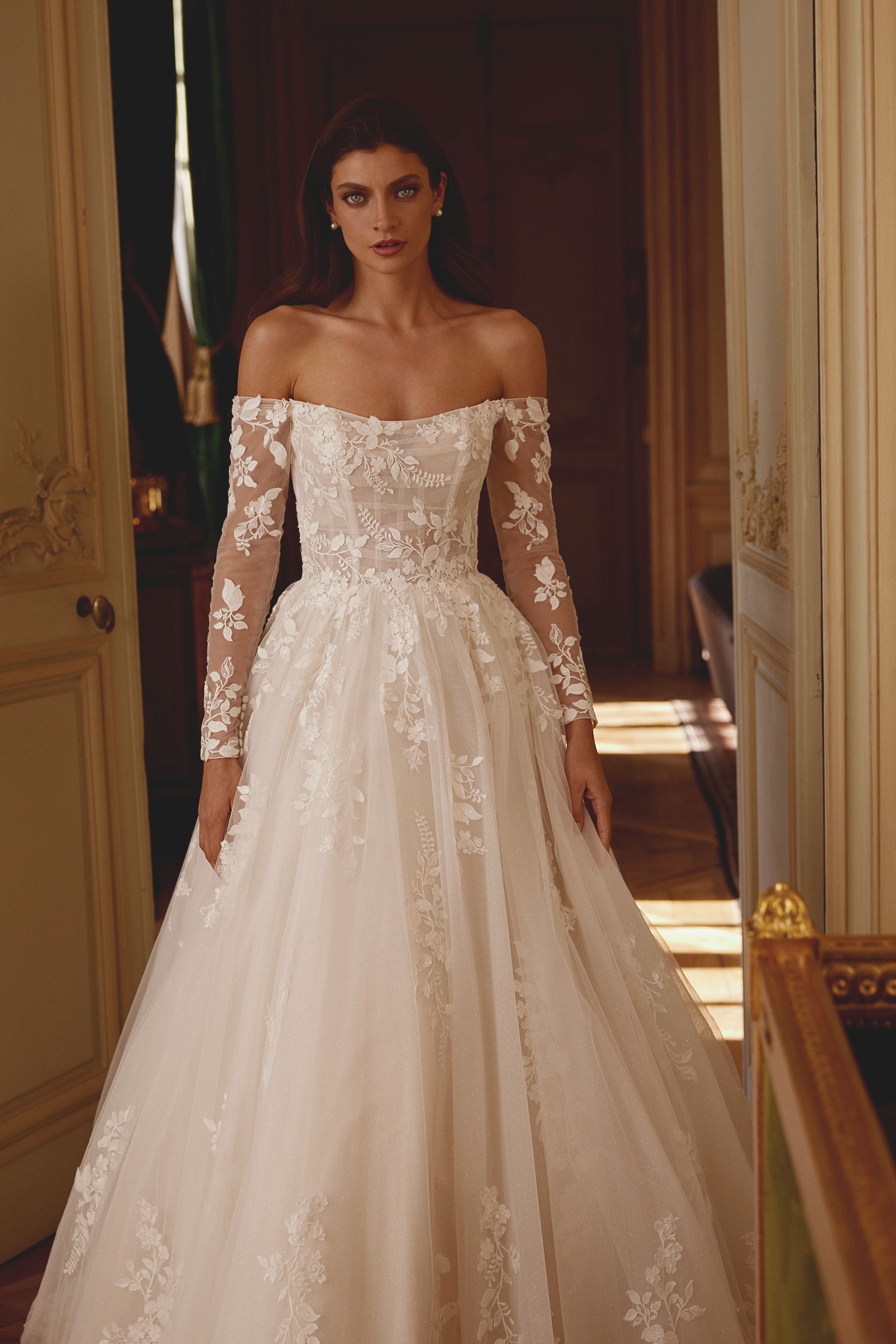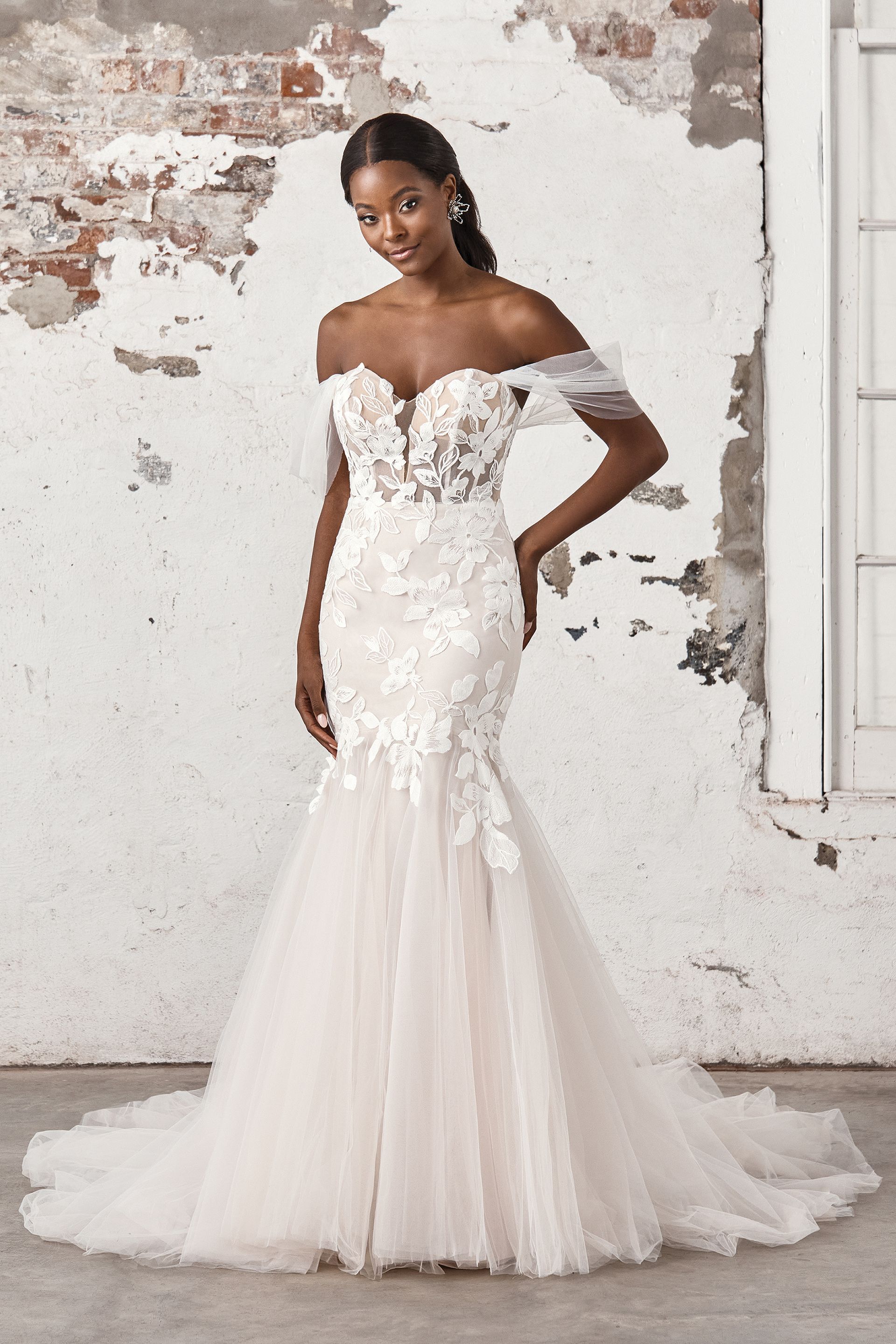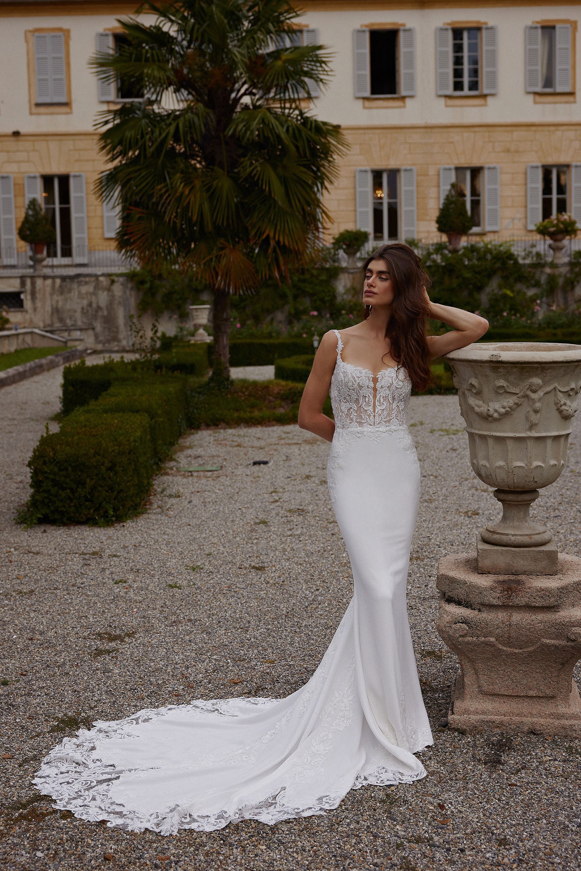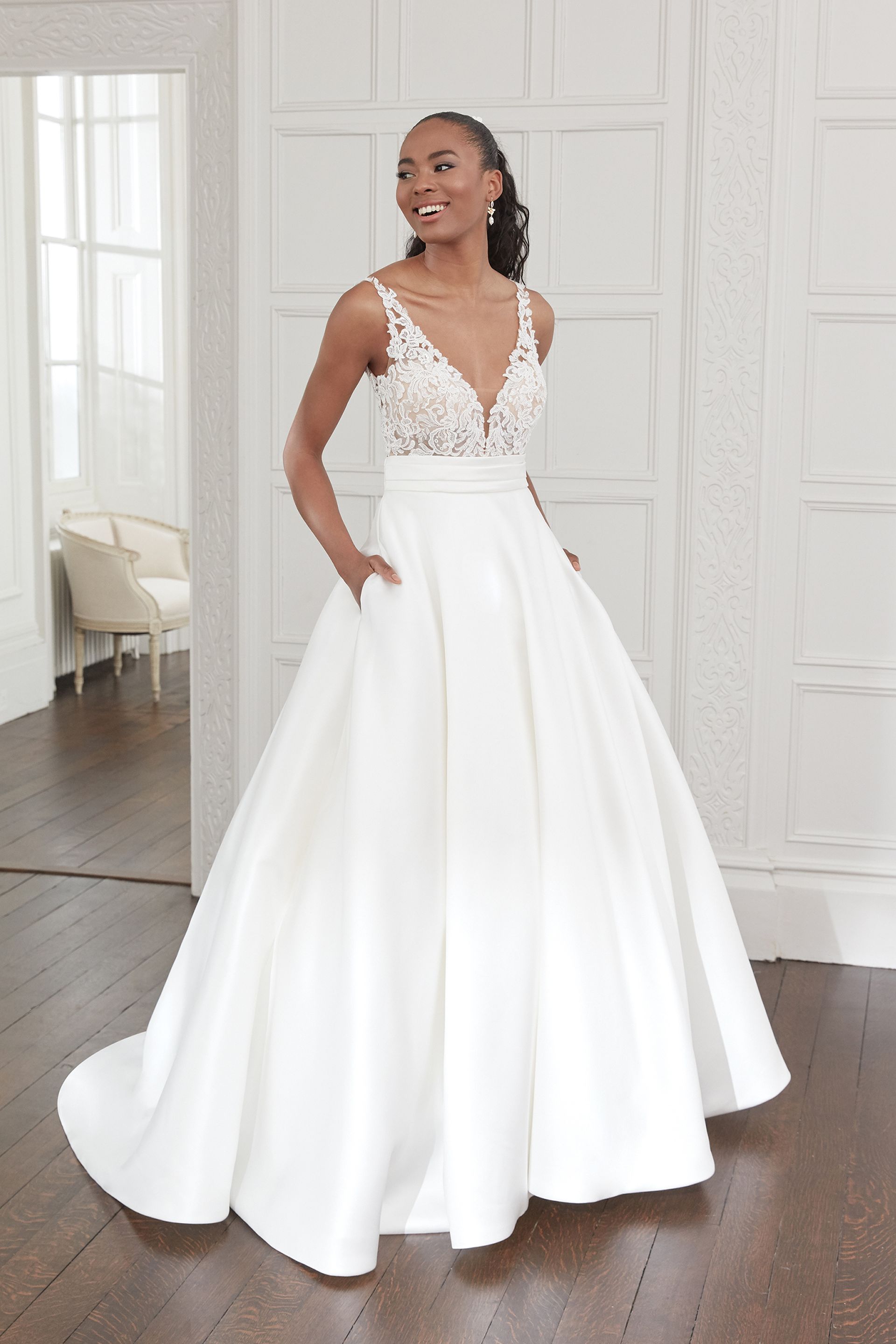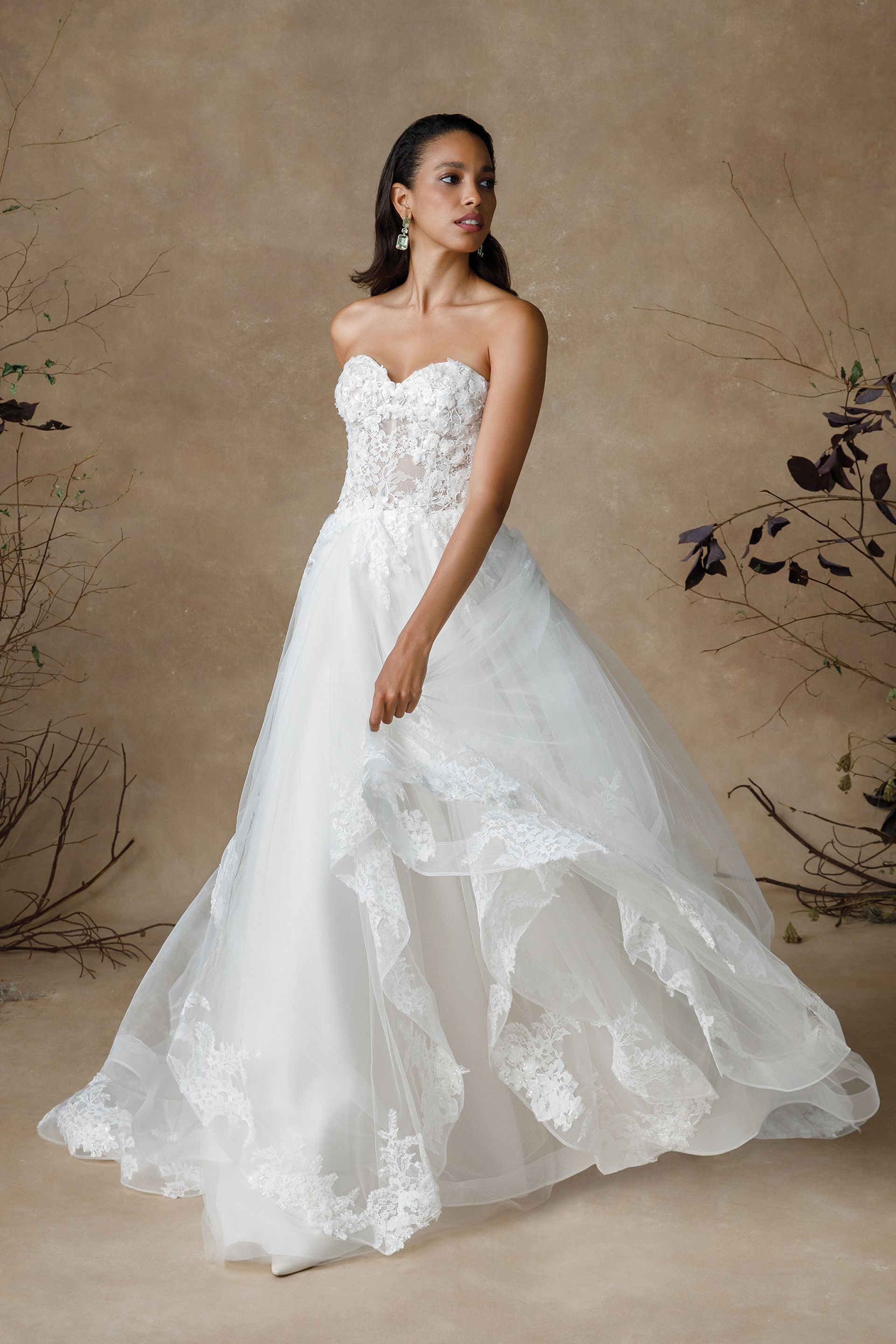 Silhouettes like fit and flare, ballgowns, A-line and mermaid. Fabrics of lace, tulle, satin, mikado, and crepe