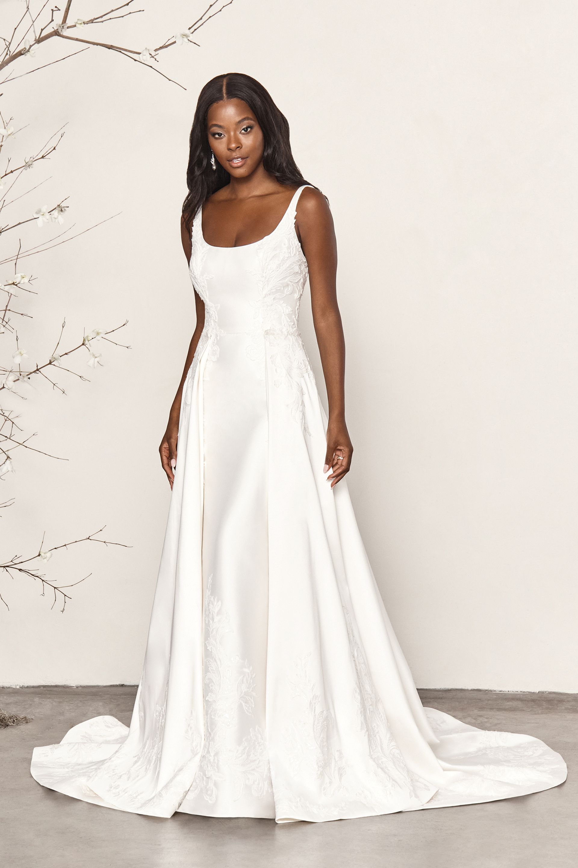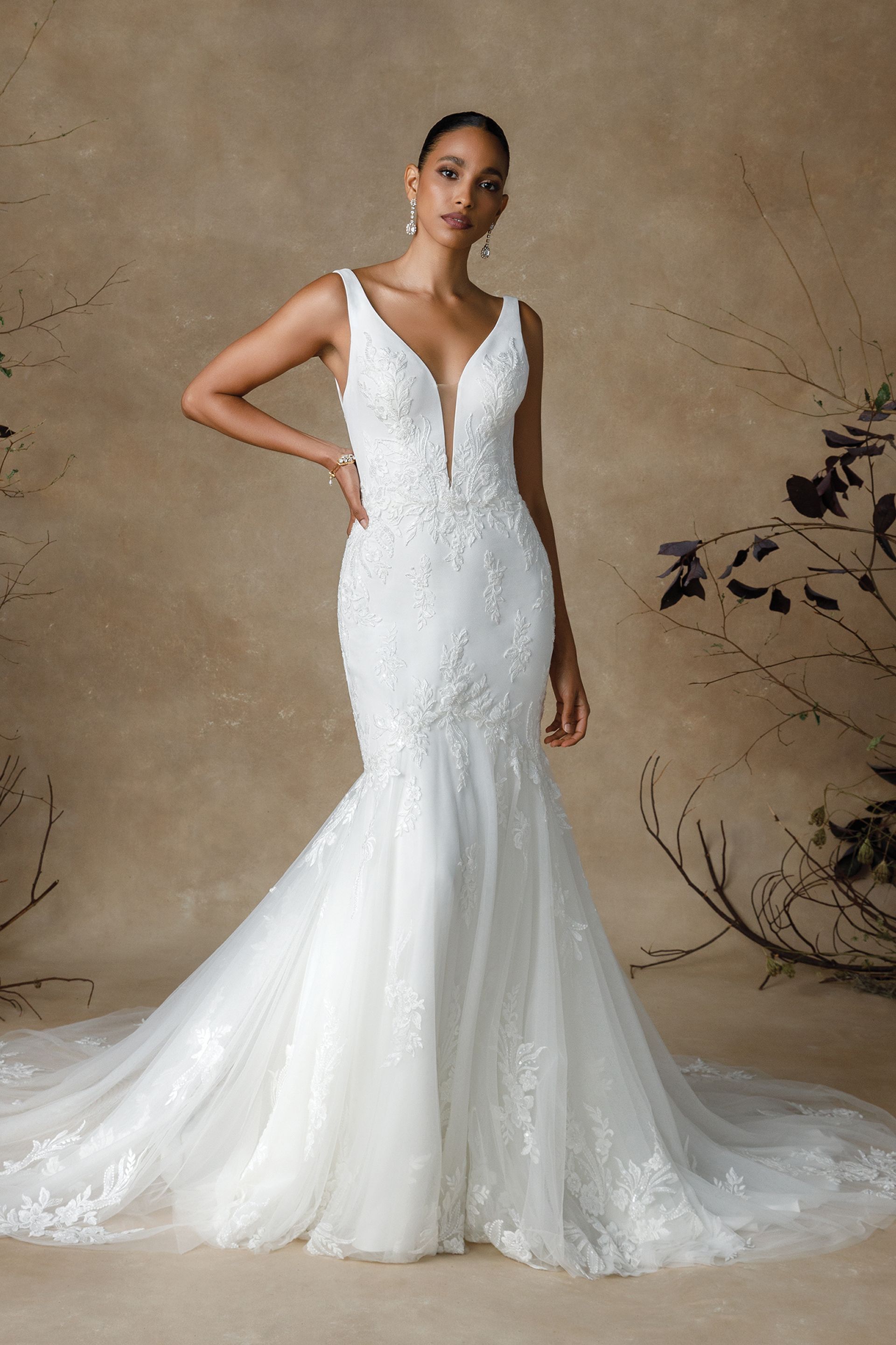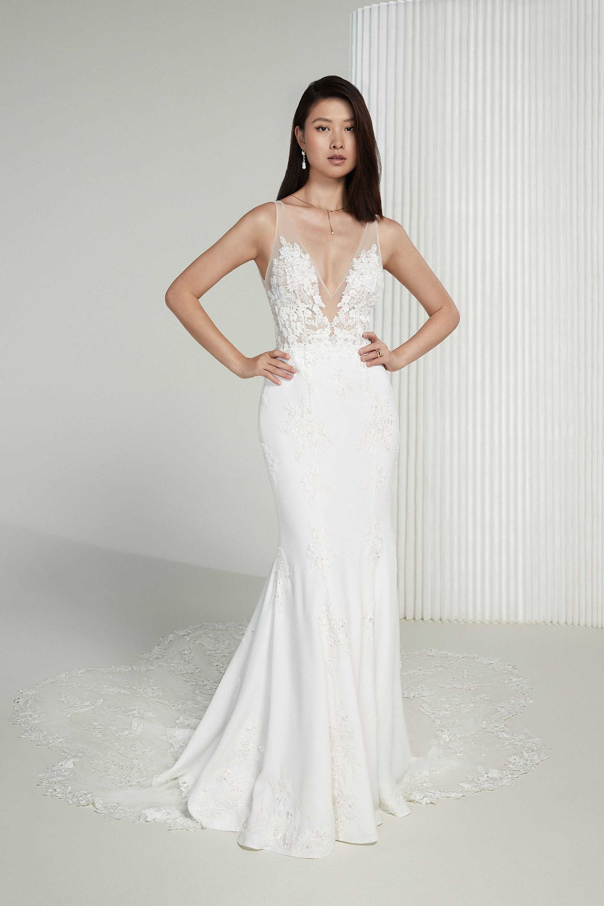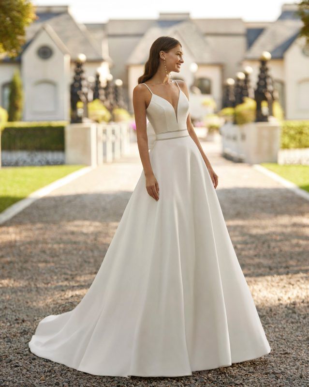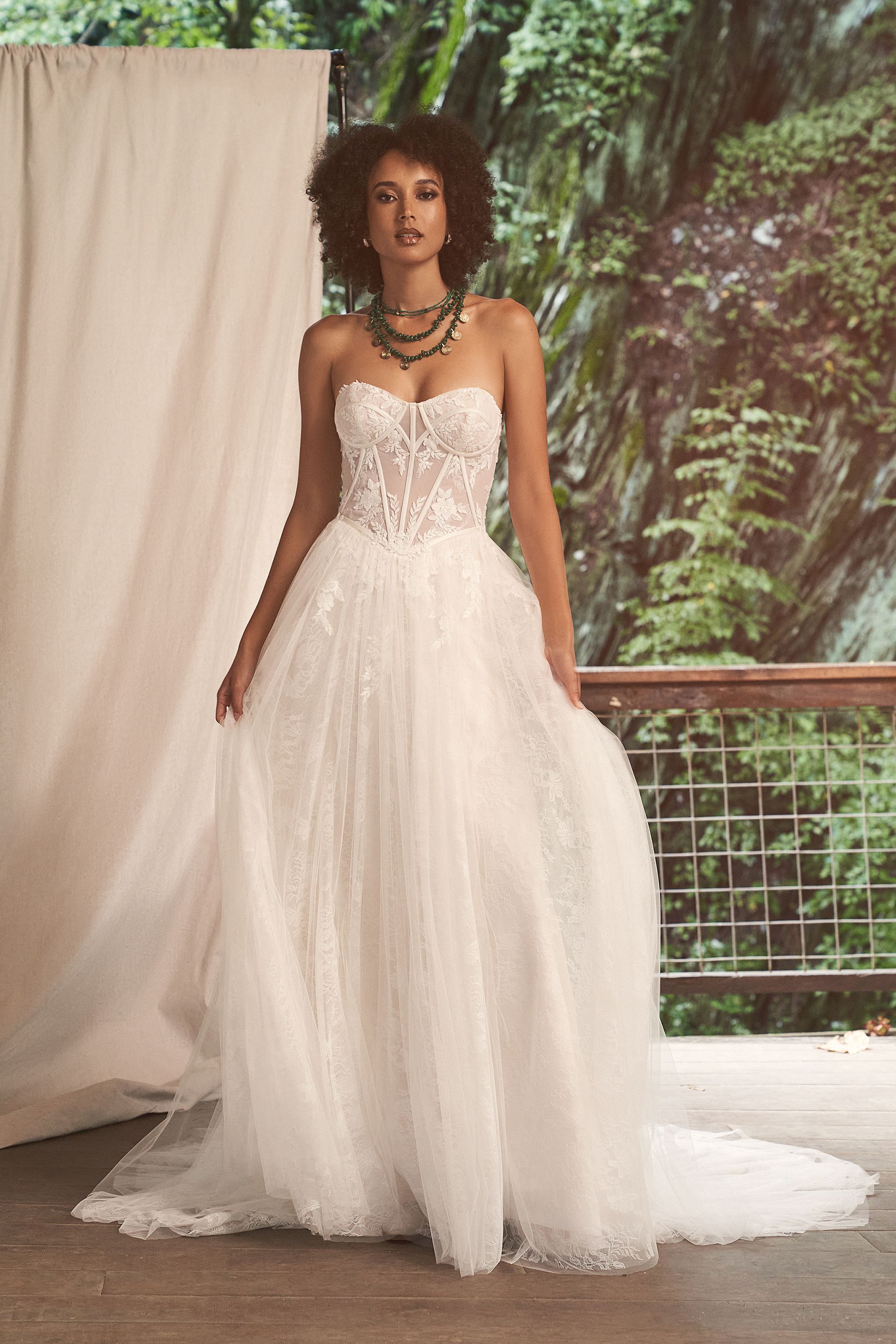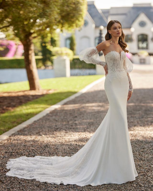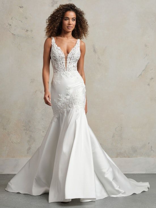 Silhouettes like fit and flare, ballgowns, A-line and mermaid. Fabrics of lace, tulle, satin, mikado, and crepe
