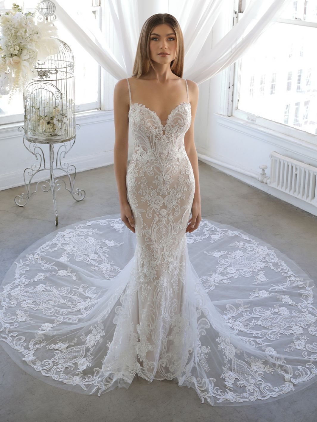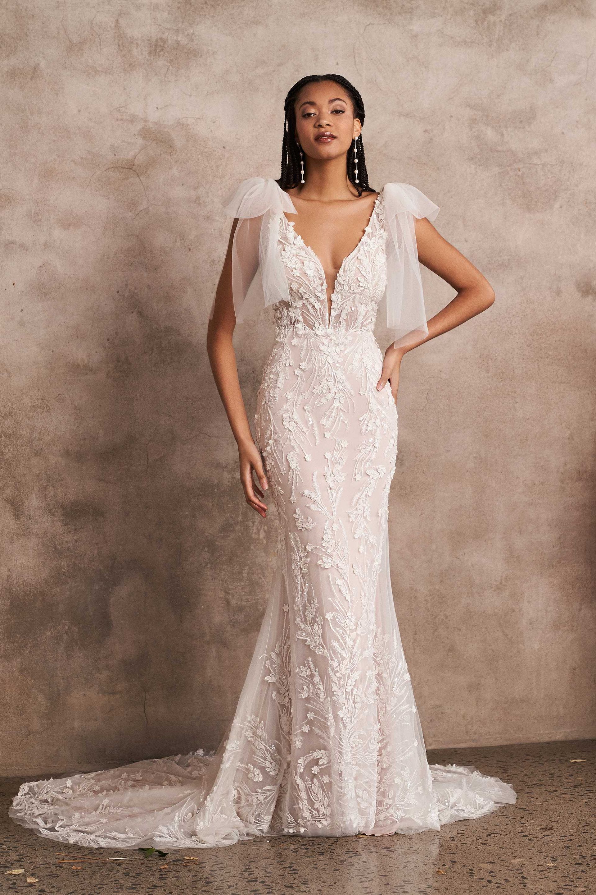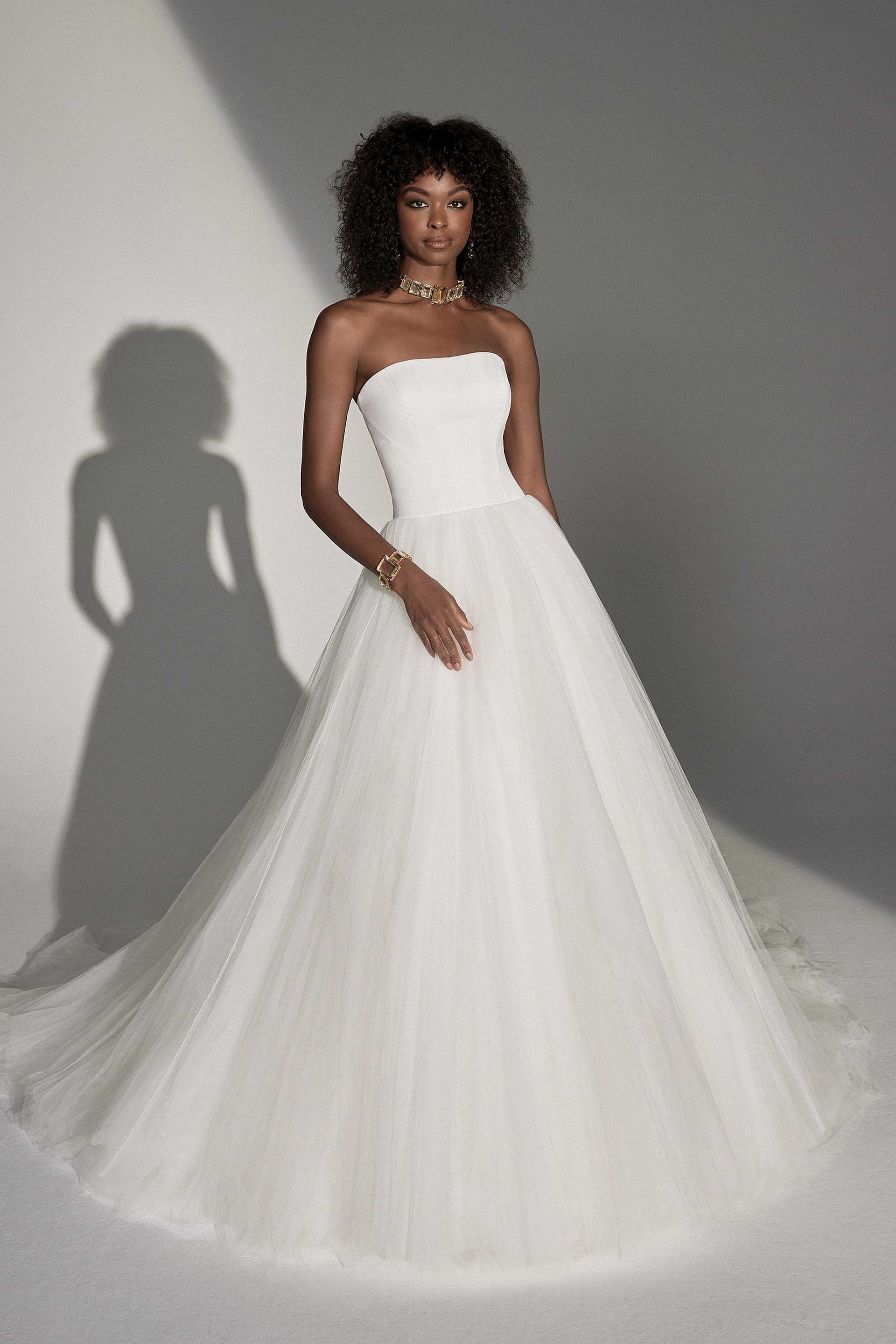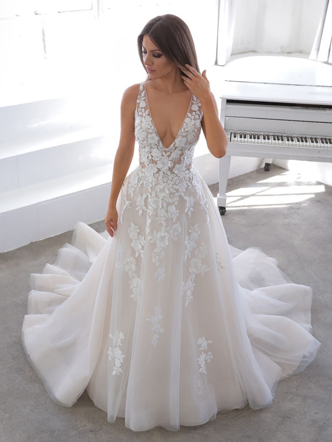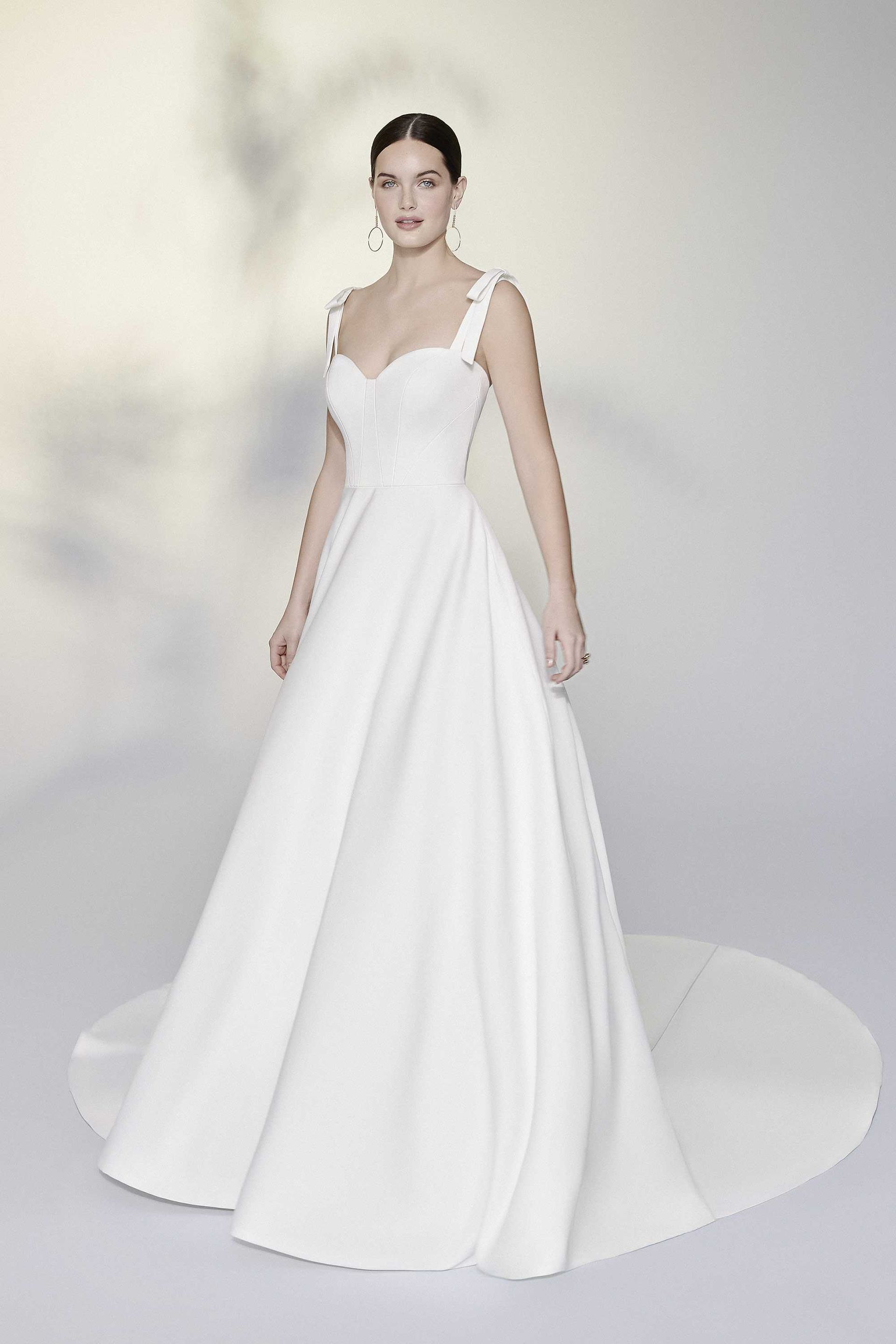 Silhouettes like fit and flare, ballgowns, A-line and mermaid. Fabrics of lace, tulle, satin, mikado, and crepe