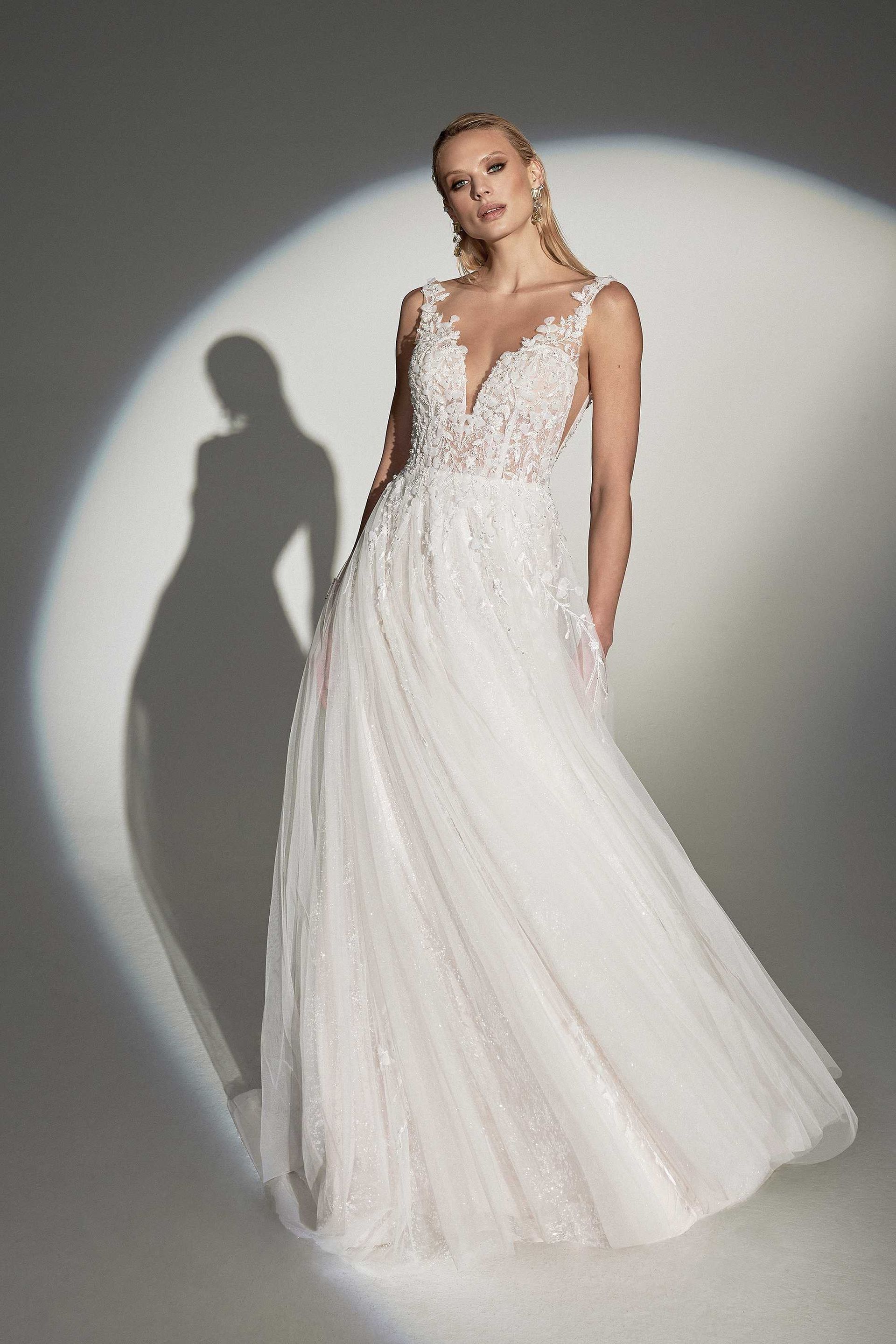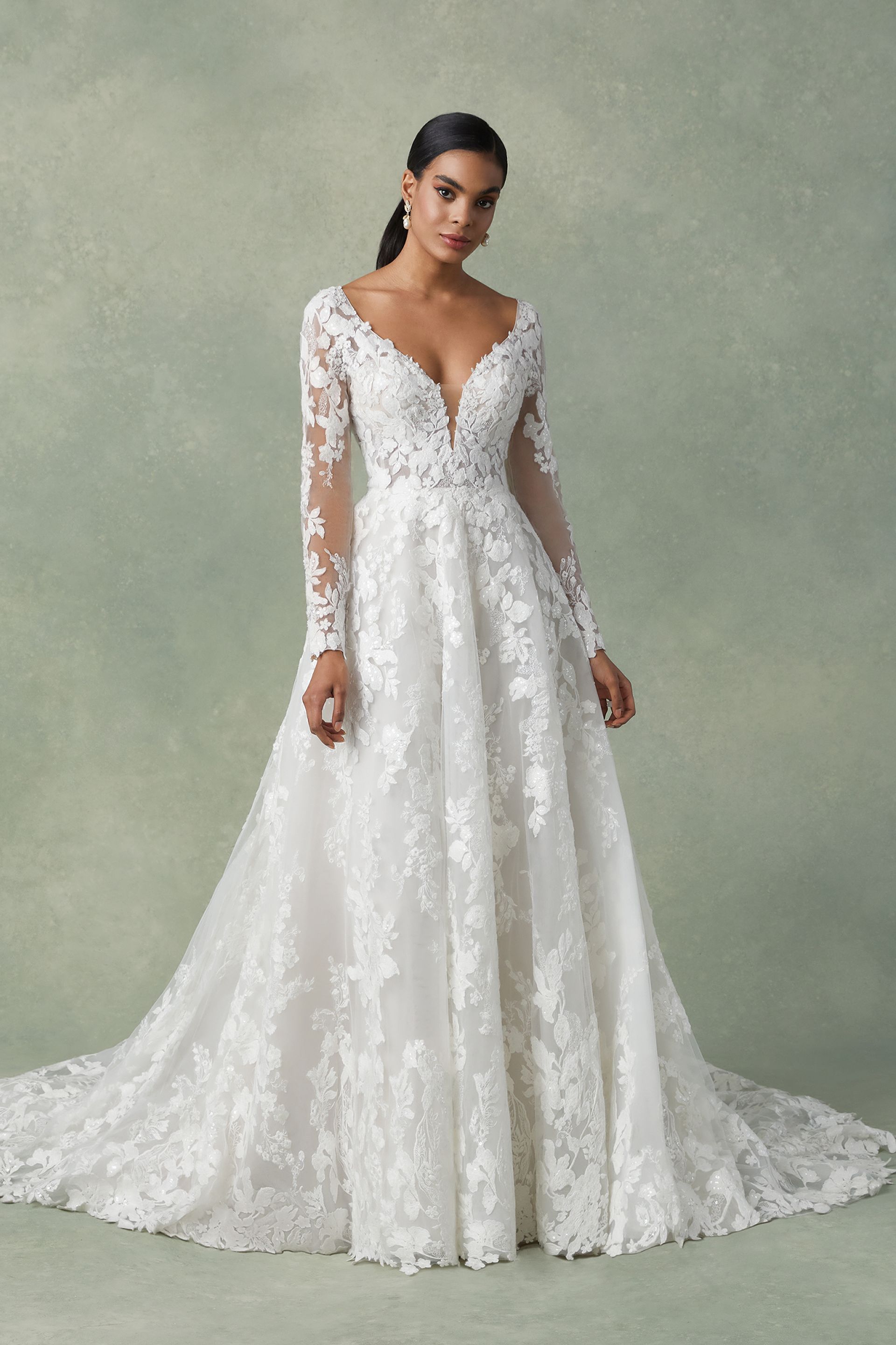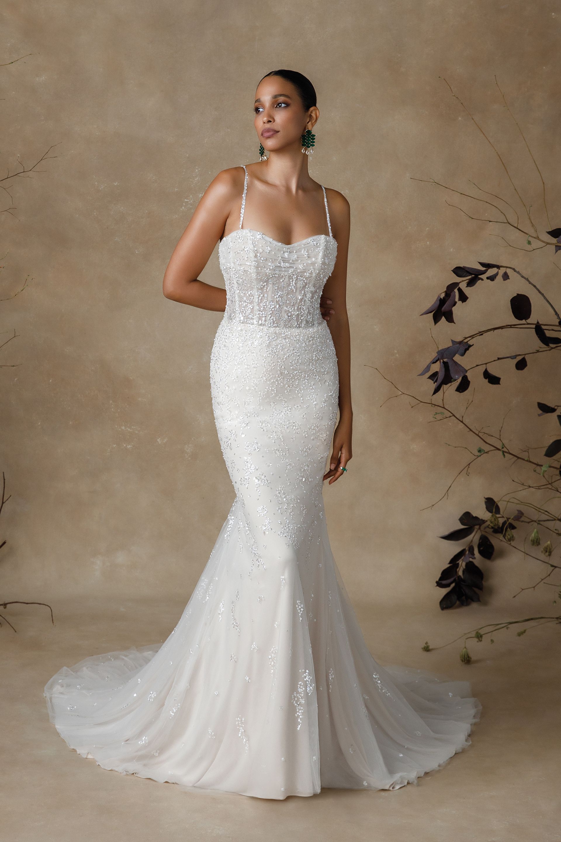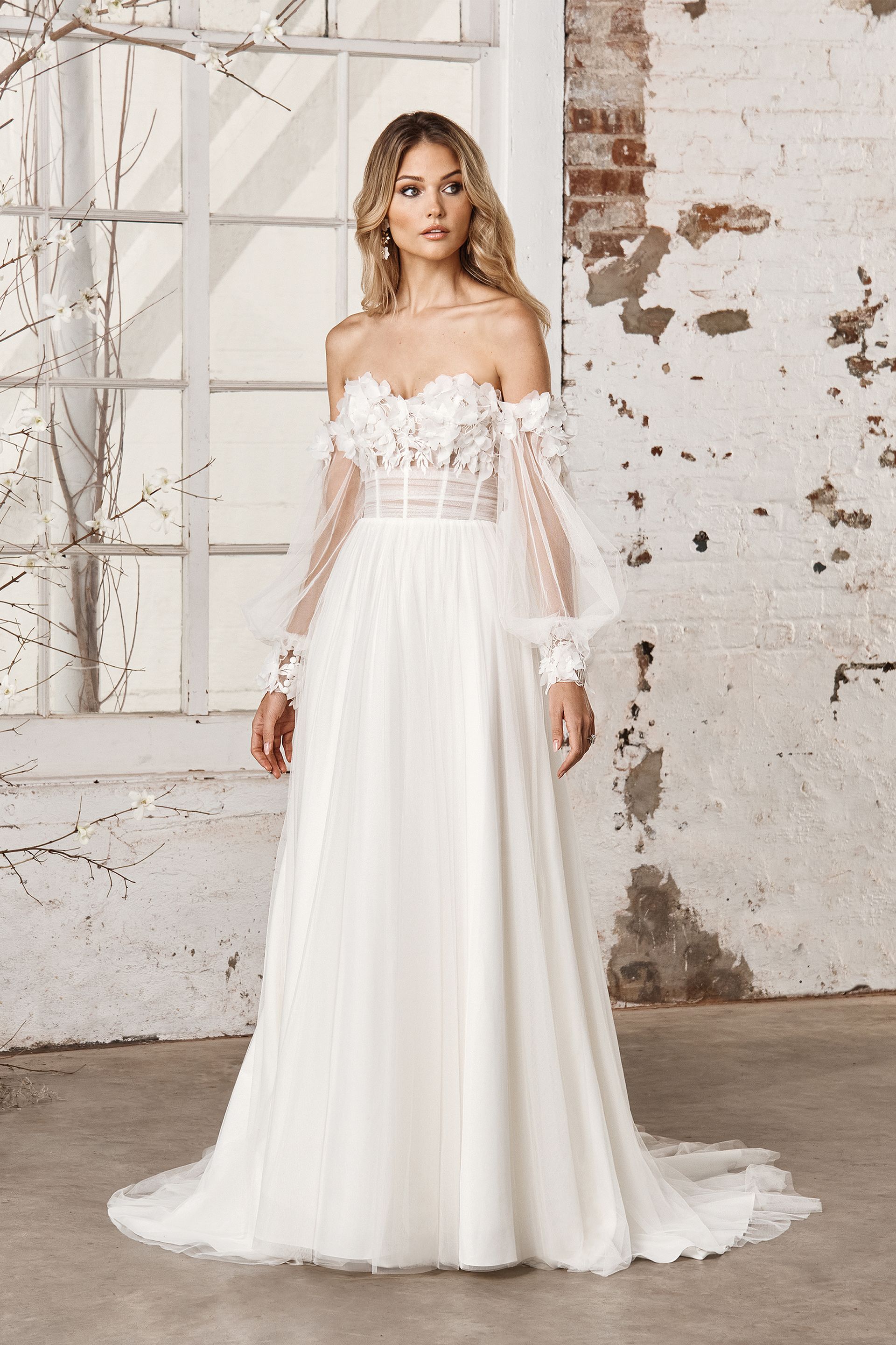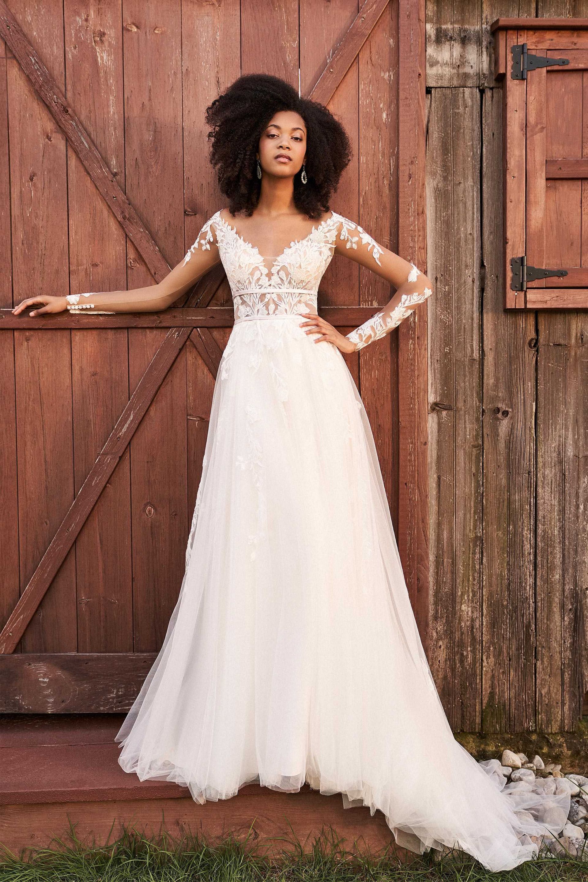 Silhouettes like fit and flare, ballgowns, A-line and mermaid. Fabrics of lace, tulle, satin, mikado, and crepe