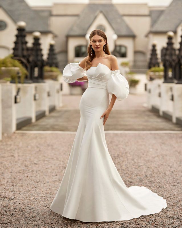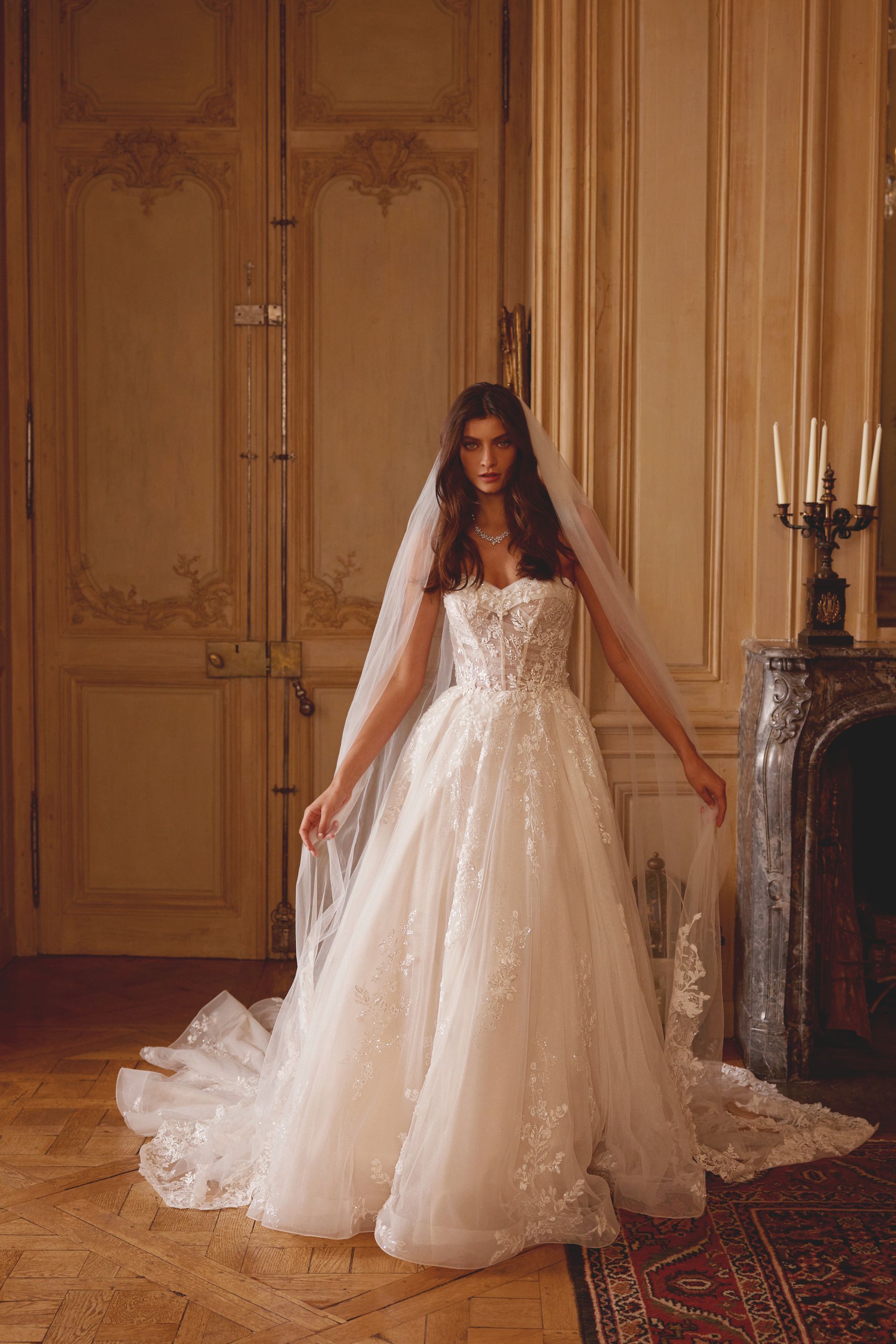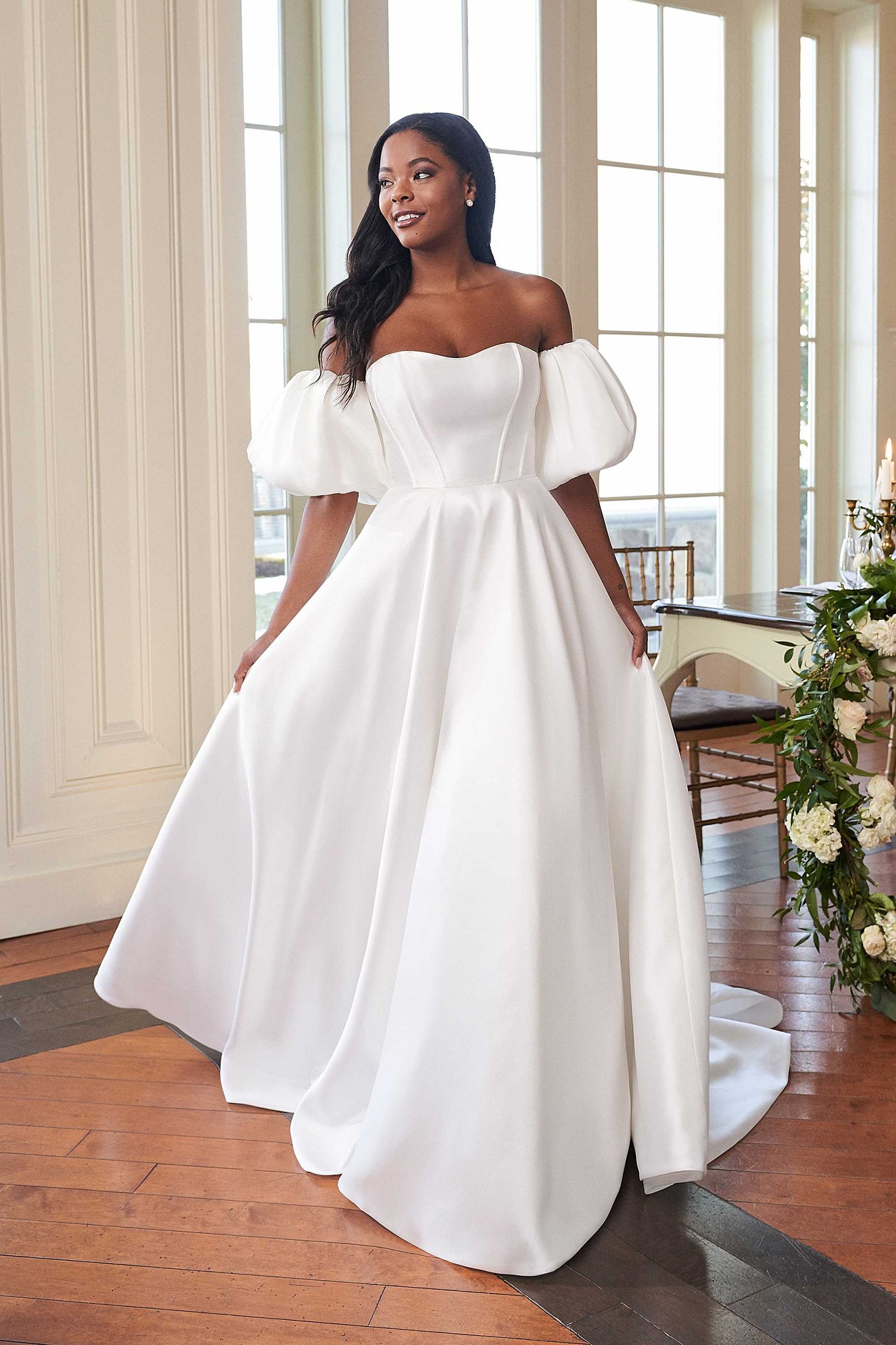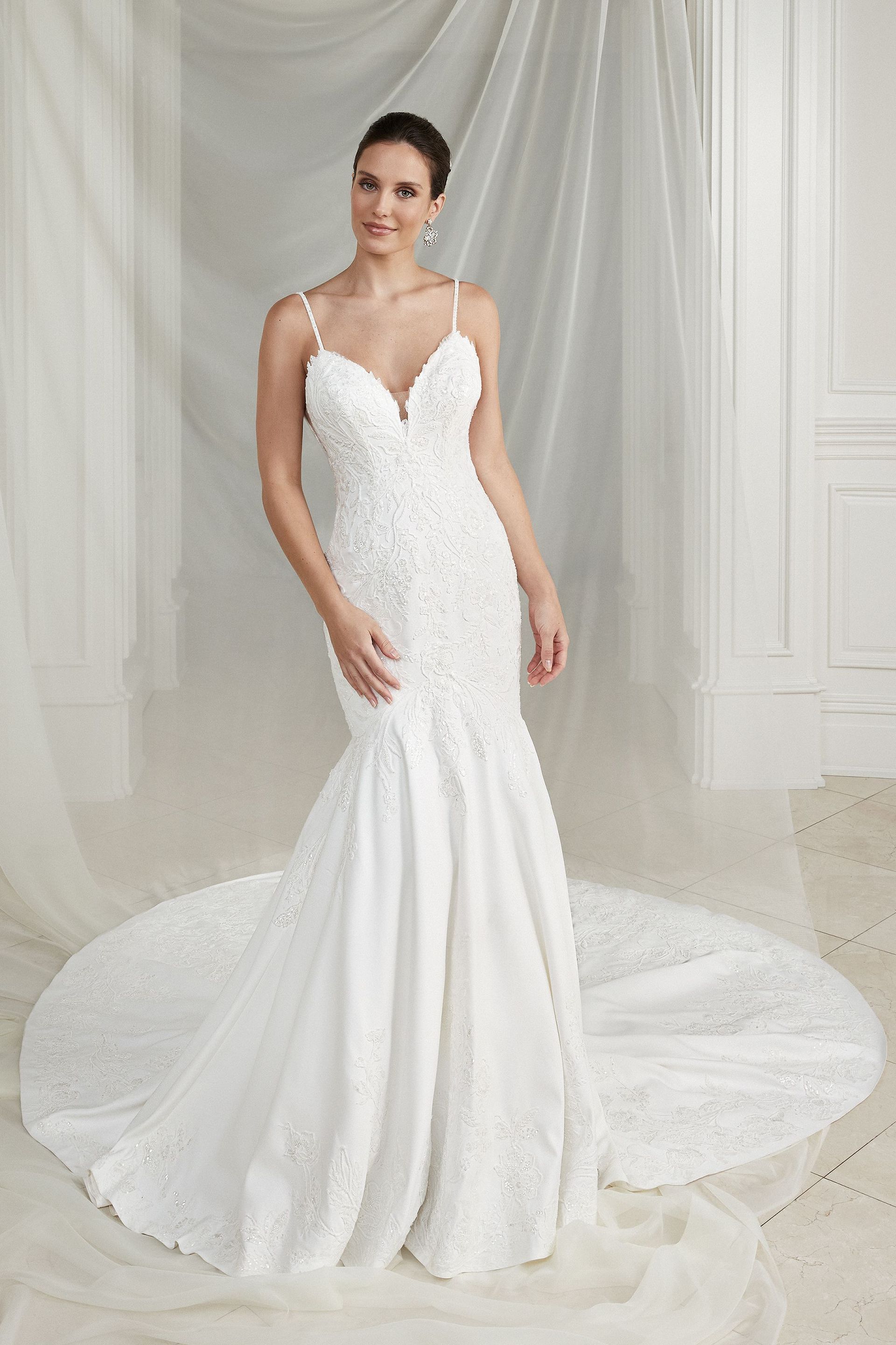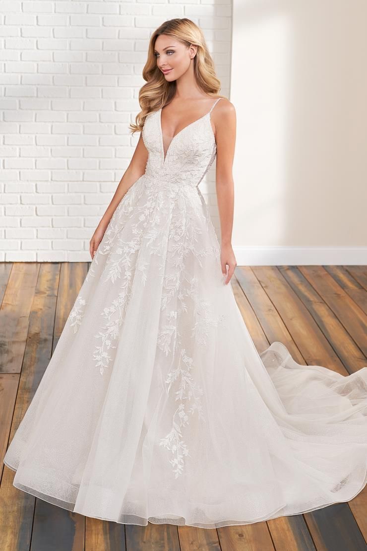 Silhouettes like fit and flare, ballgowns, A-line and mermaid. Fabrics of lace, tulle, satin, mikado, and crepe