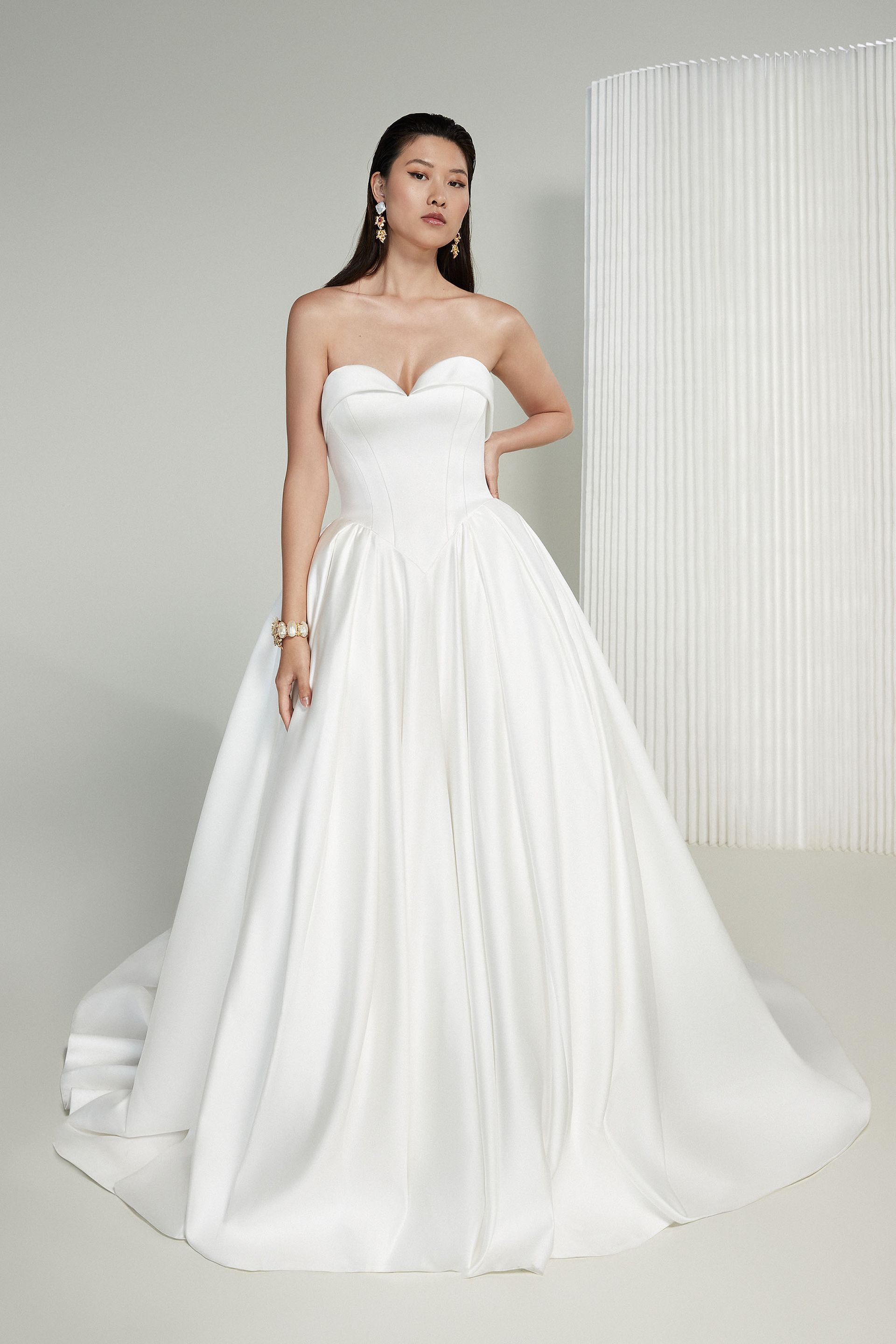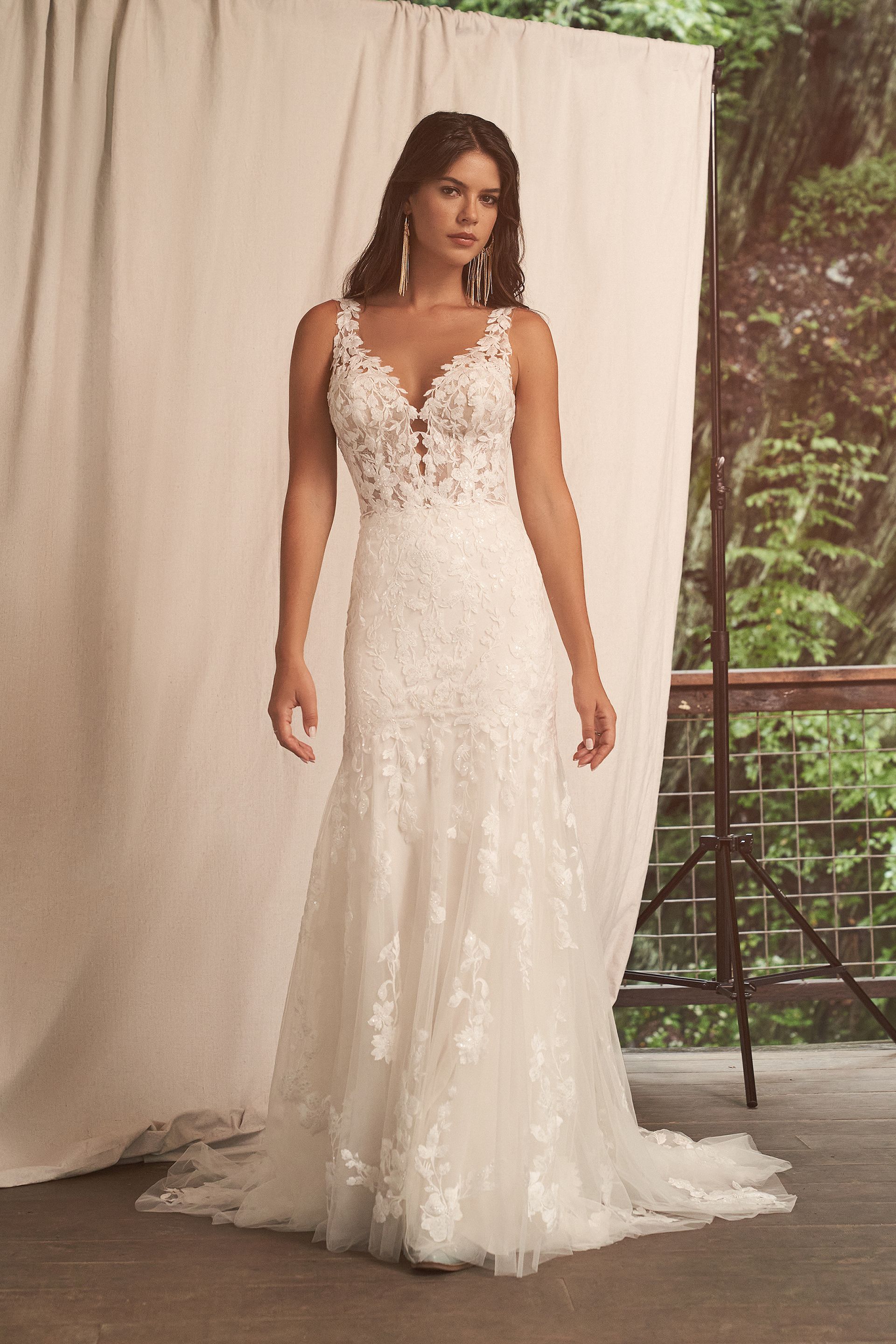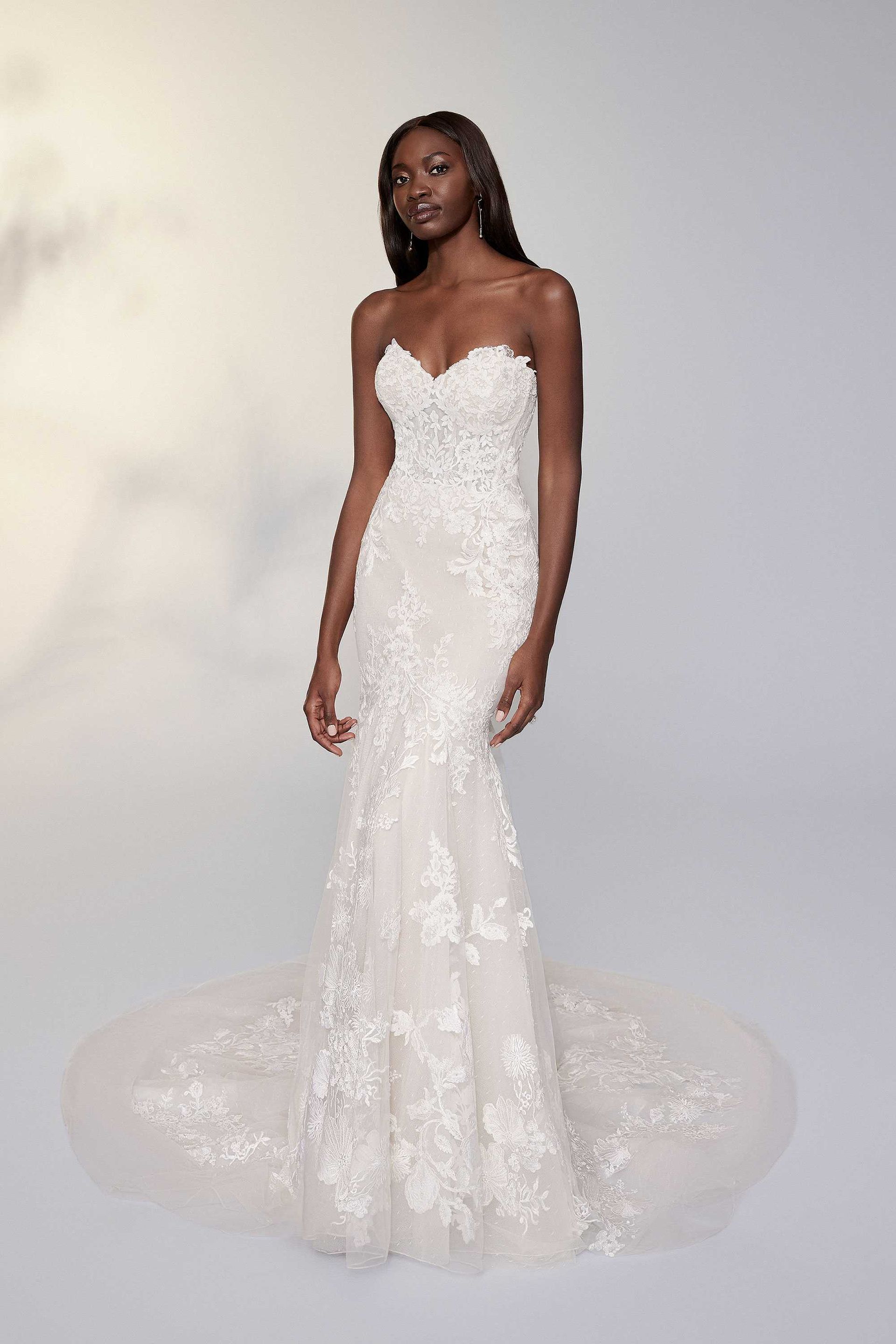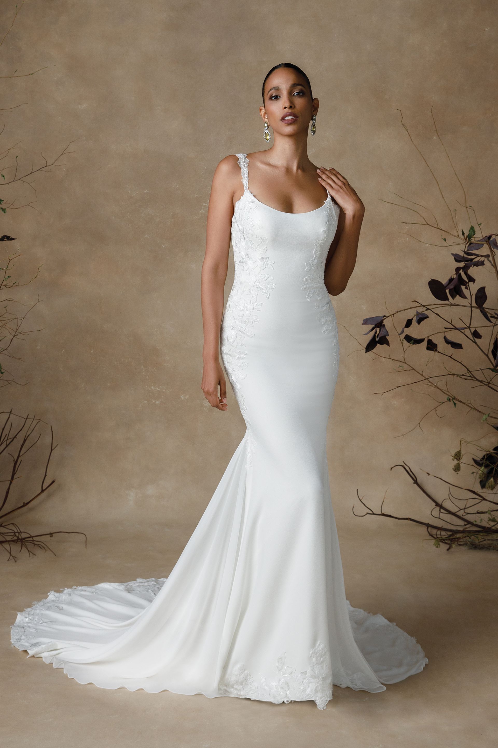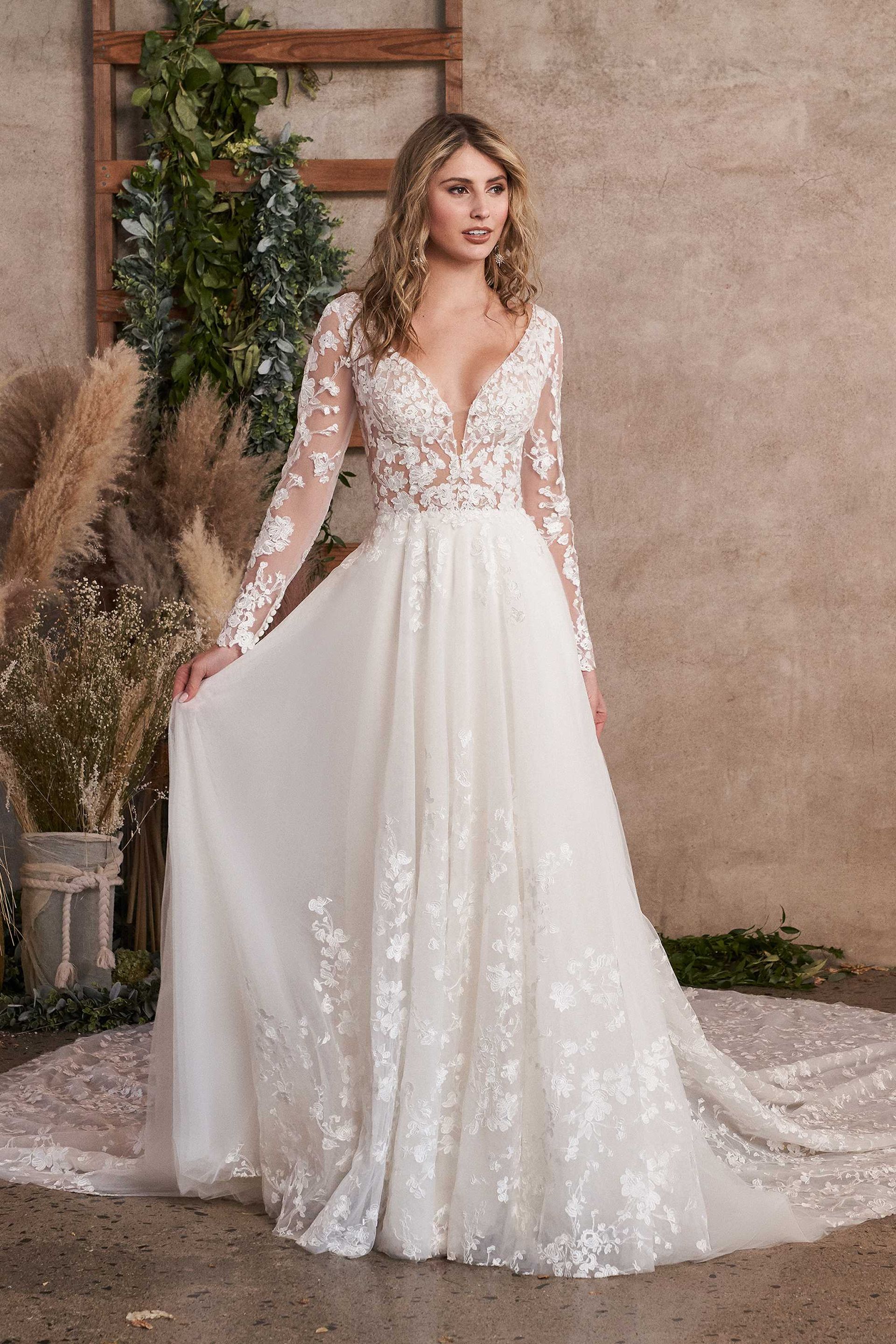 Silhouettes like fit and flare, ballgowns, A-line and mermaid. Fabrics of lace, tulle, satin, mikado, and crepe