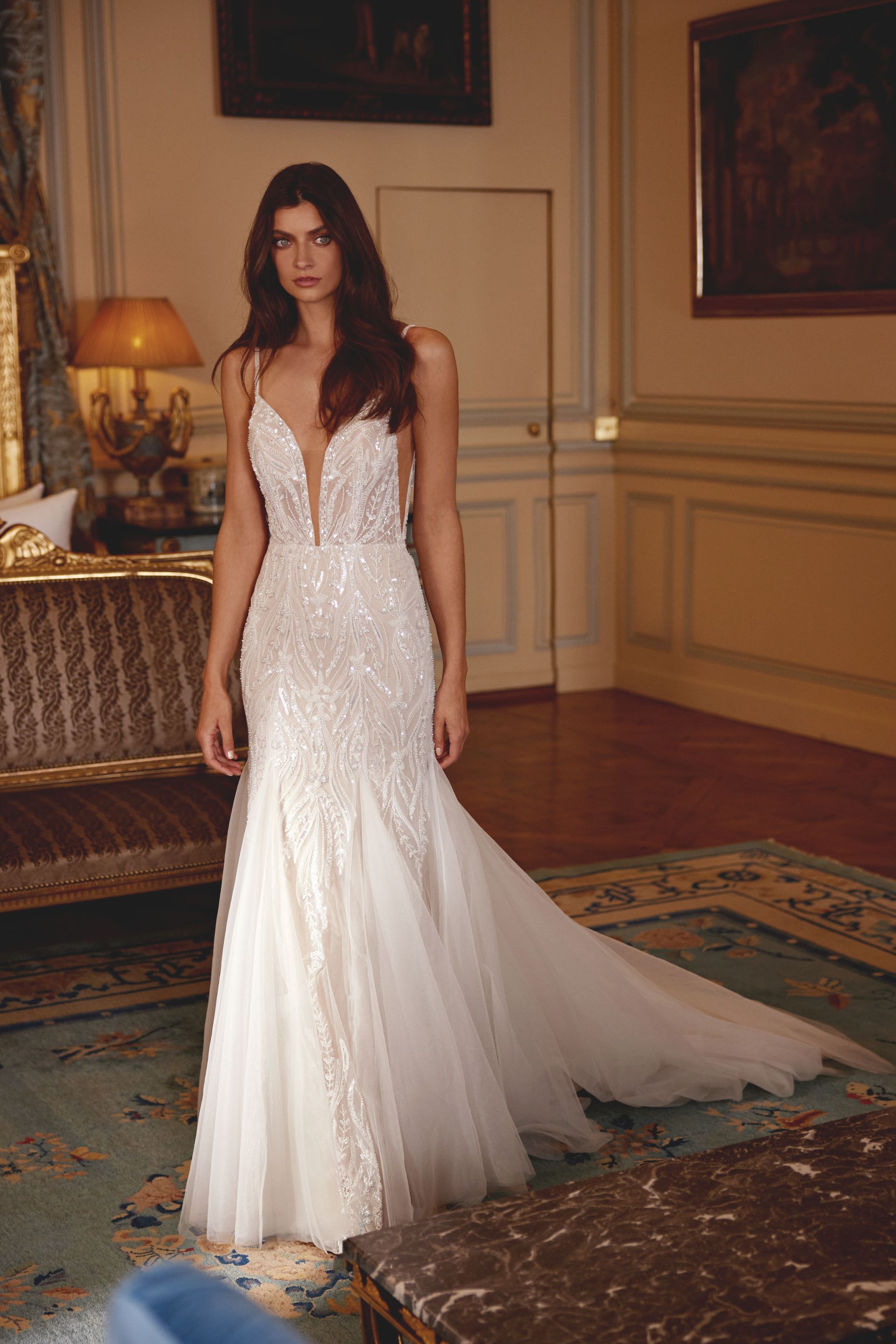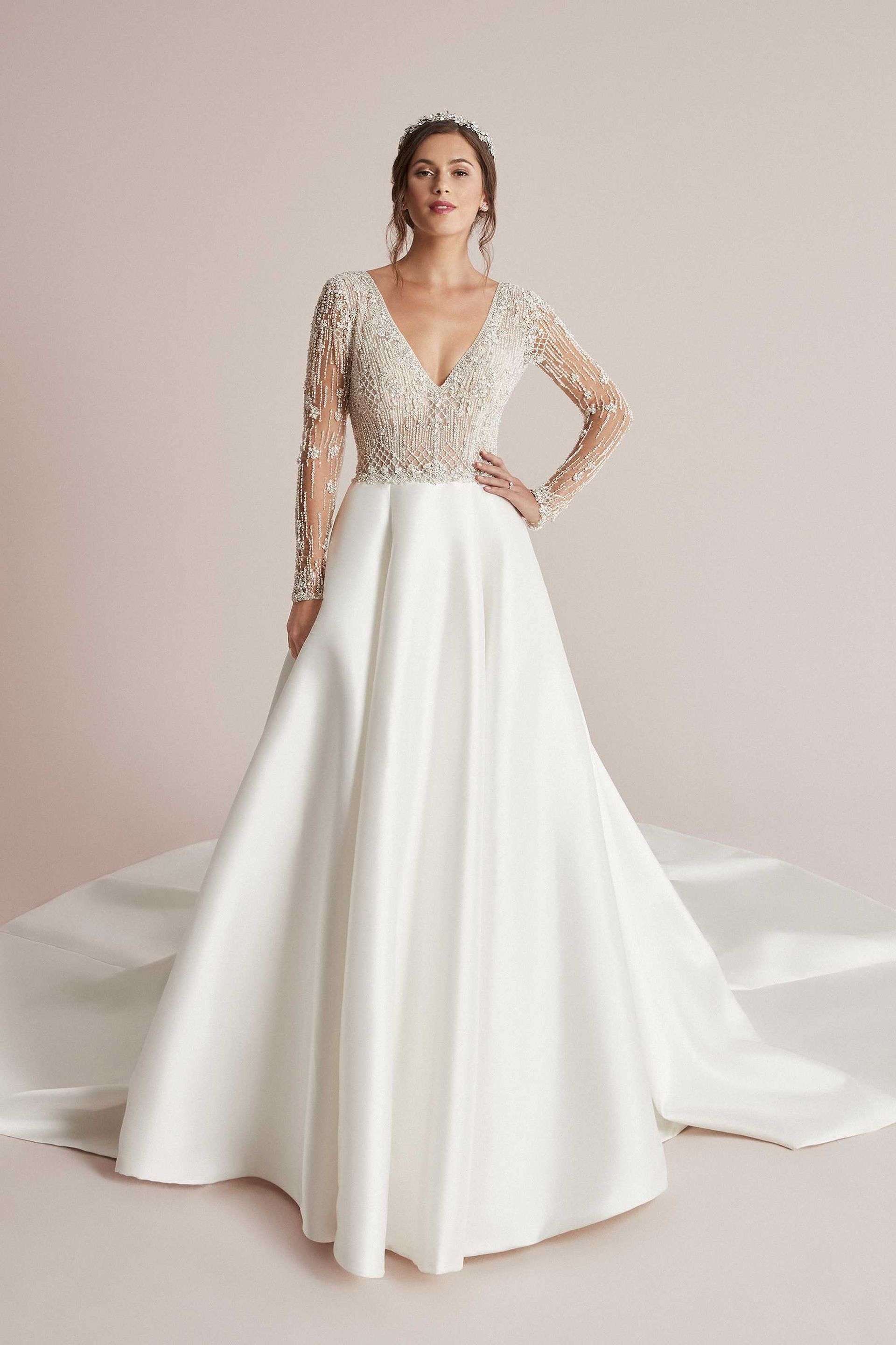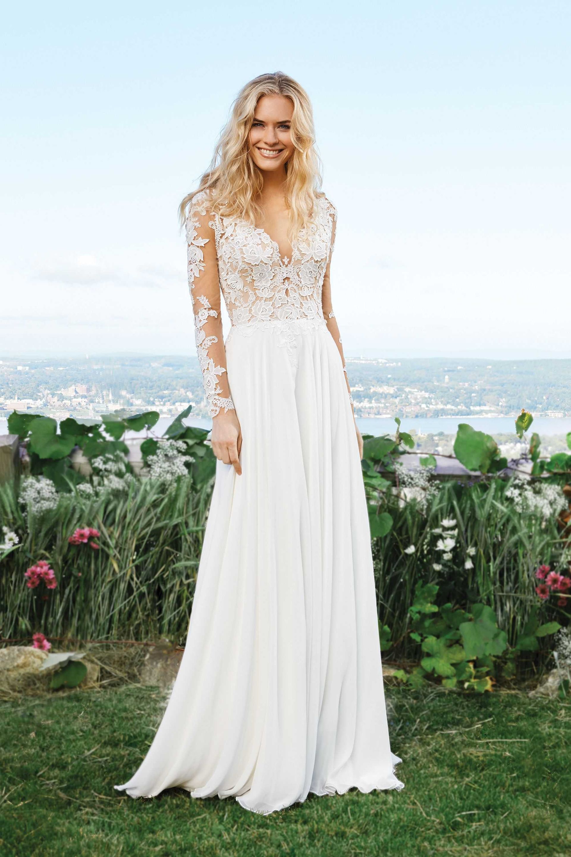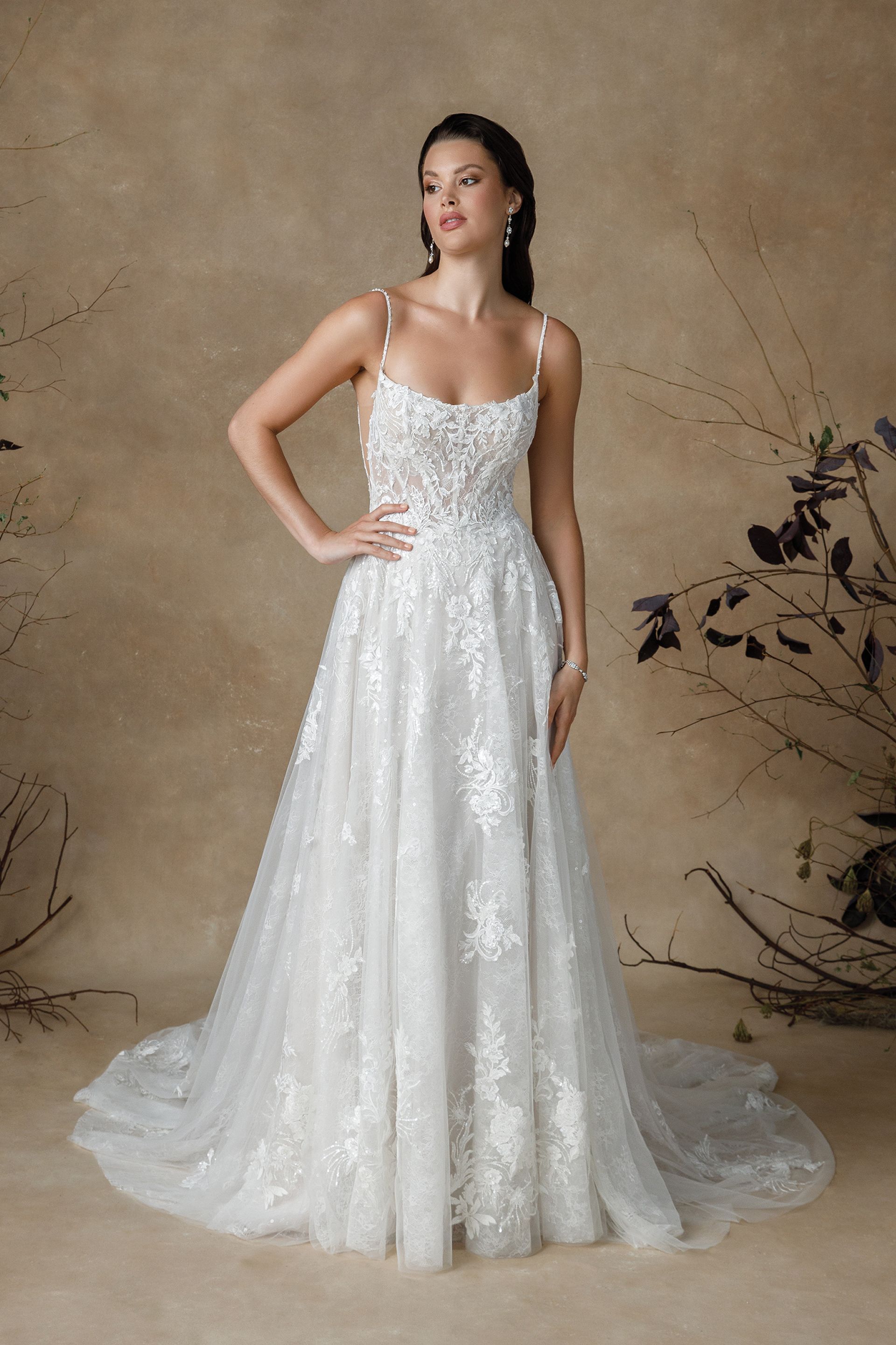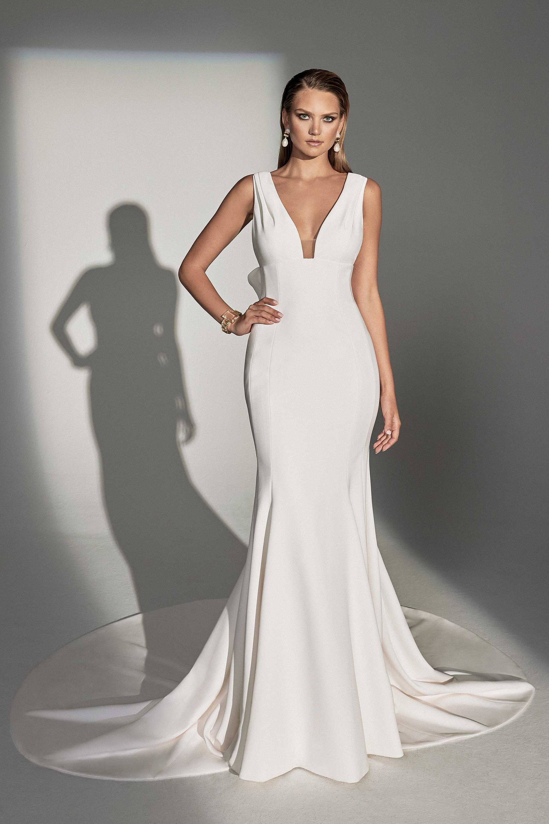 Silhouettes like fit and flare, ballgowns, A-line and mermaid. Fabrics of lace, tulle, satin, mikado, and crepe
