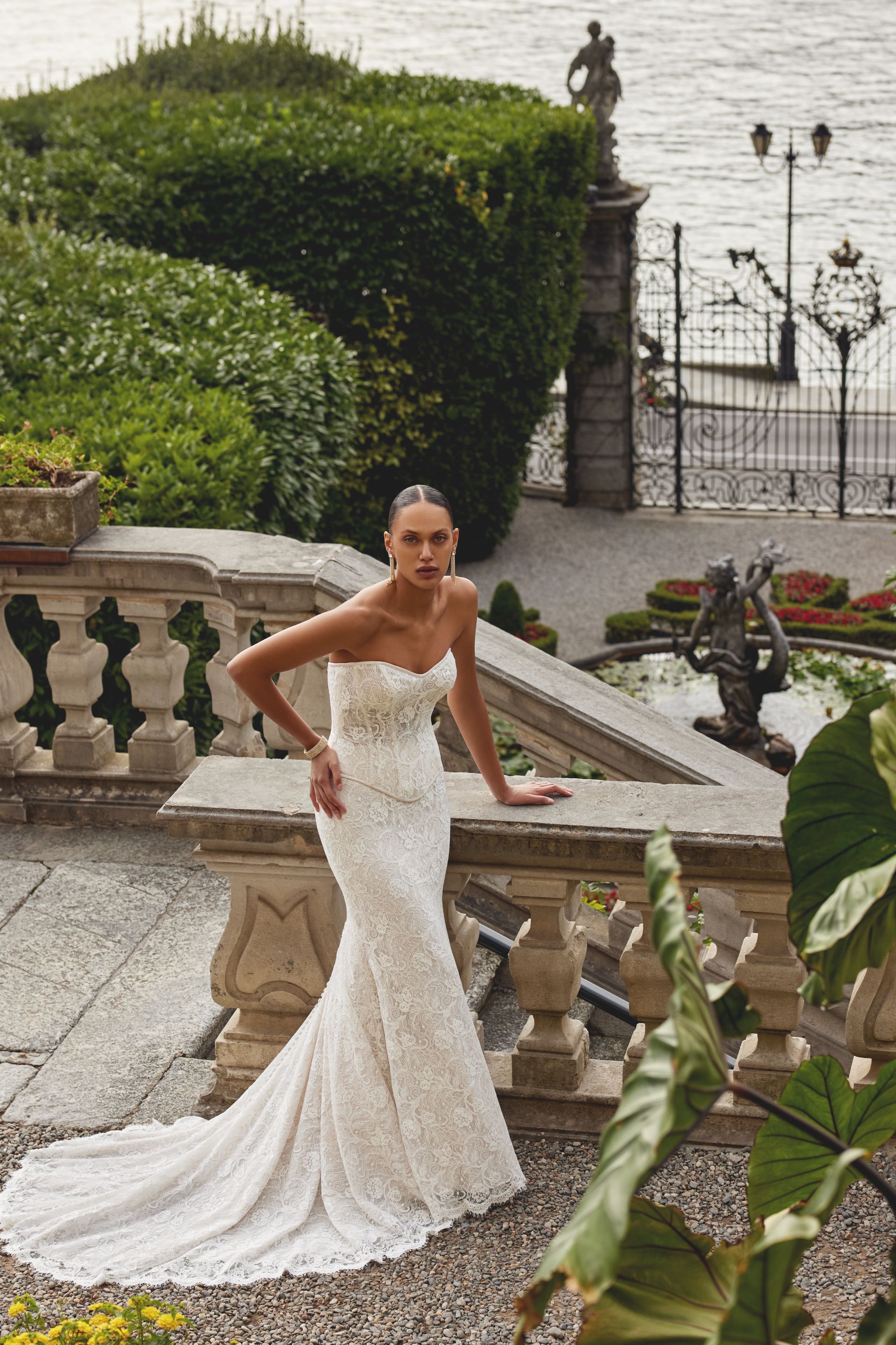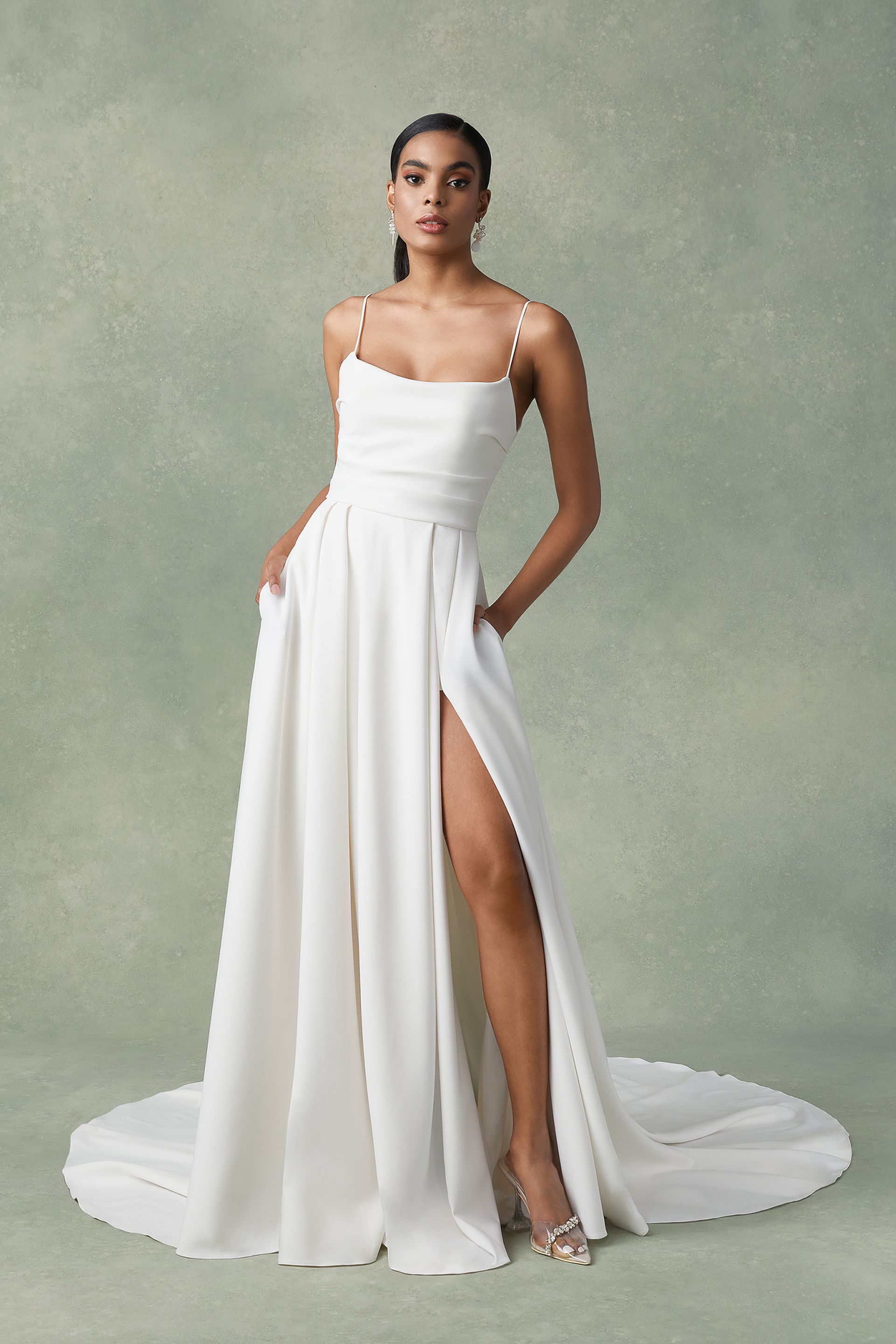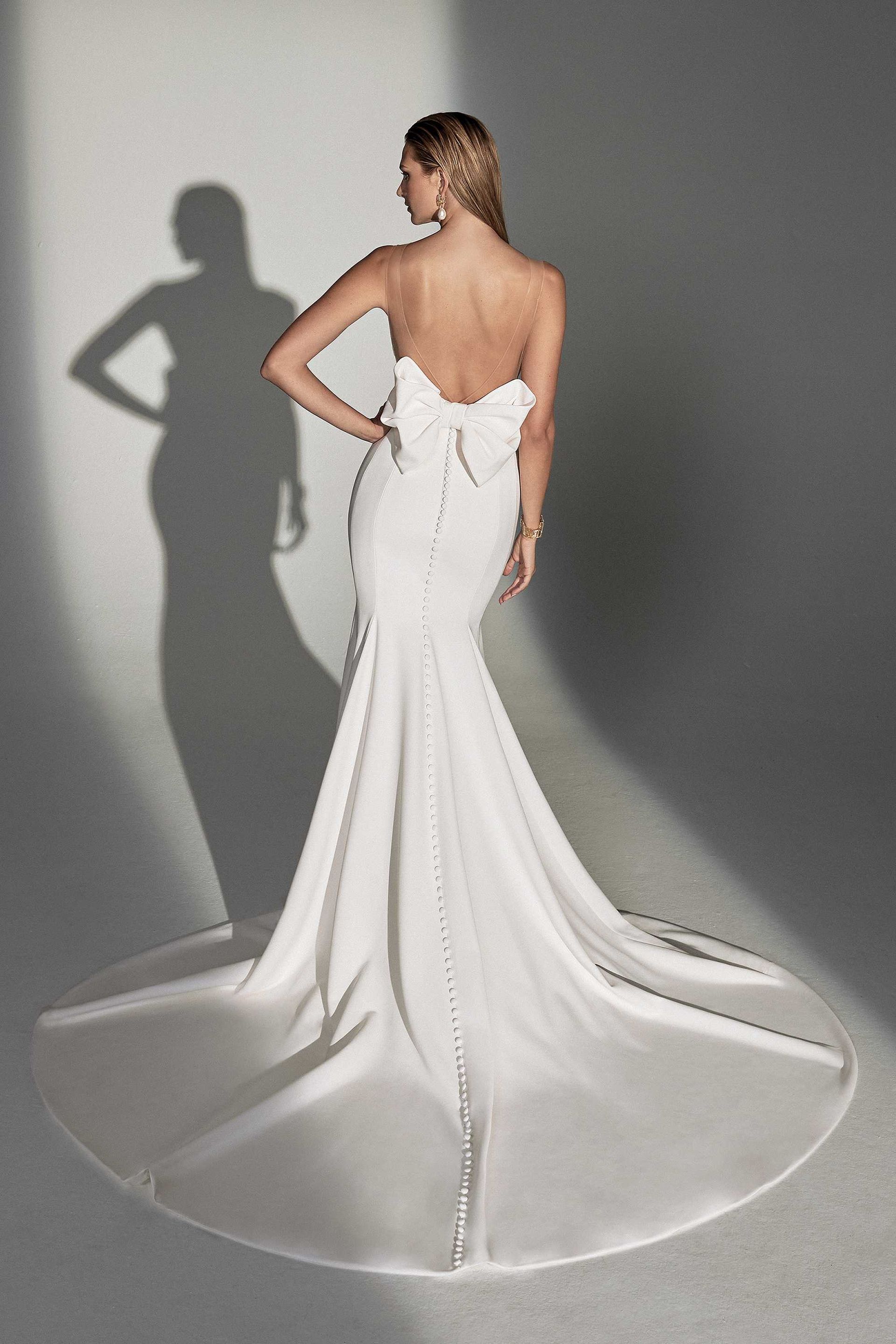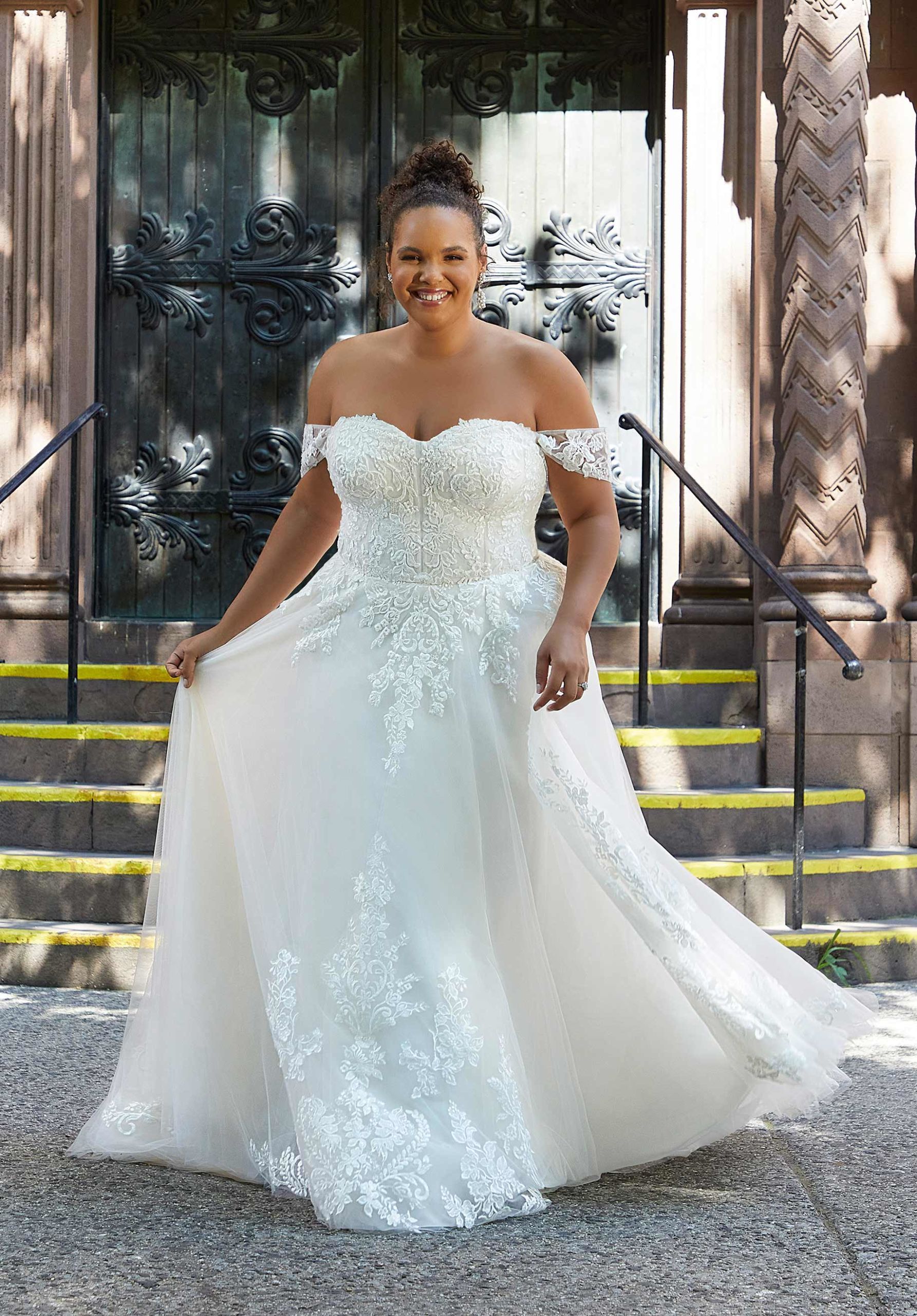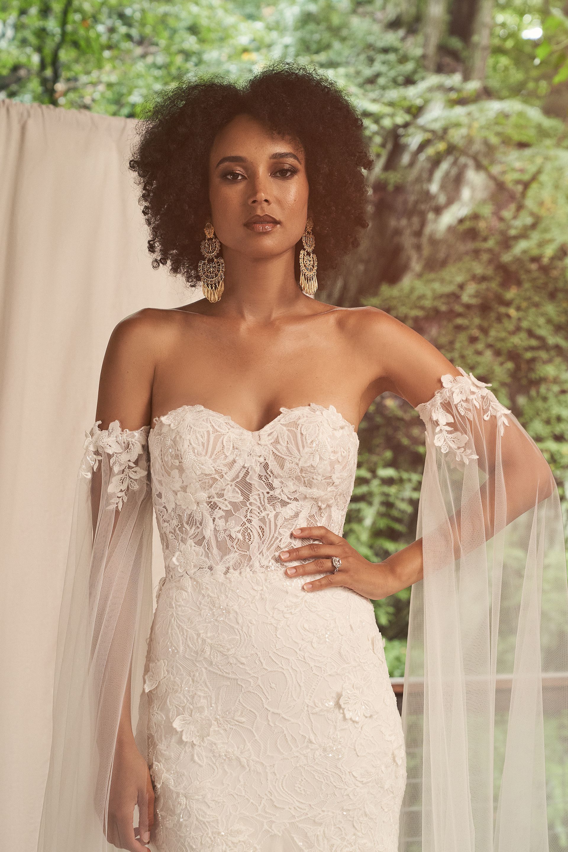 Silhouettes like fit and flare, ballgowns, A-line and mermaid. Fabrics of lace, tulle, satin, mikado, and crepe