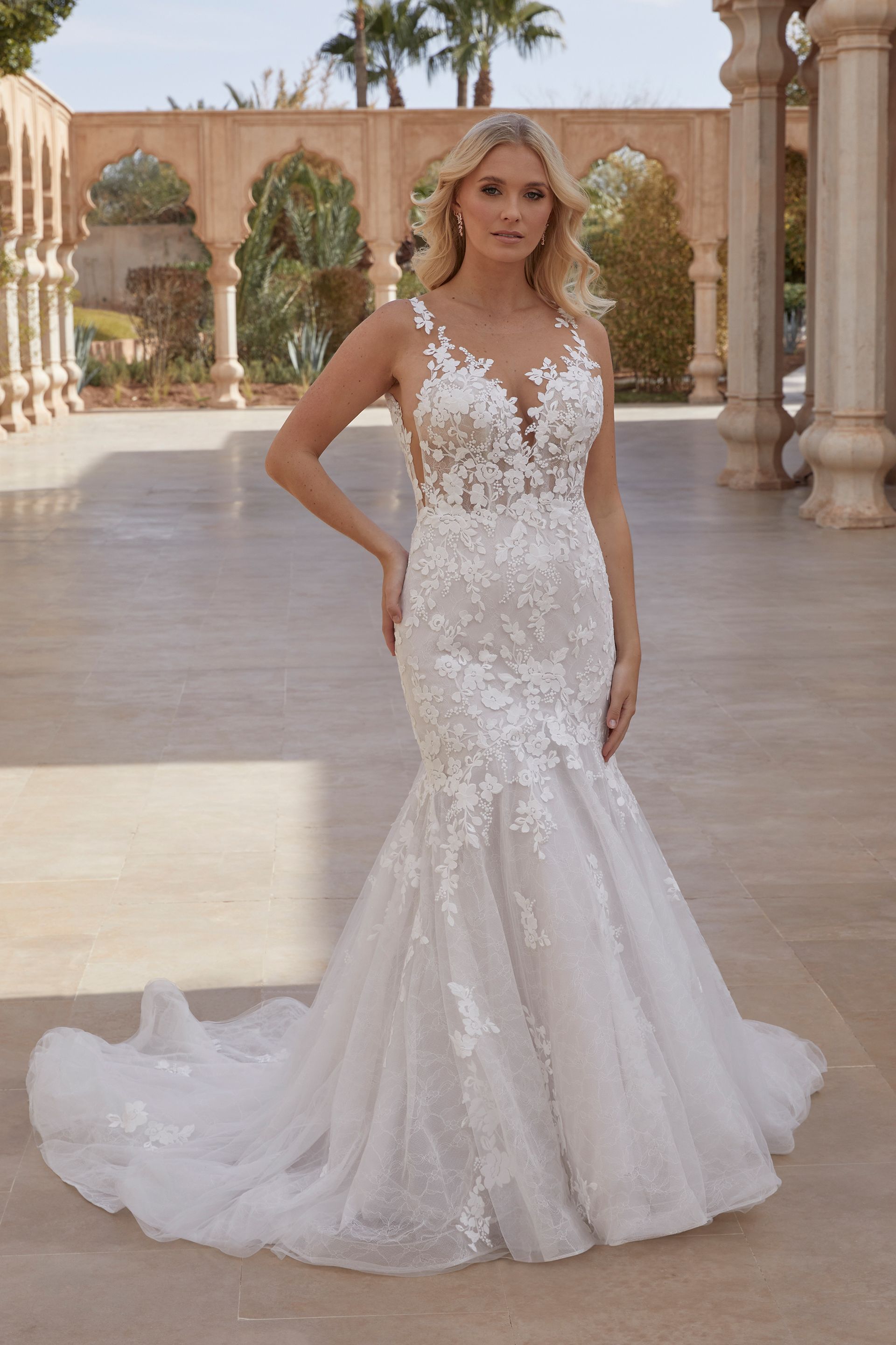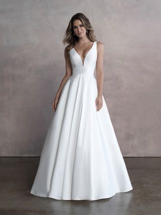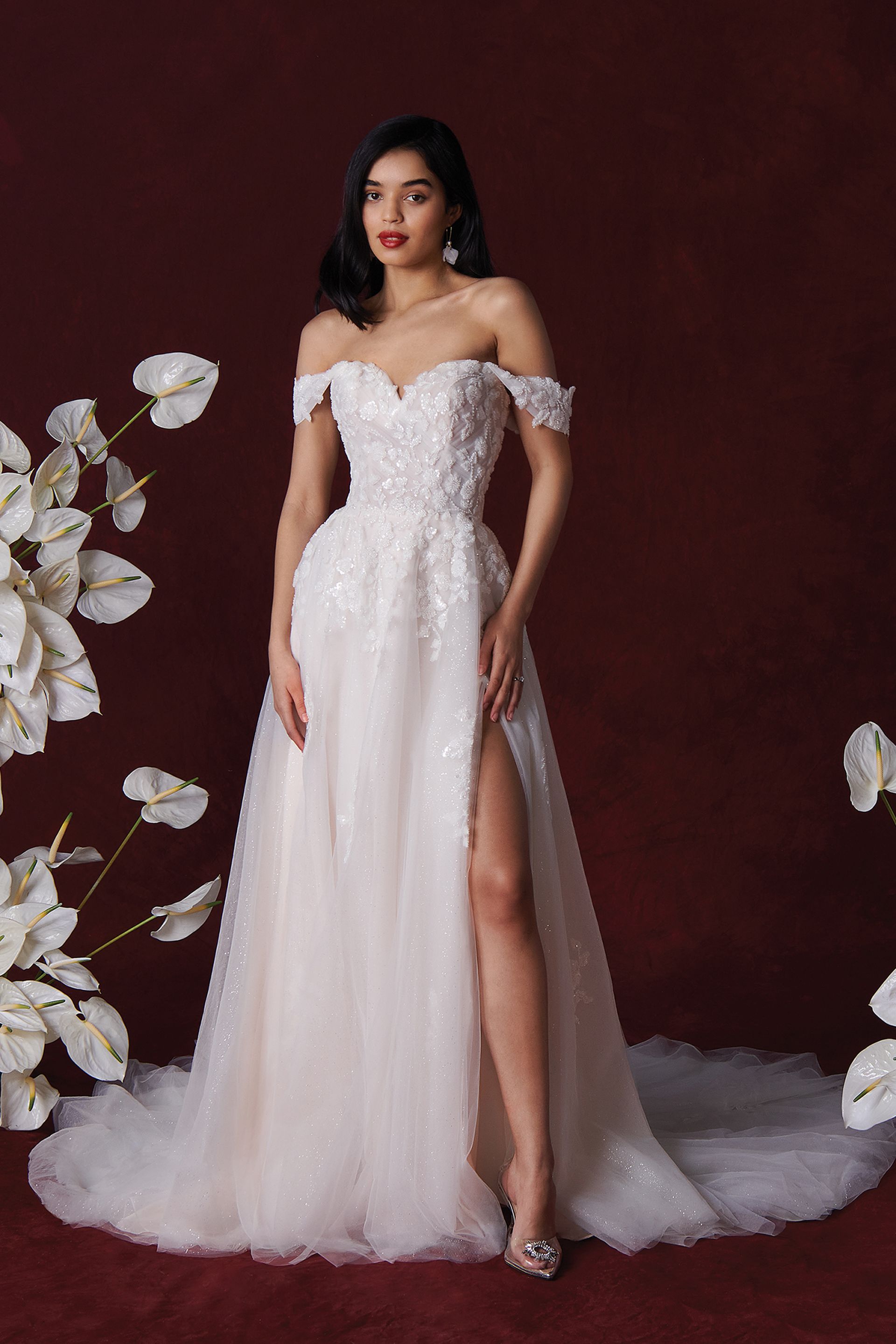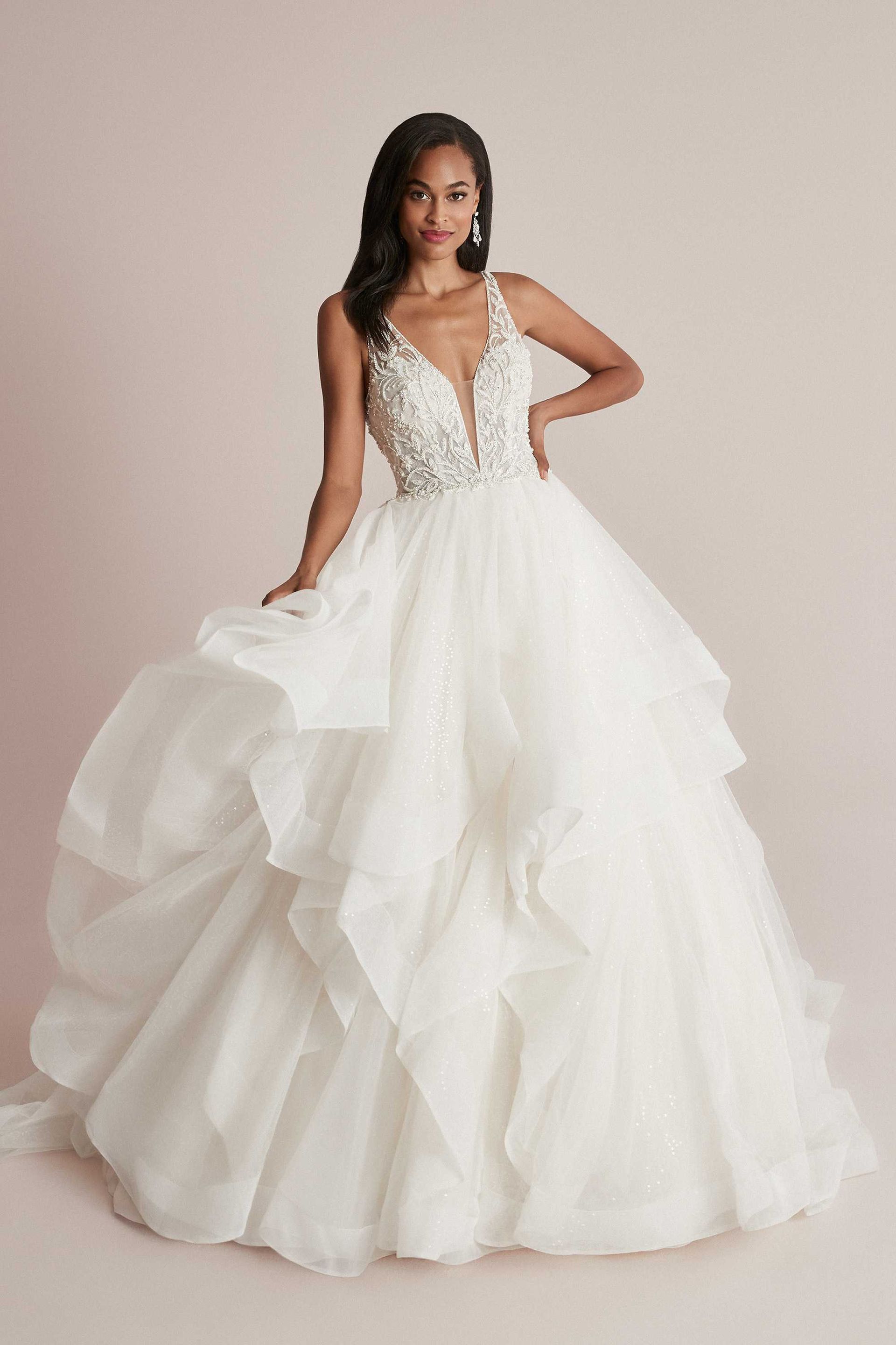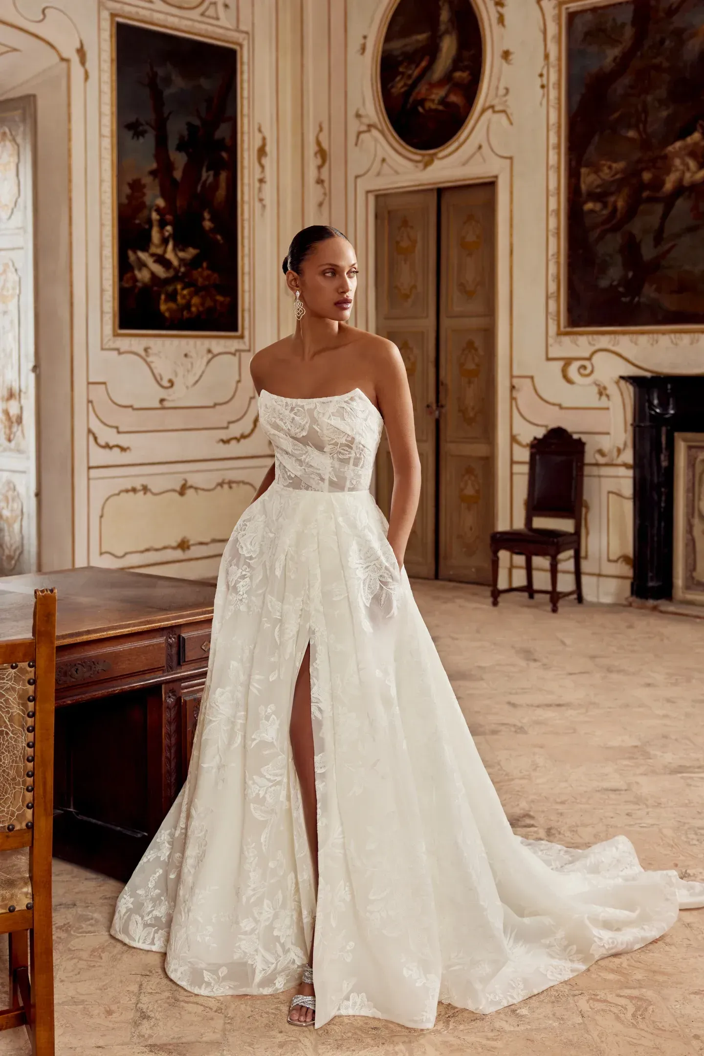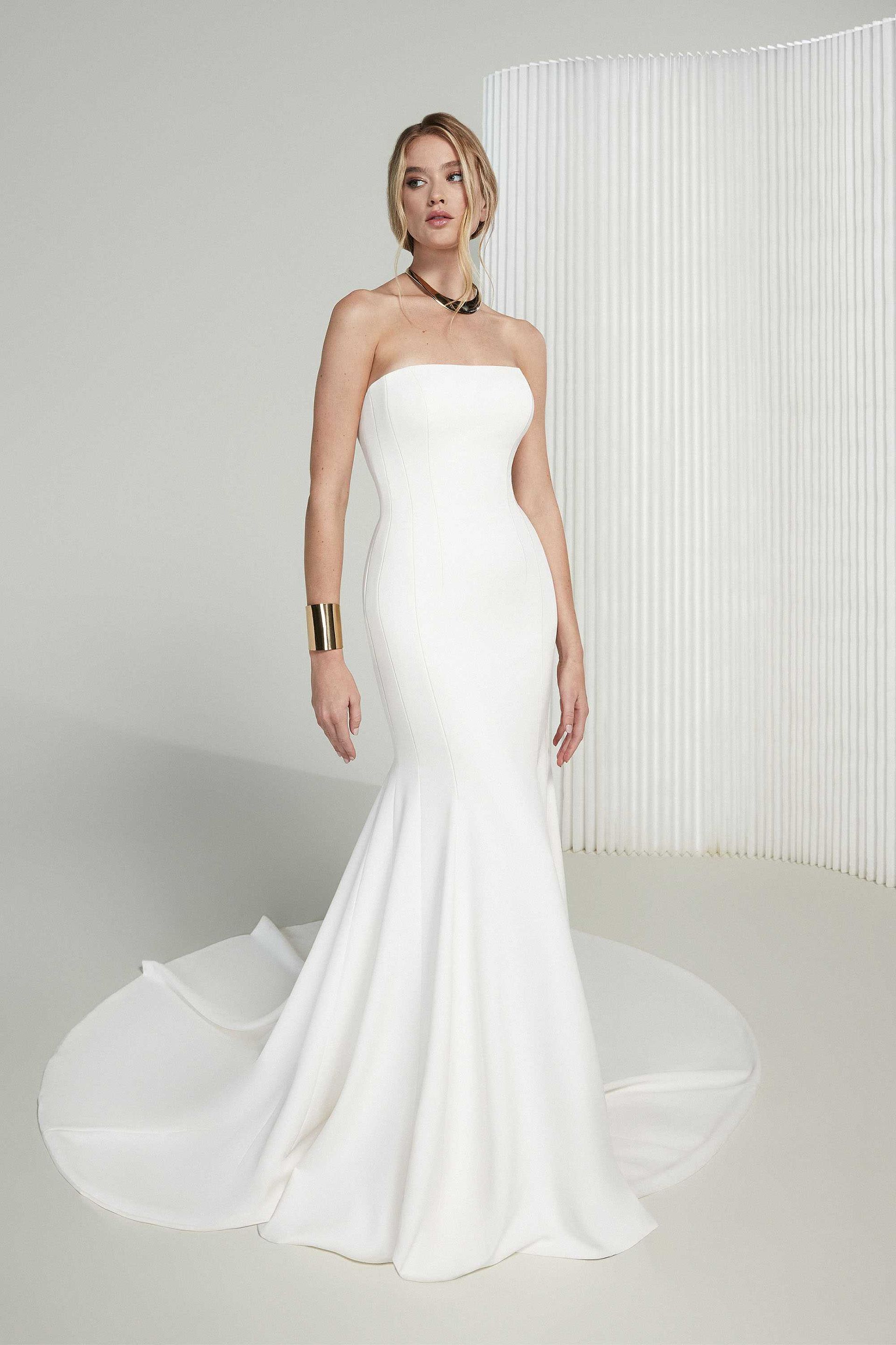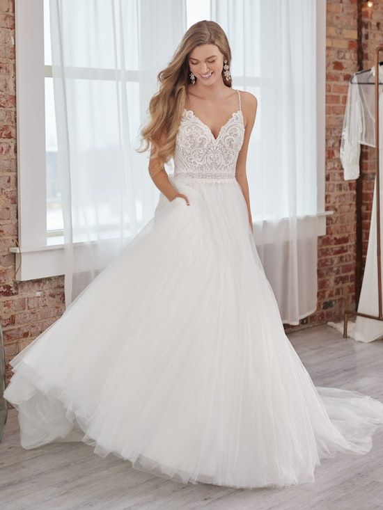 Silhouettes like fit and flare, ballgowns, A-line and mermaid. Fabrics of lace, tulle, satin, mikado, and crepe