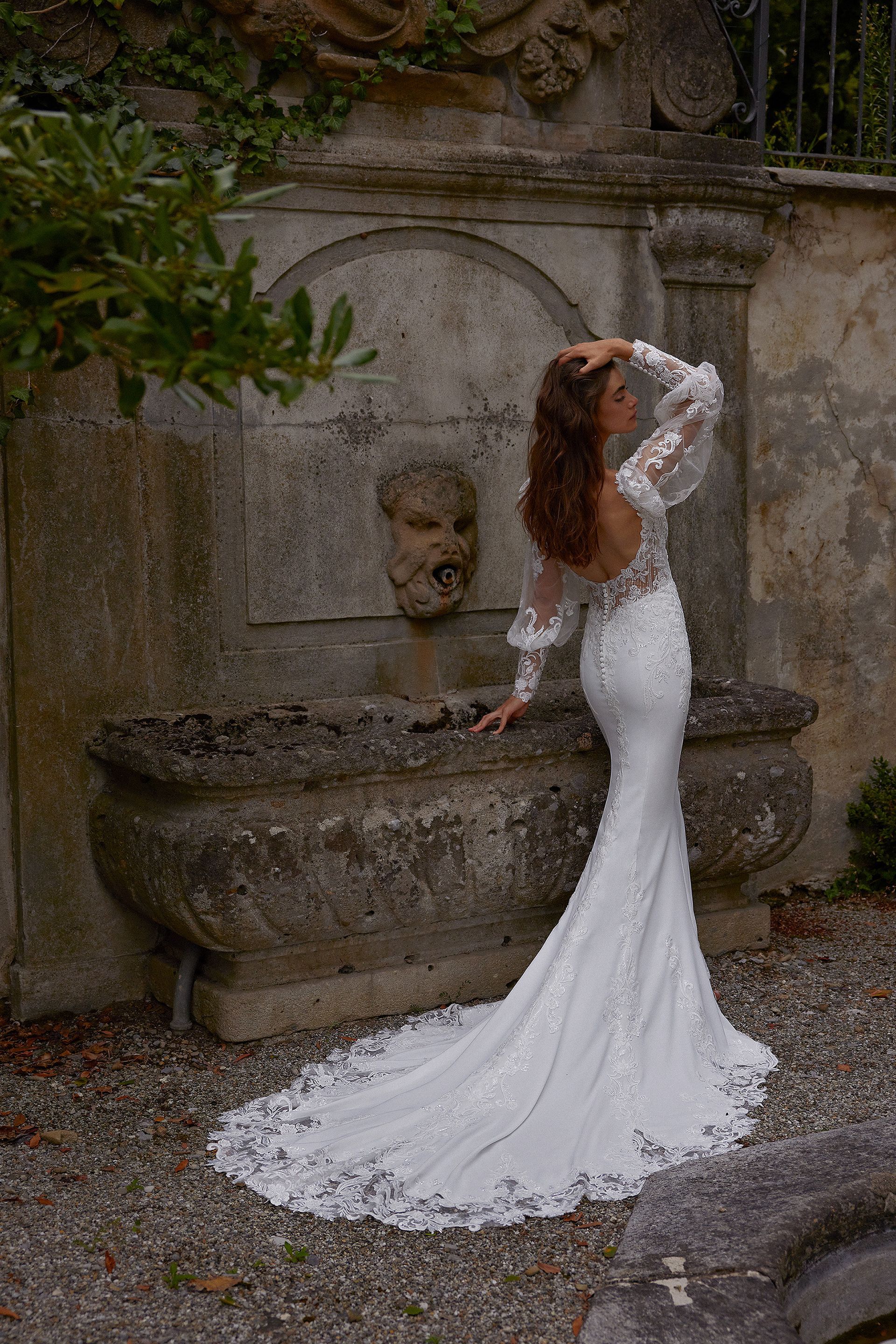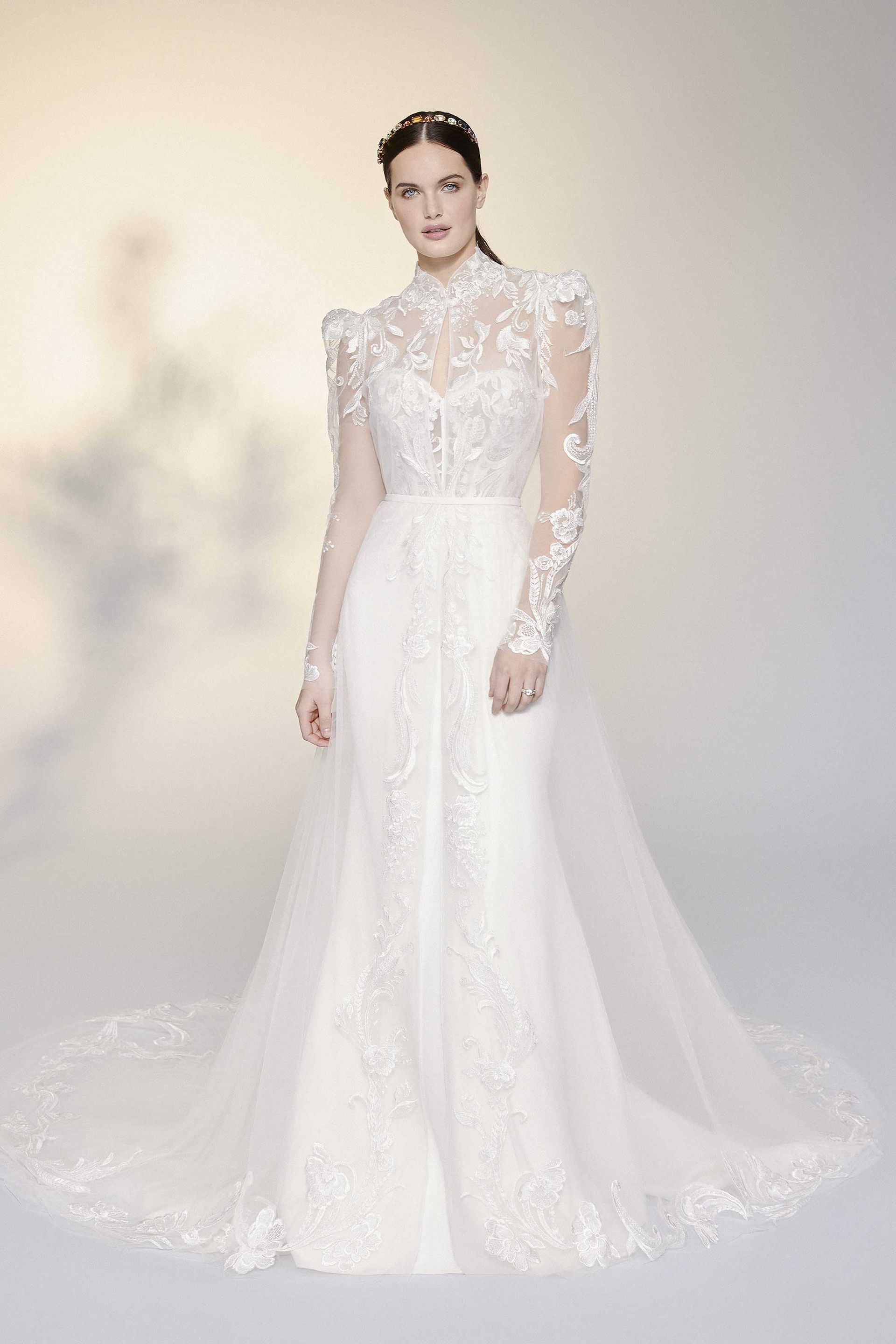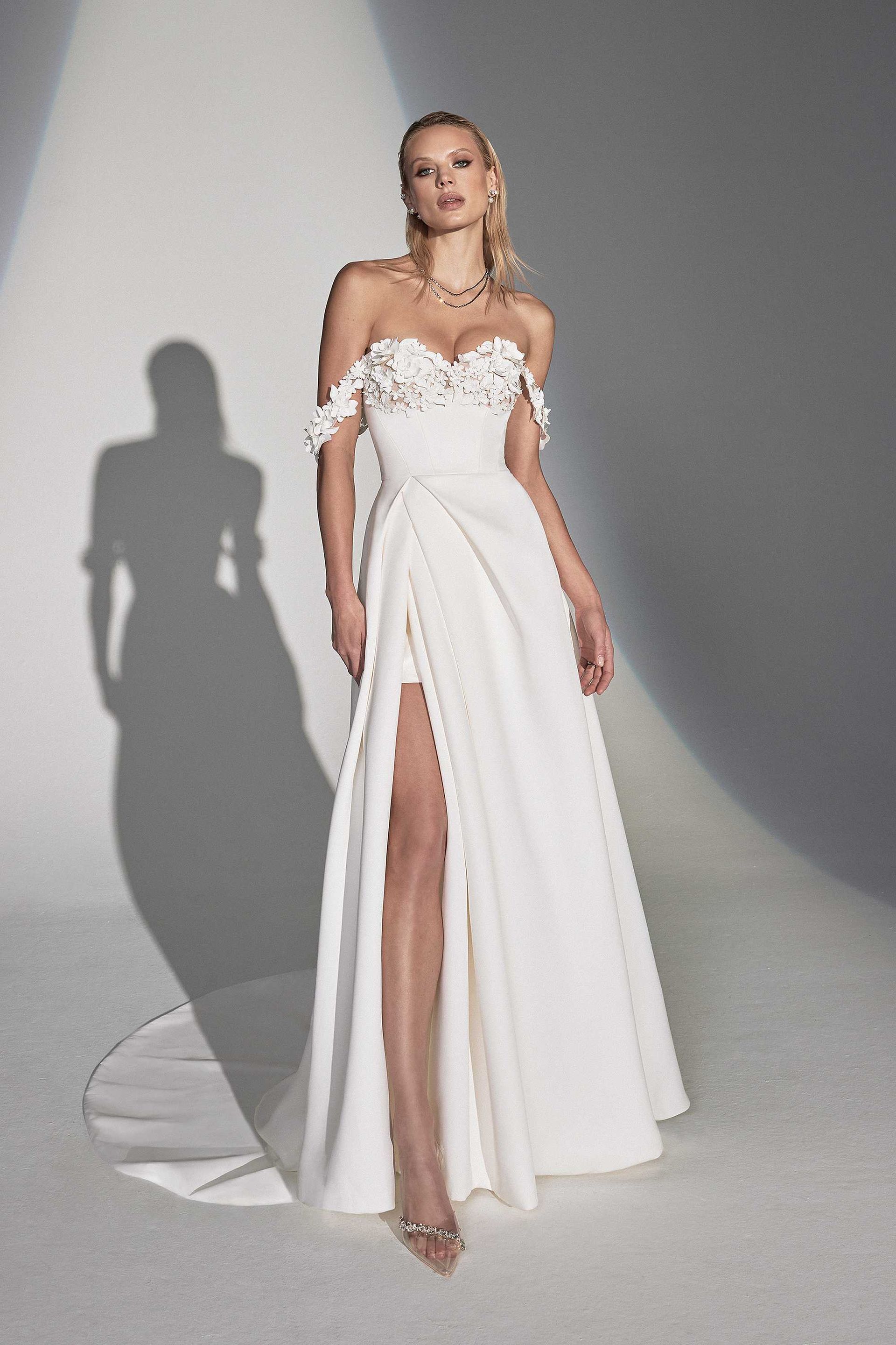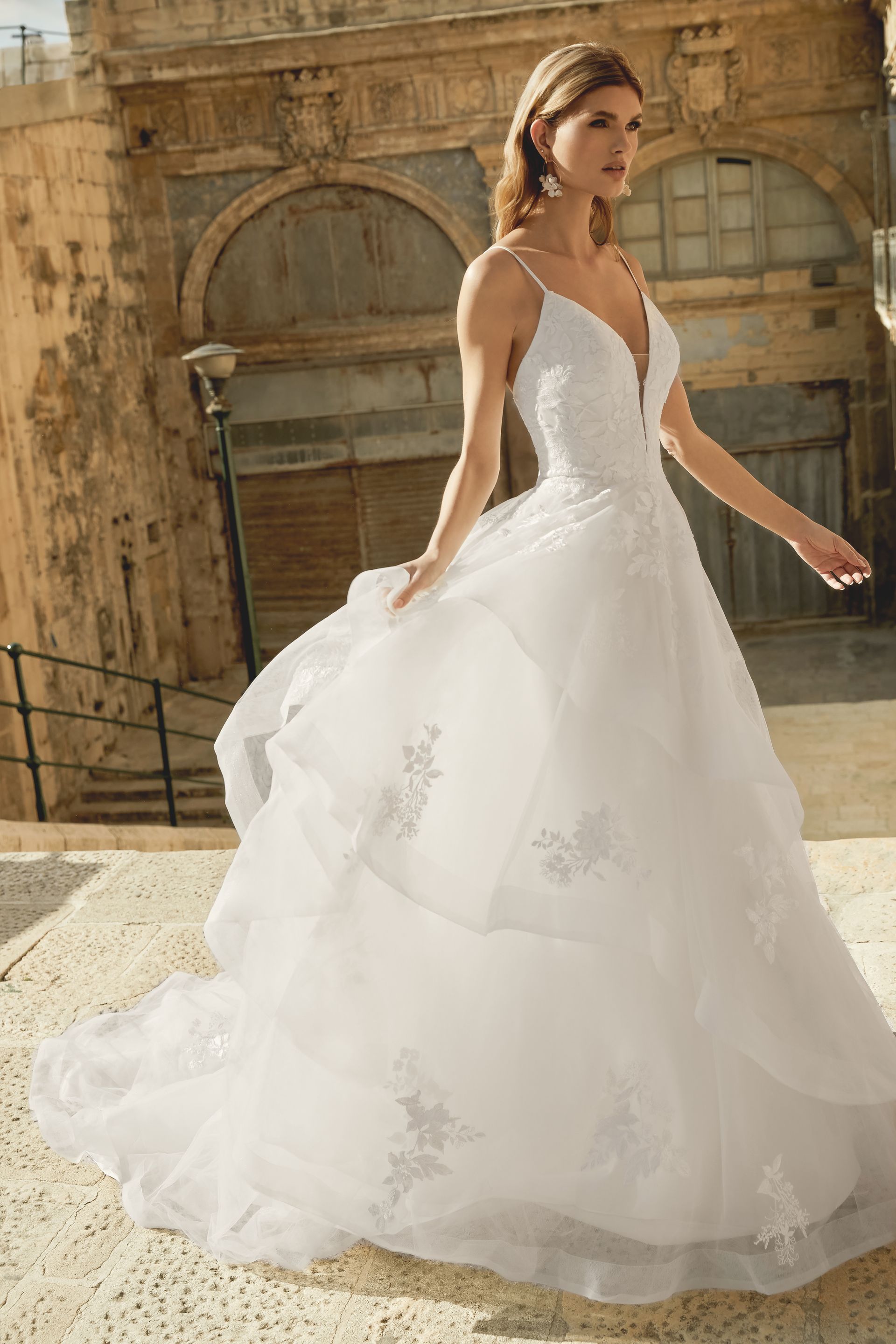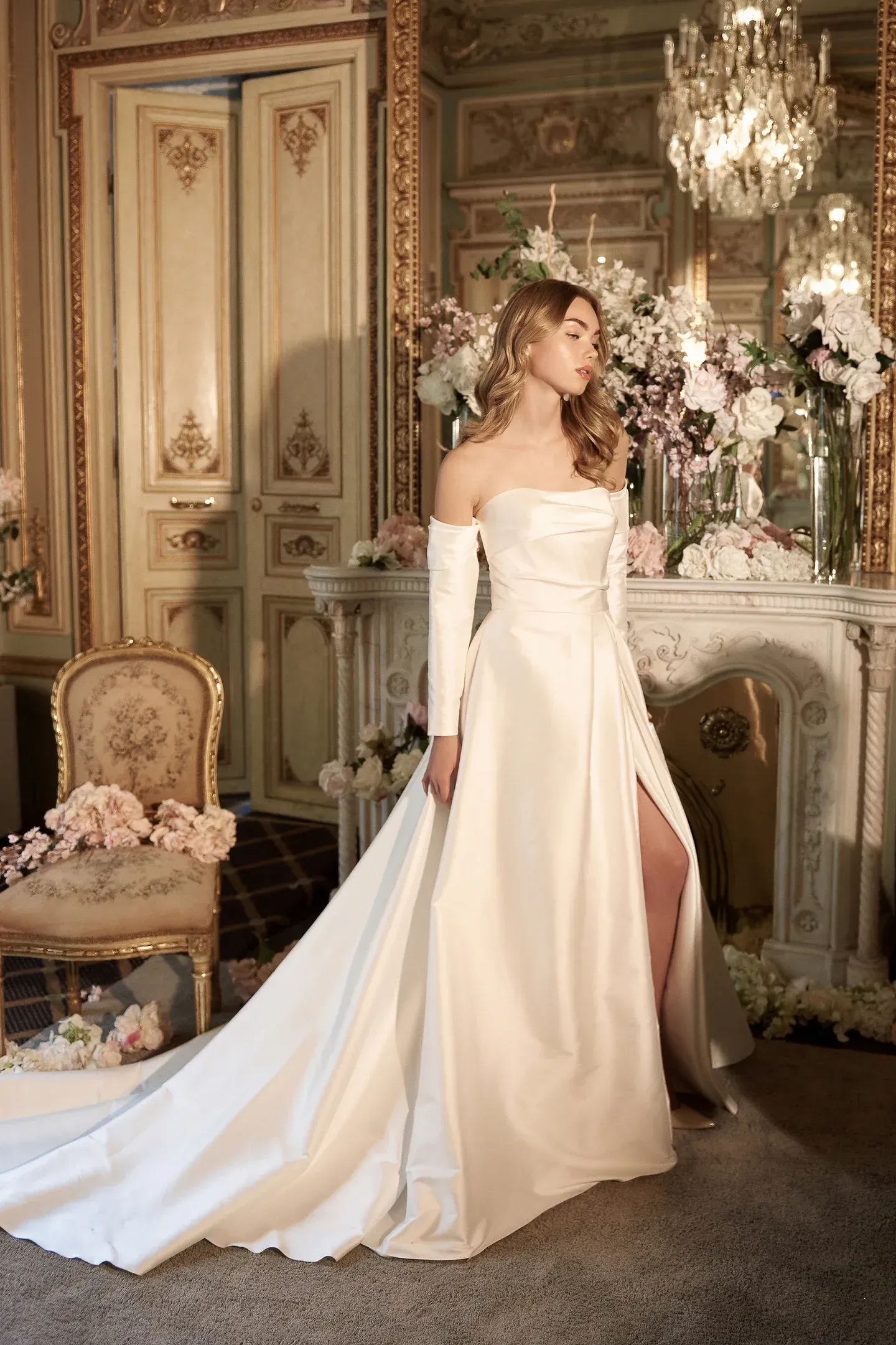 Silhouettes like fit and flare, ballgowns, A-line and mermaid. Fabrics of lace, tulle, satin, mikado, and crepe