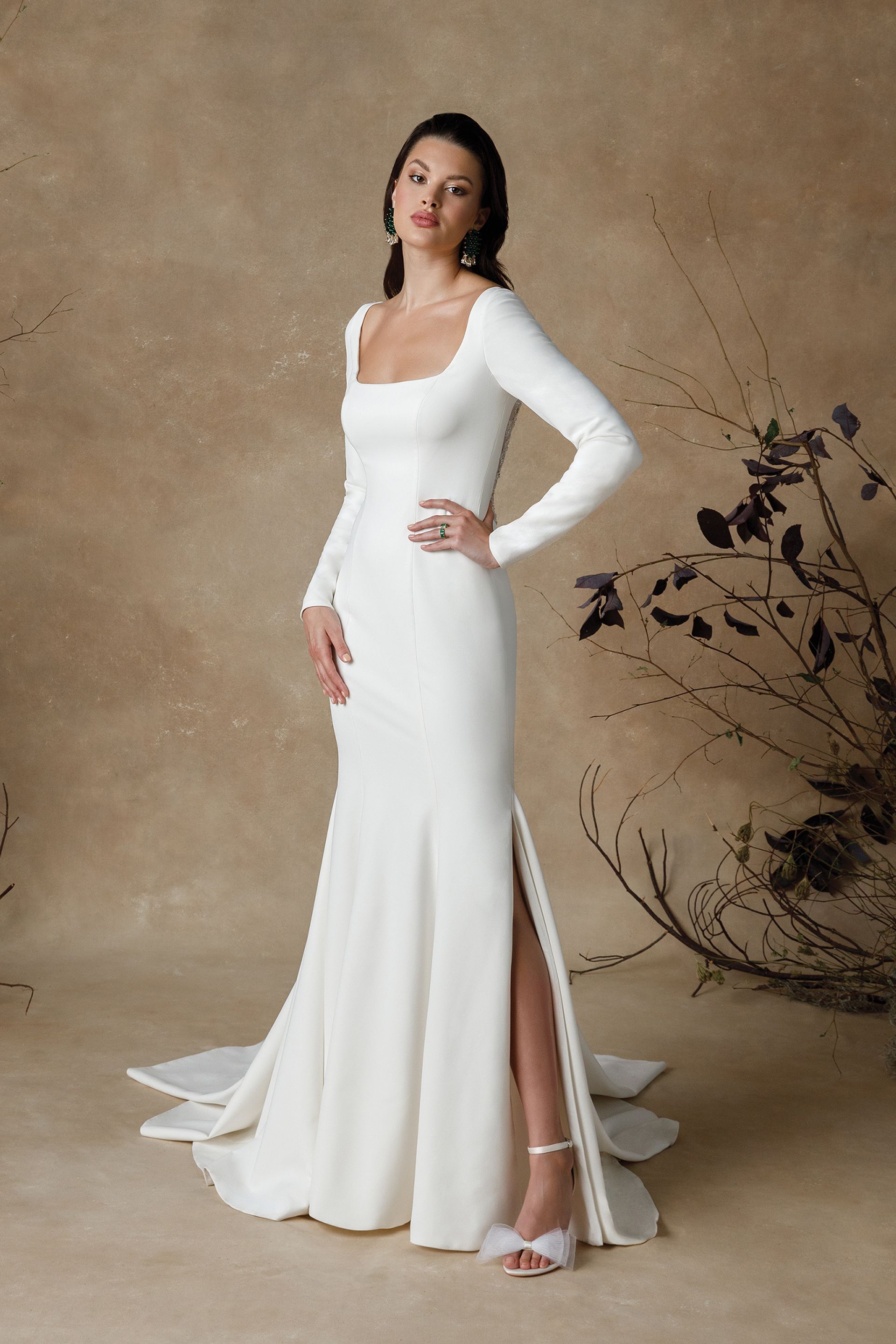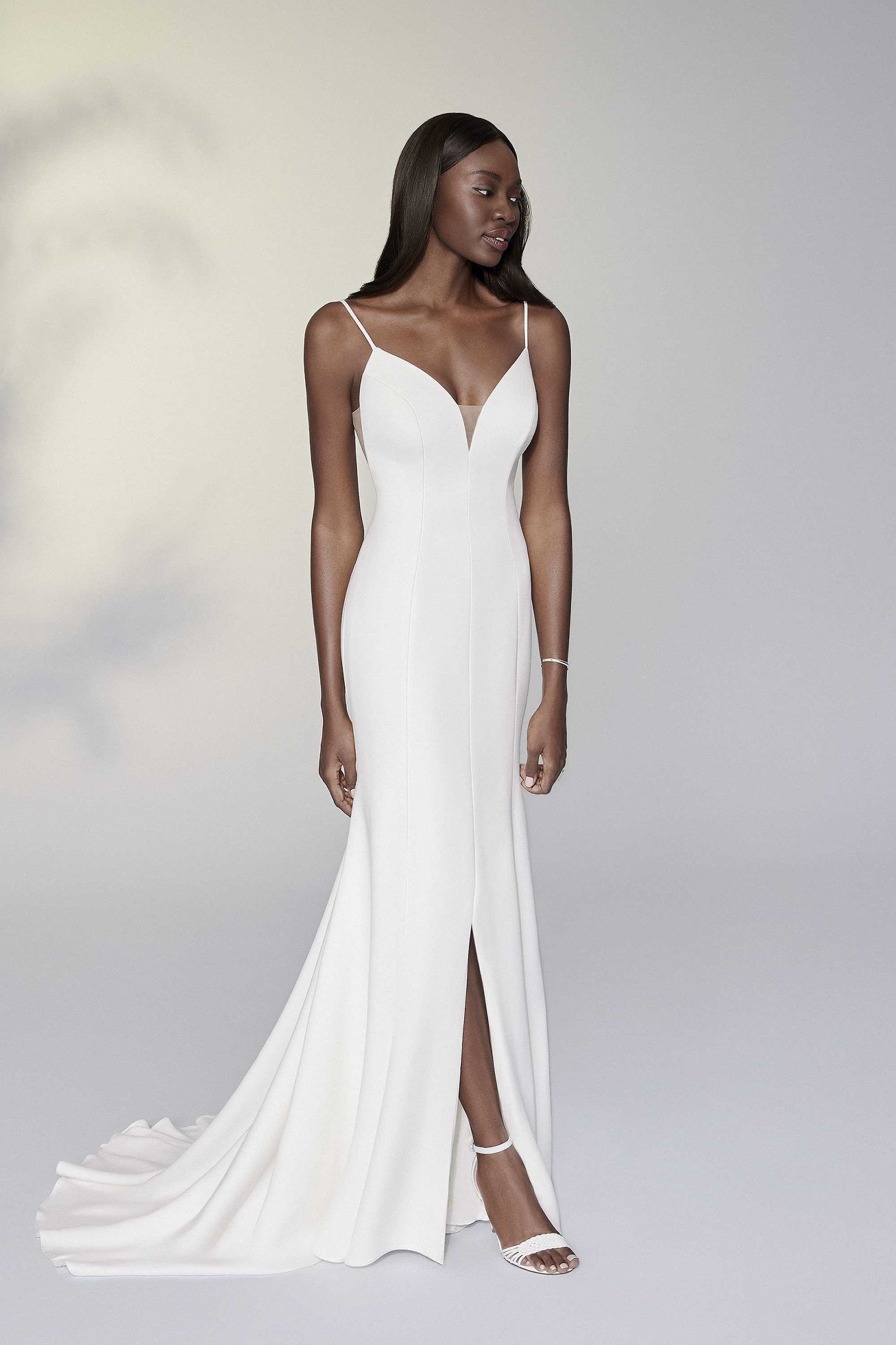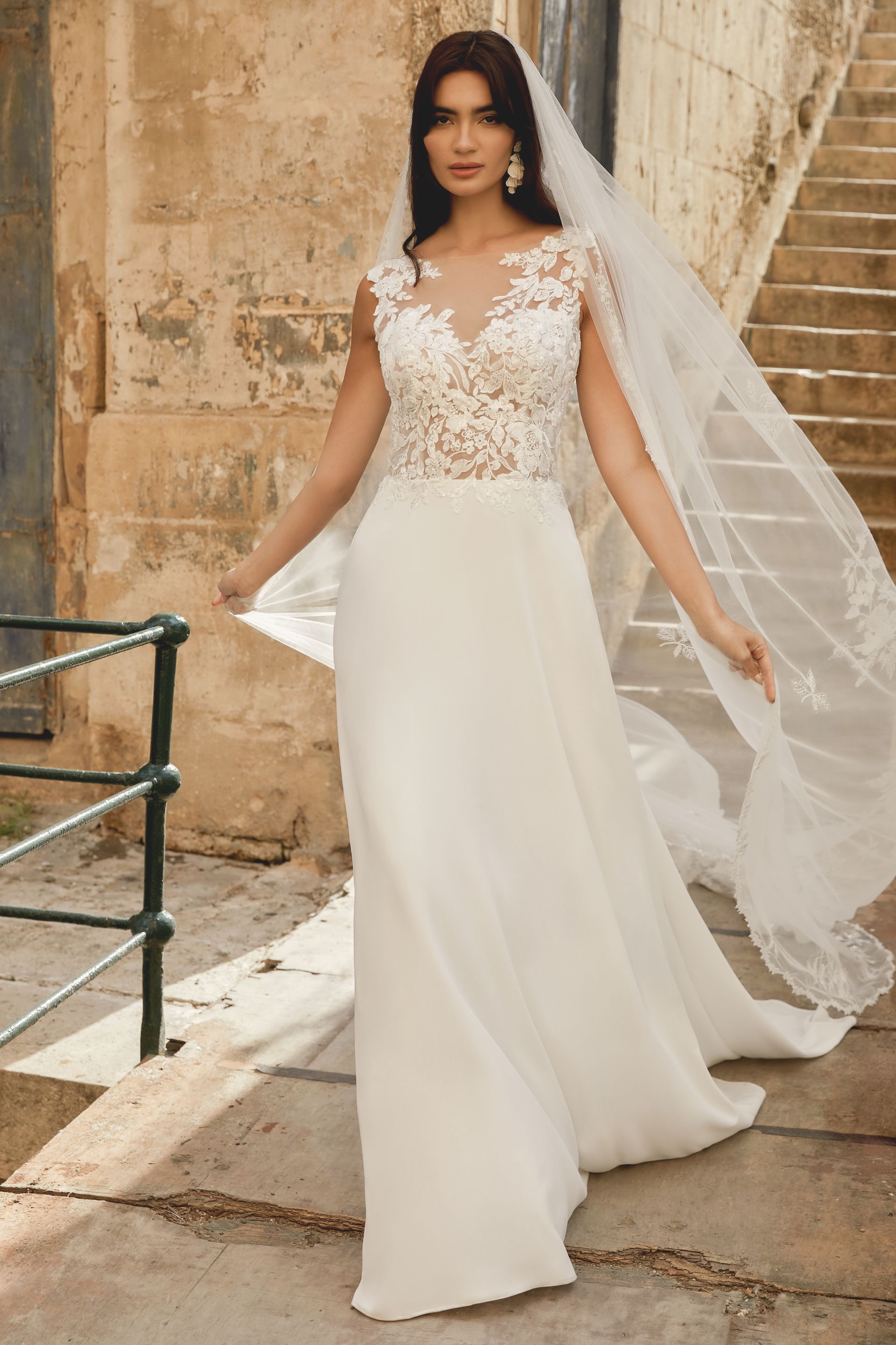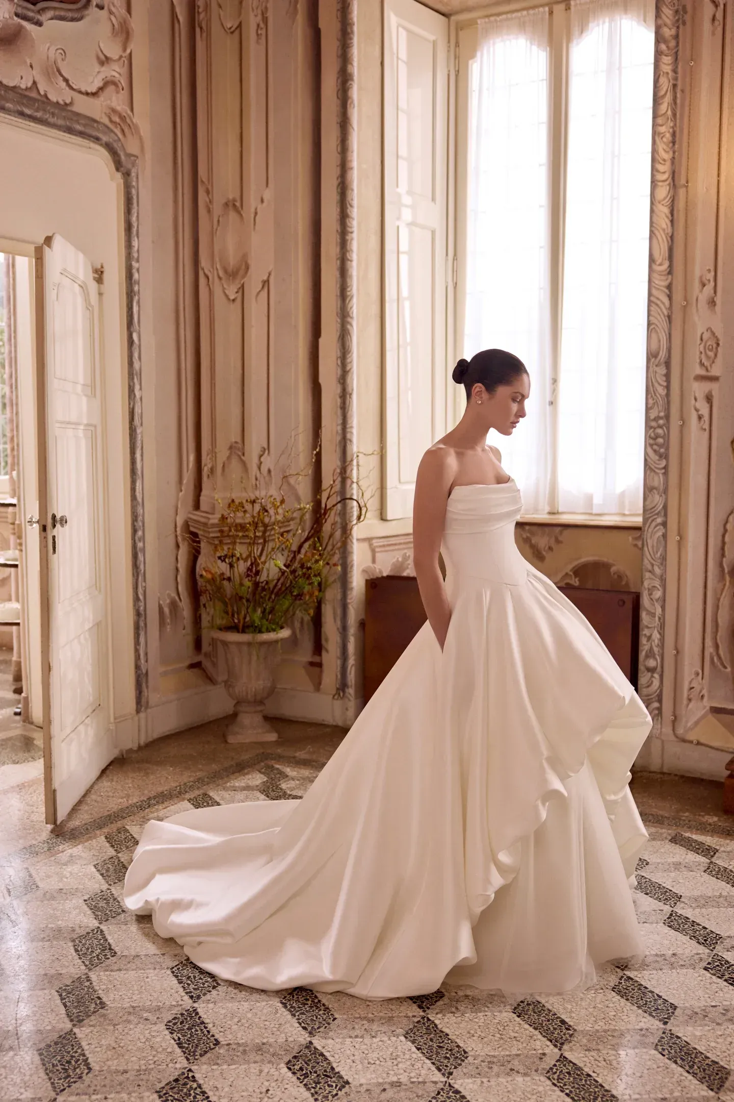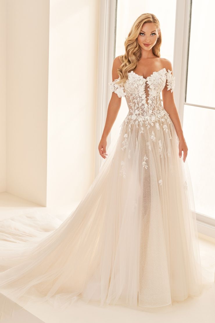 Silhouettes like fit and flare, ballgowns, A-line and mermaid. Fabrics of lace, tulle, satin, mikado, and crepe