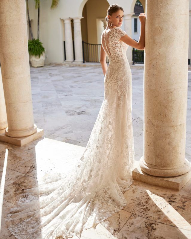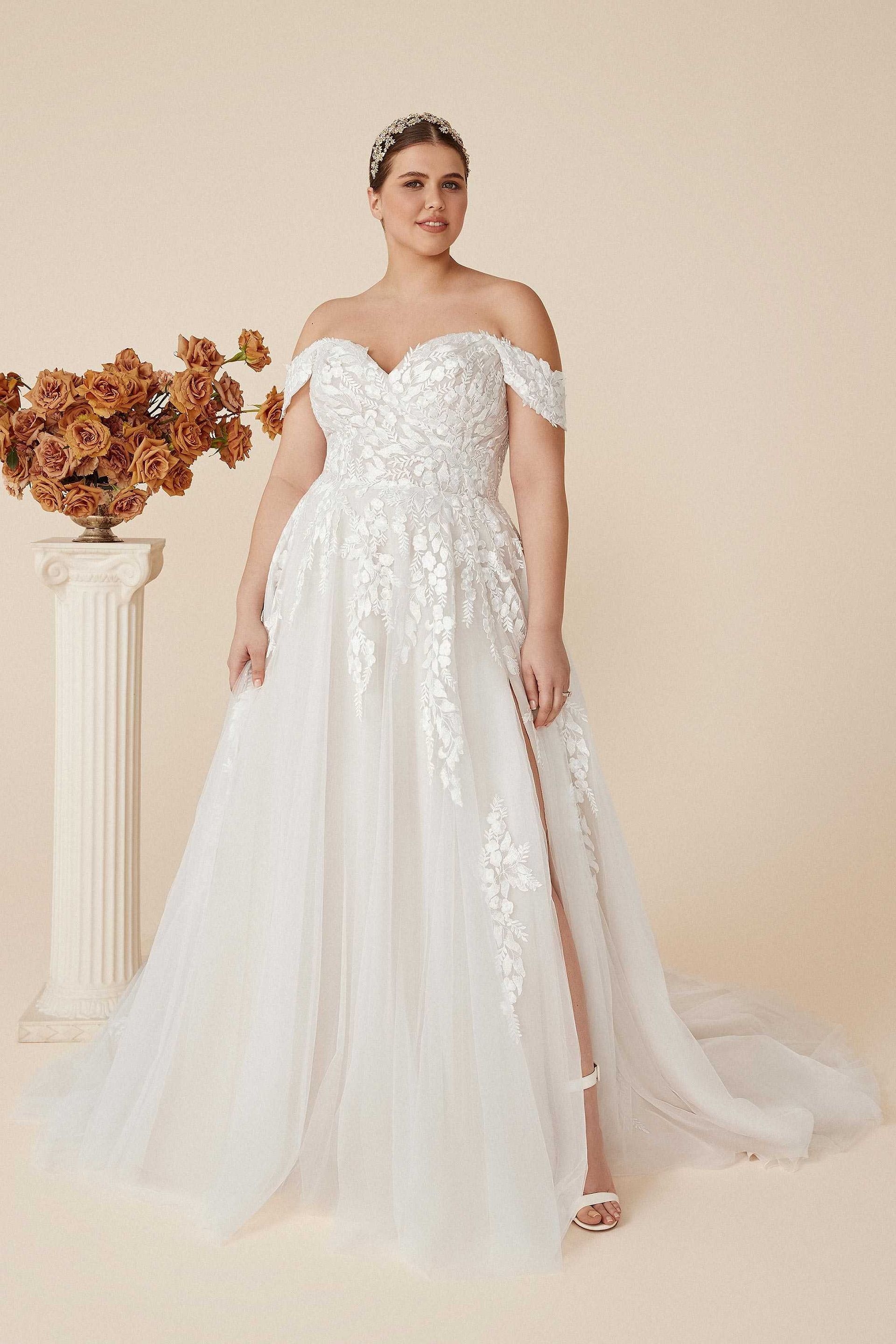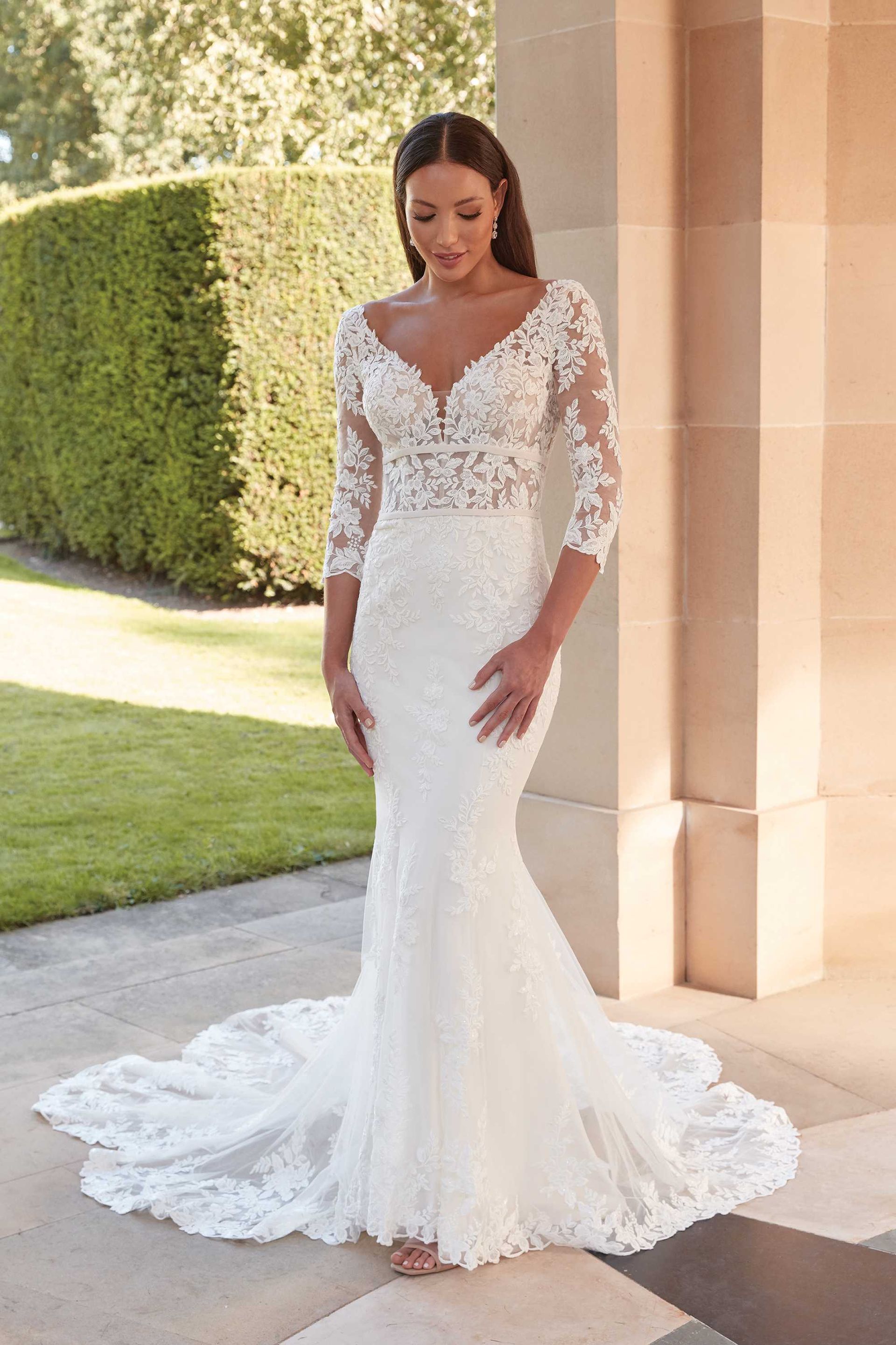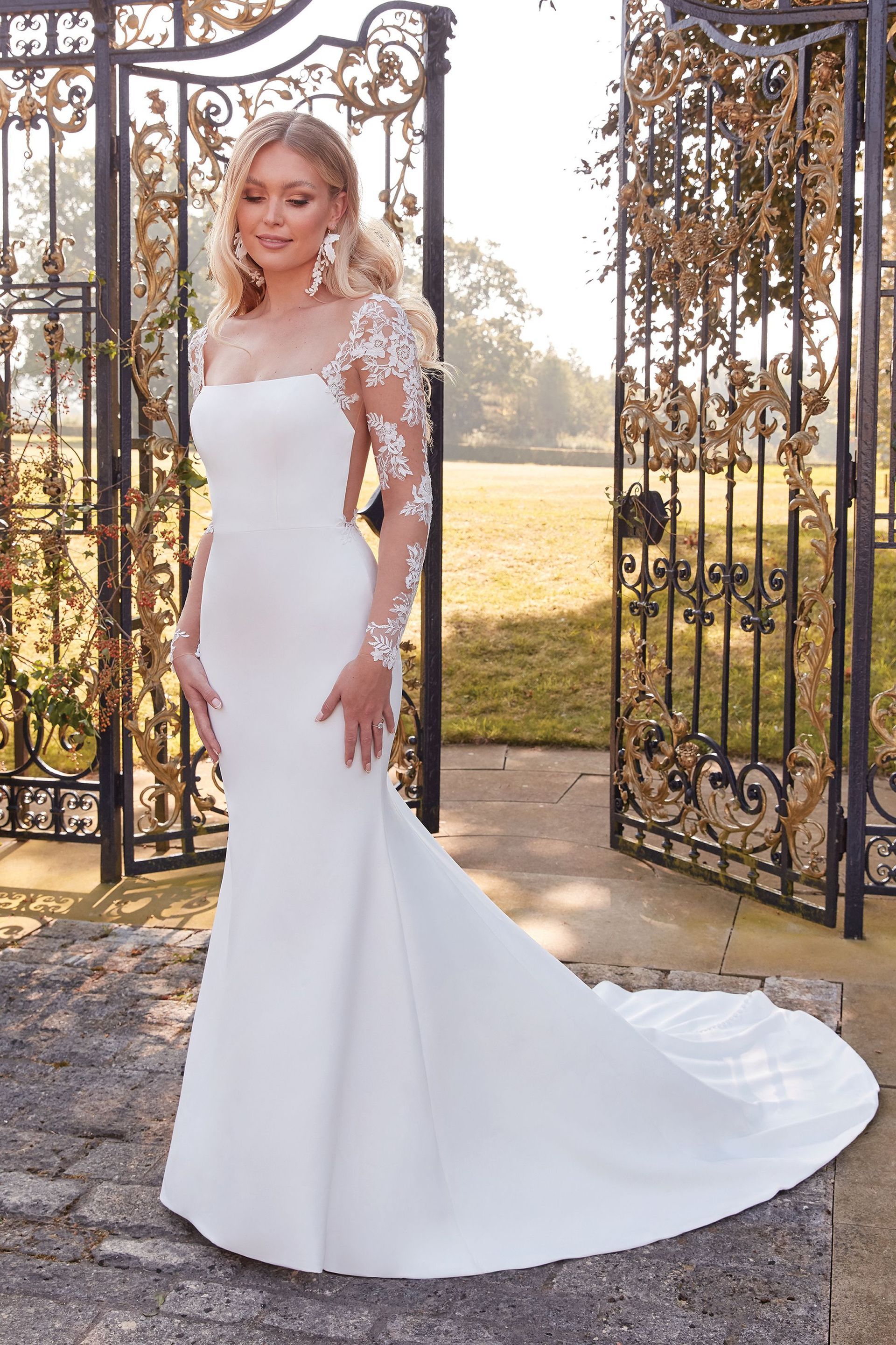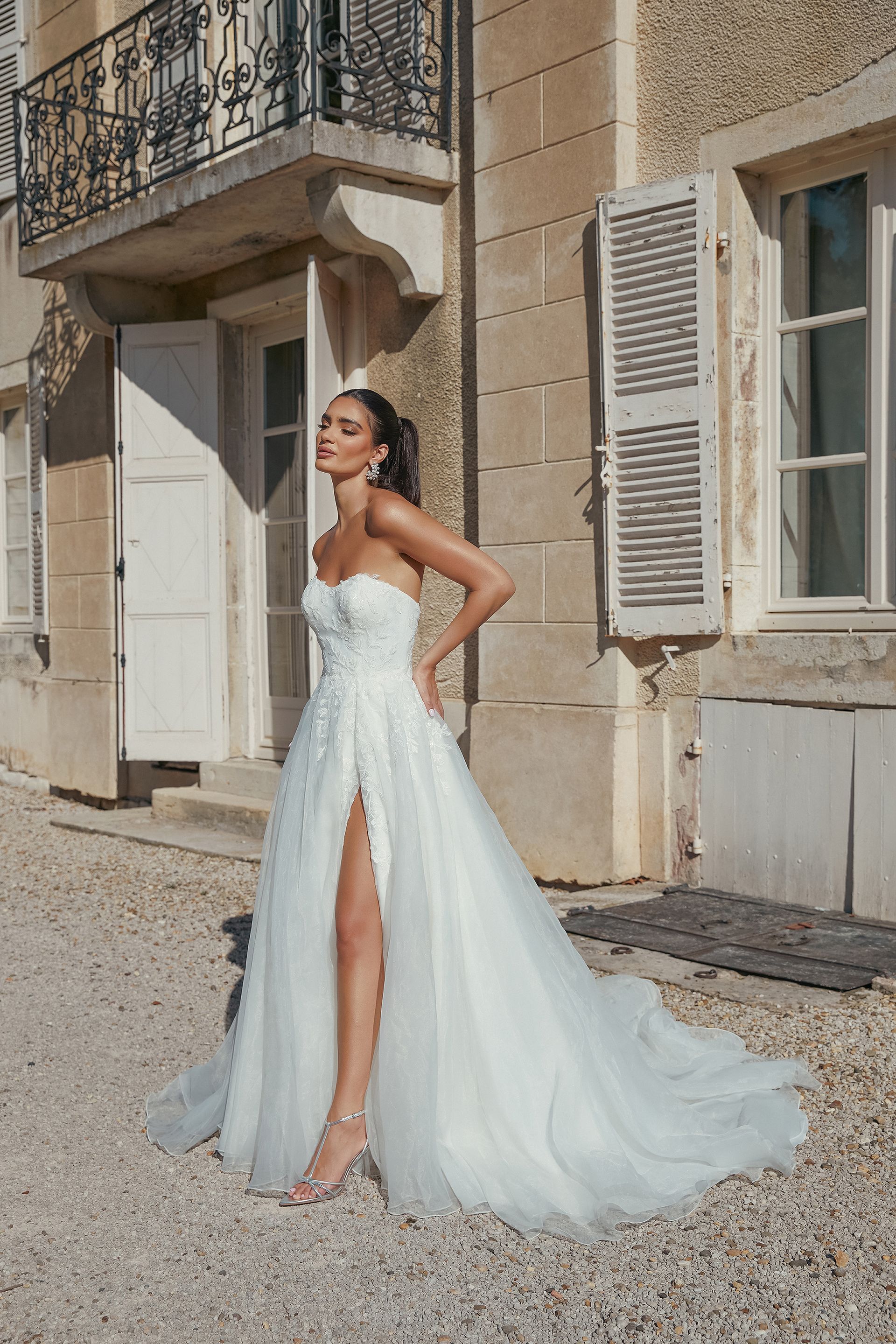 Silhouettes like fit and flare, ballgowns, A-line and mermaid. Fabrics of lace, tulle, satin, mikado, and crepe