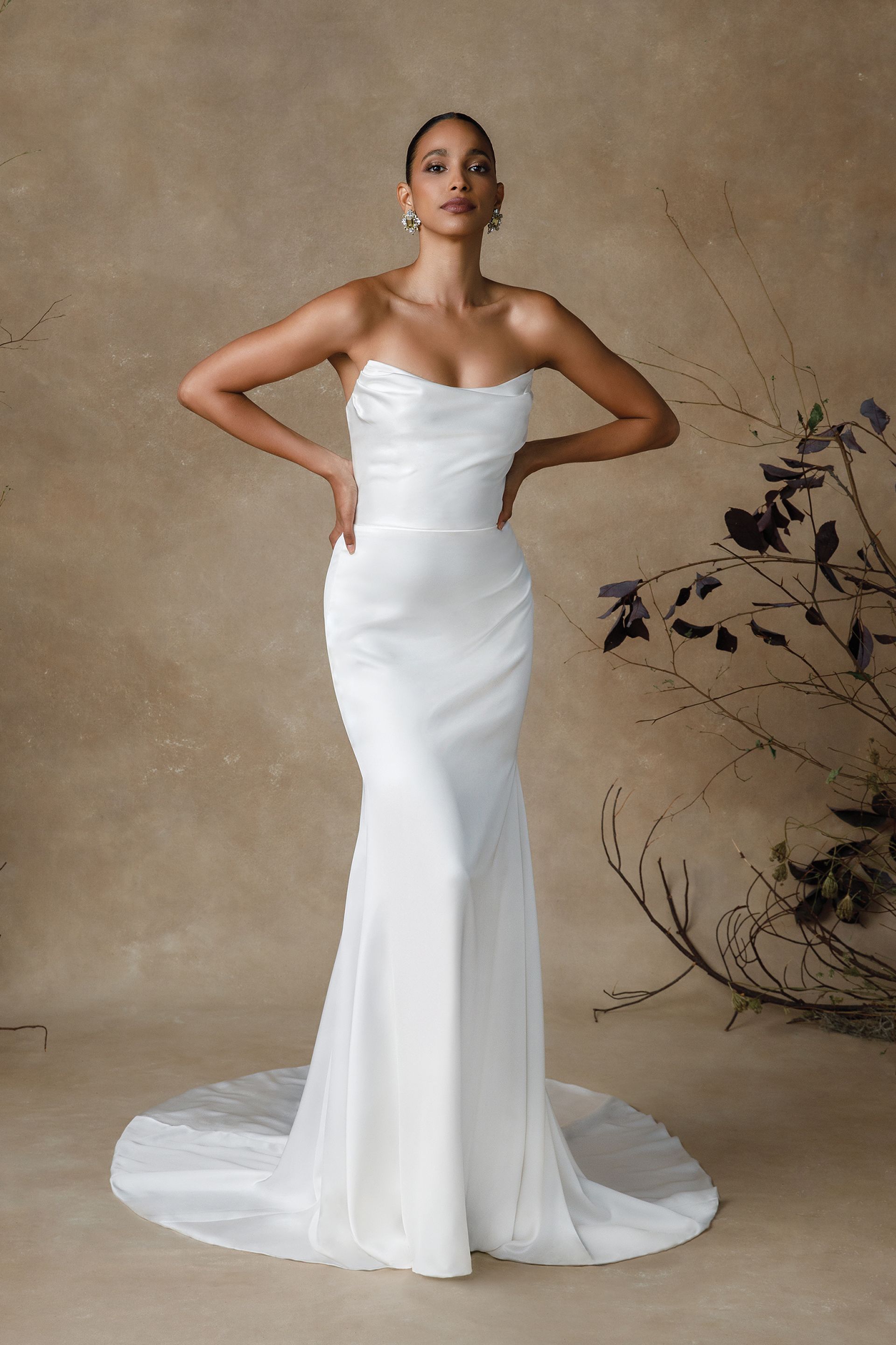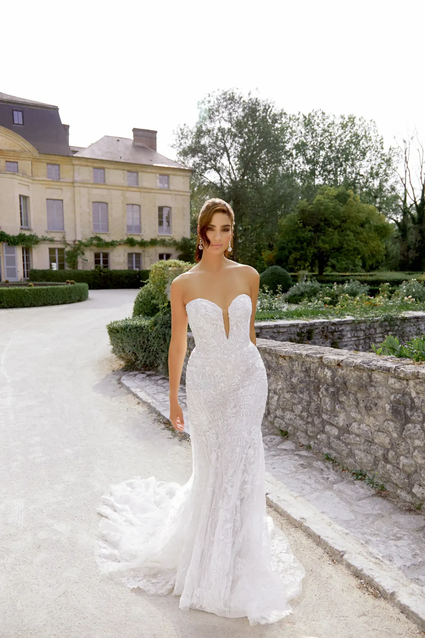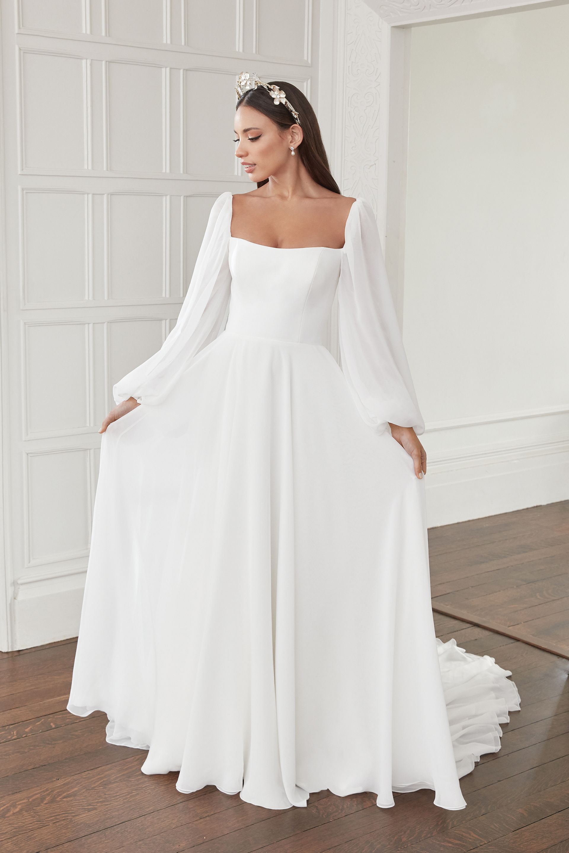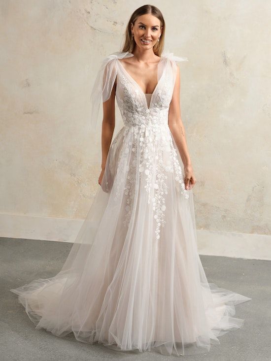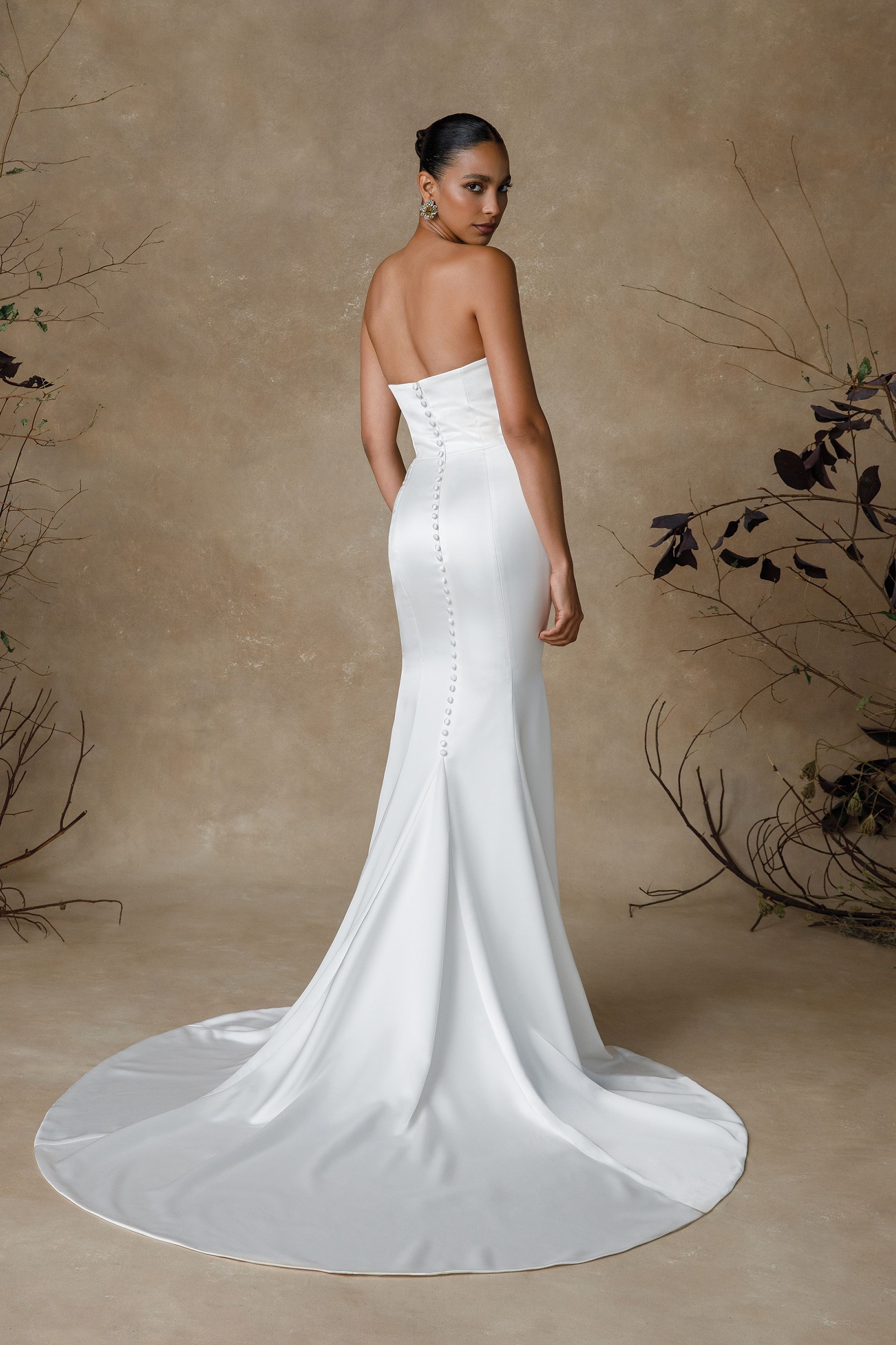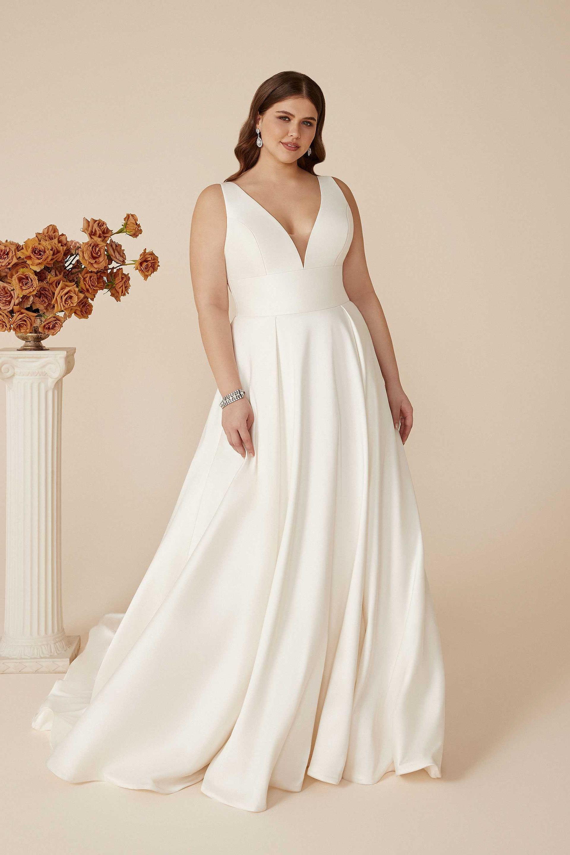 Silhouettes like fit and flare, ballgowns, A-line and mermaid. Fabrics of lace, tulle, satin, mikado, and crepe