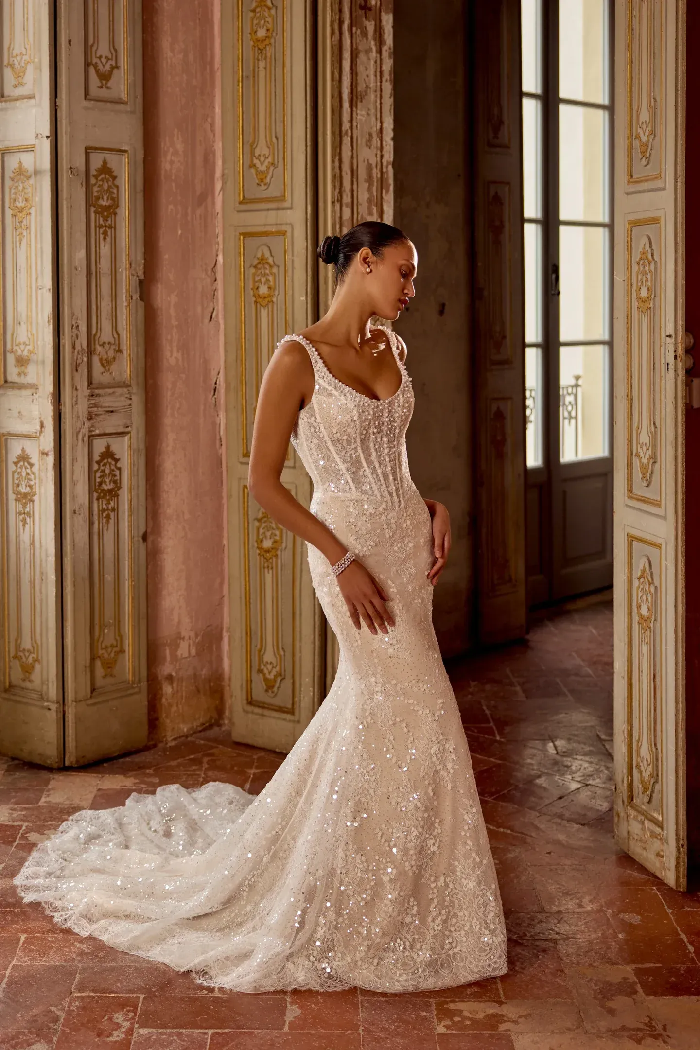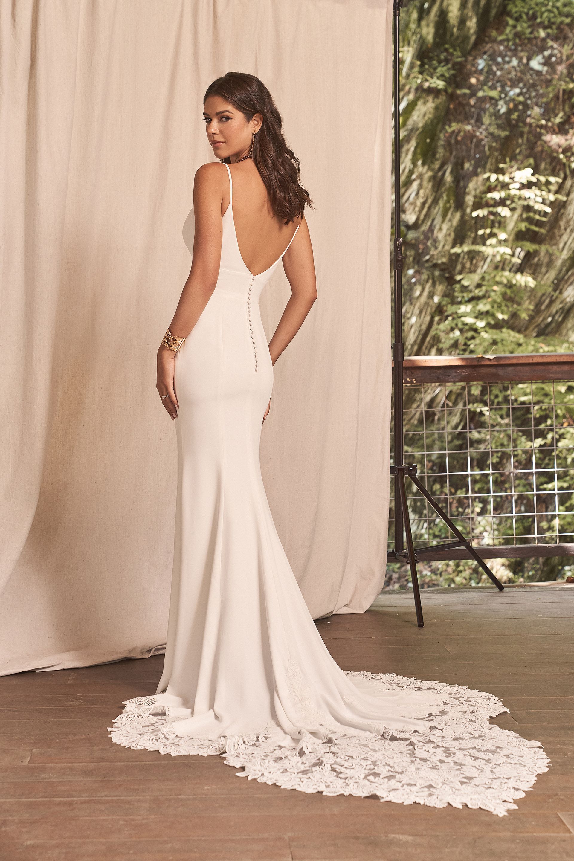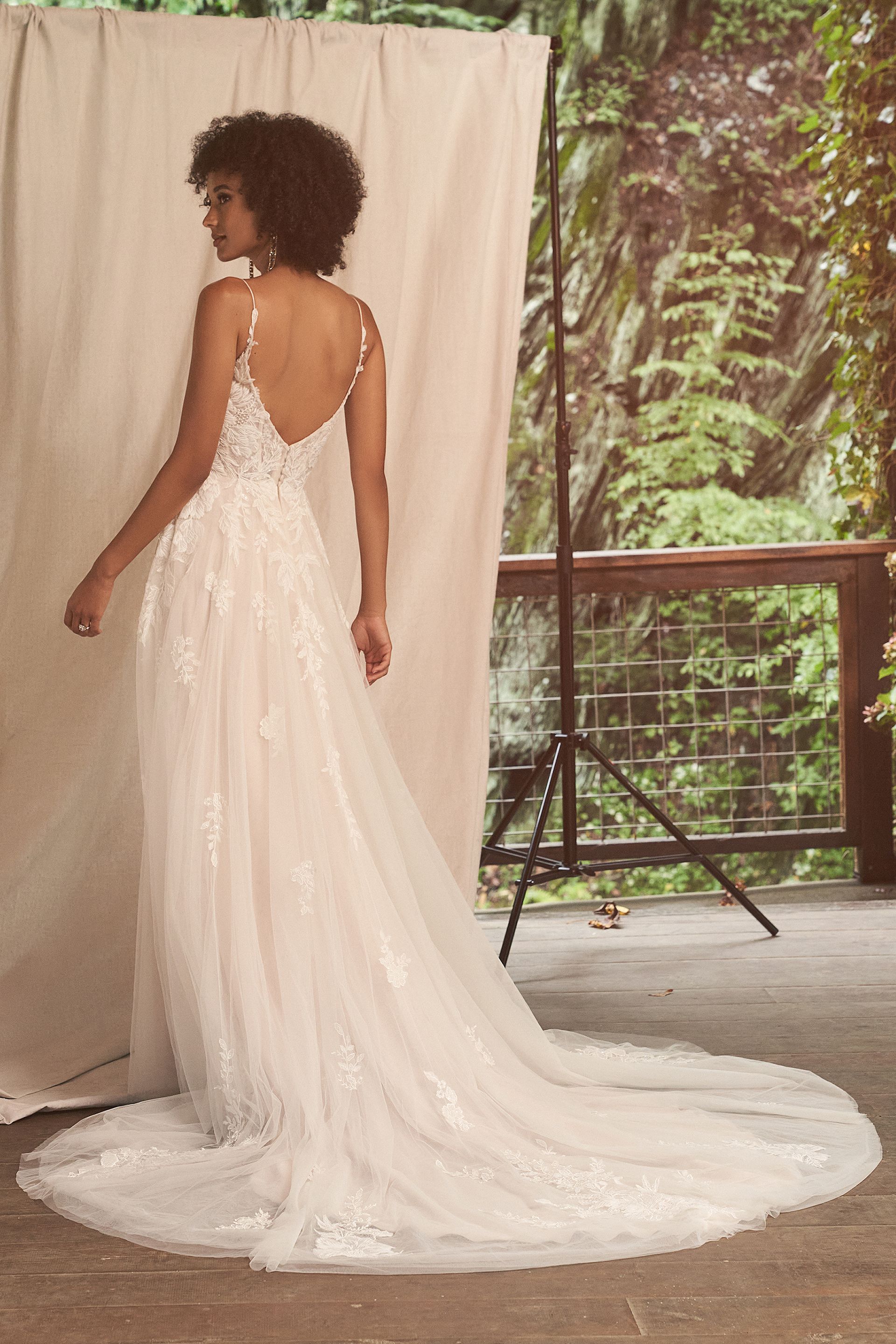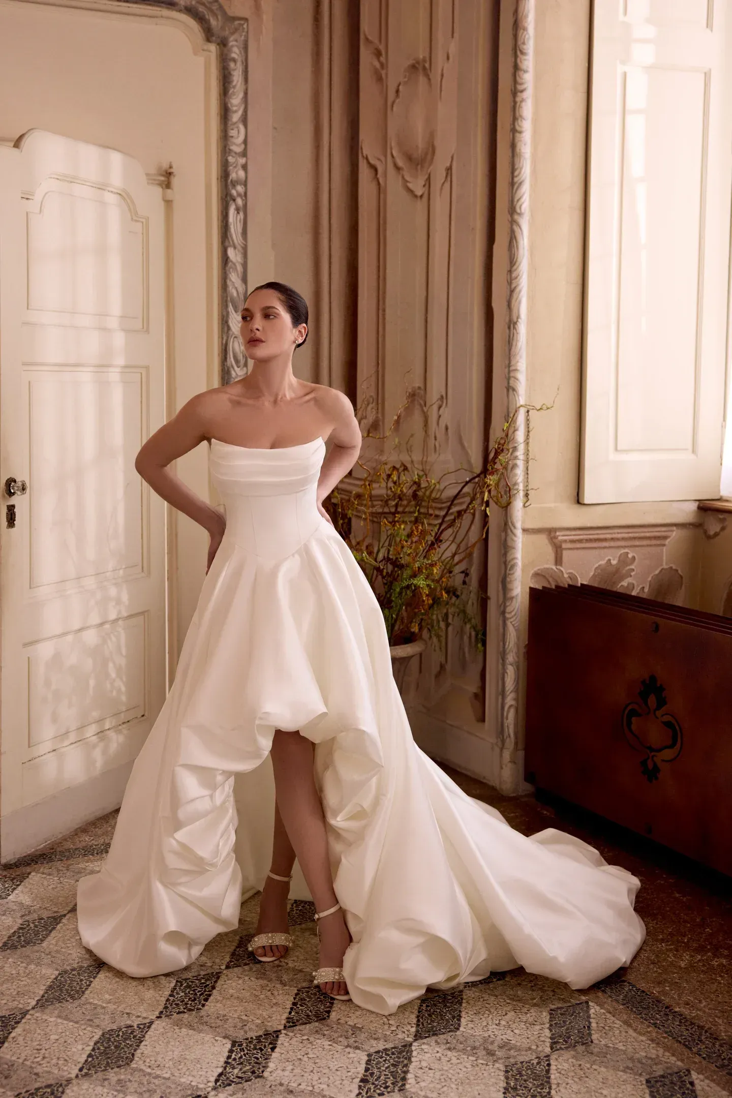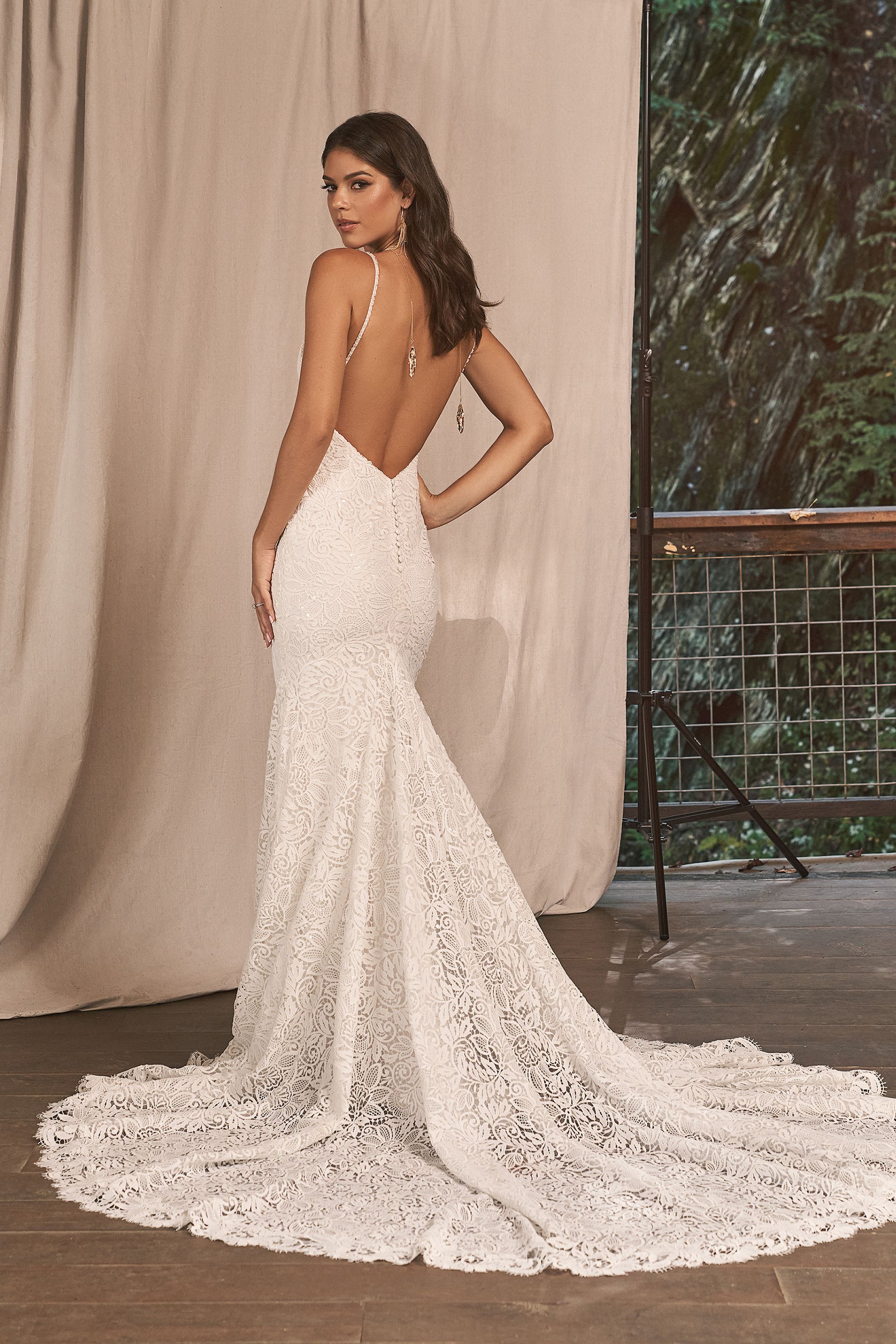 Silhouettes like fit and flare, ballgowns, A-line and mermaid. Fabrics of lace, tulle, satin, mikado, and crepe