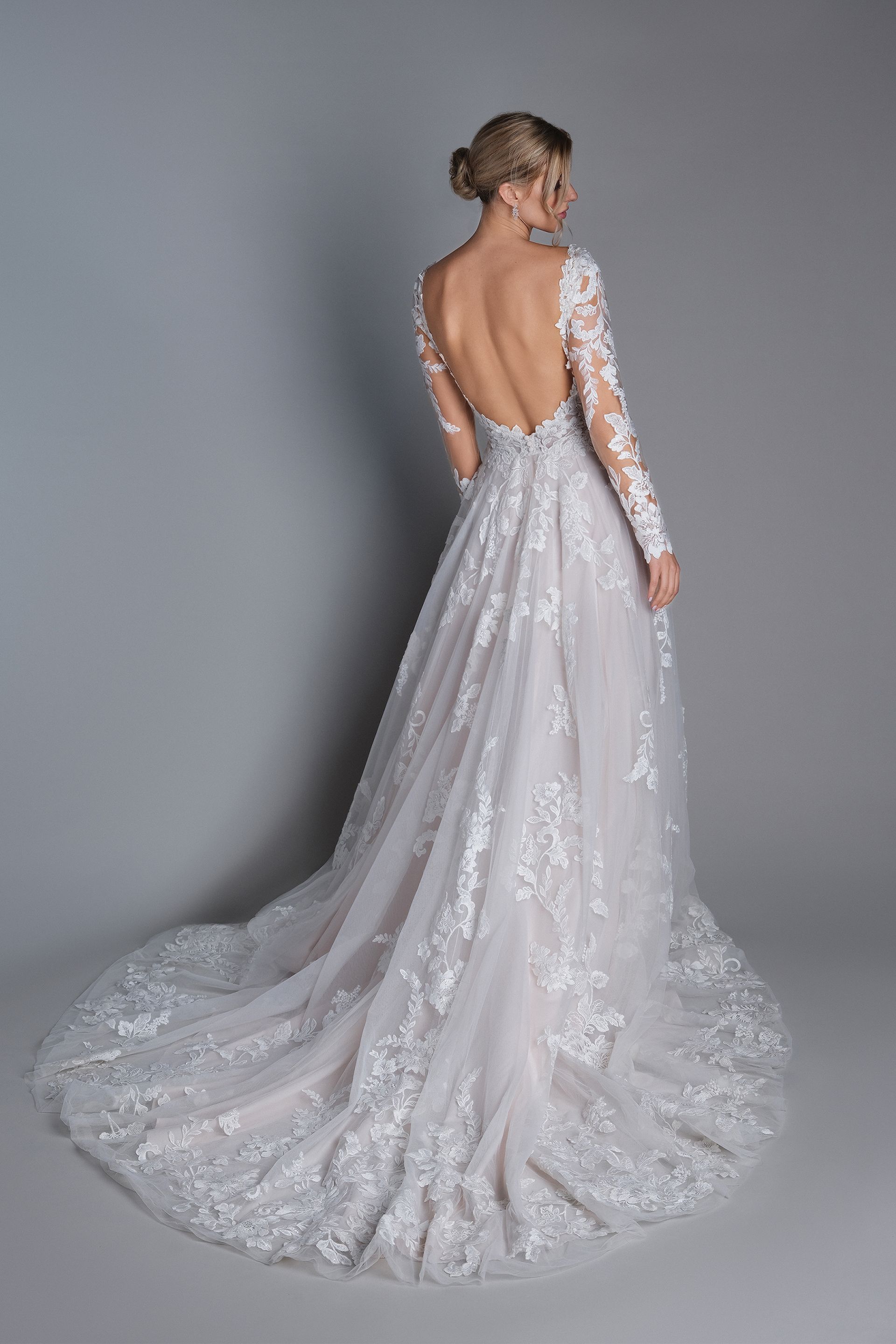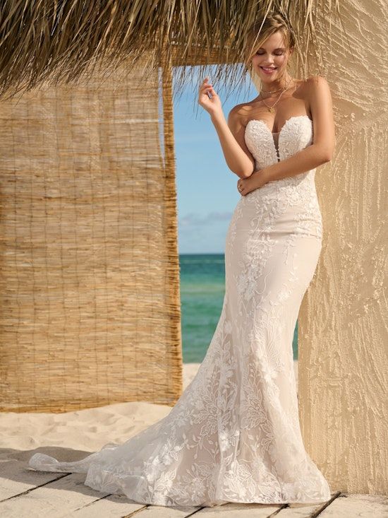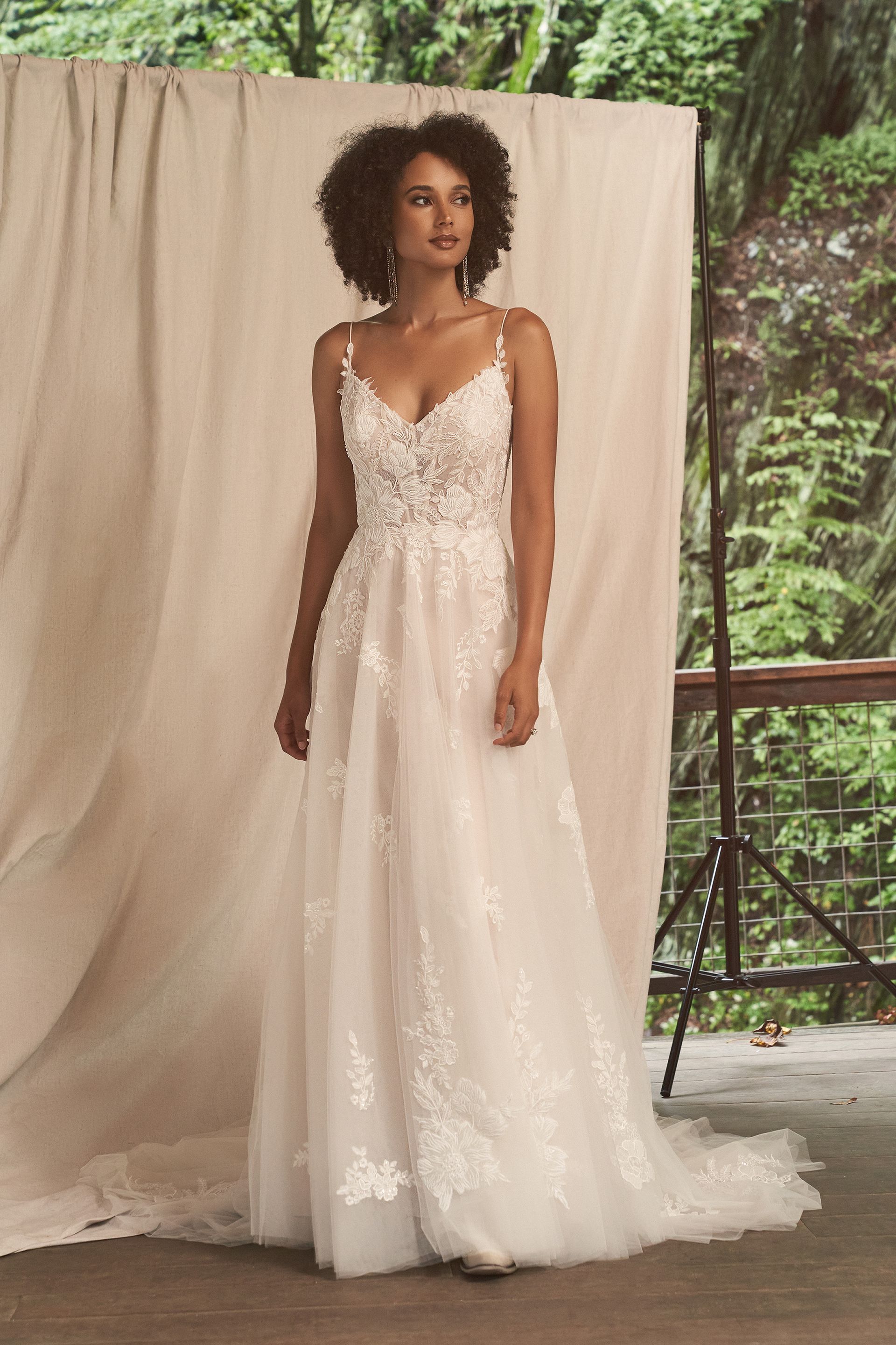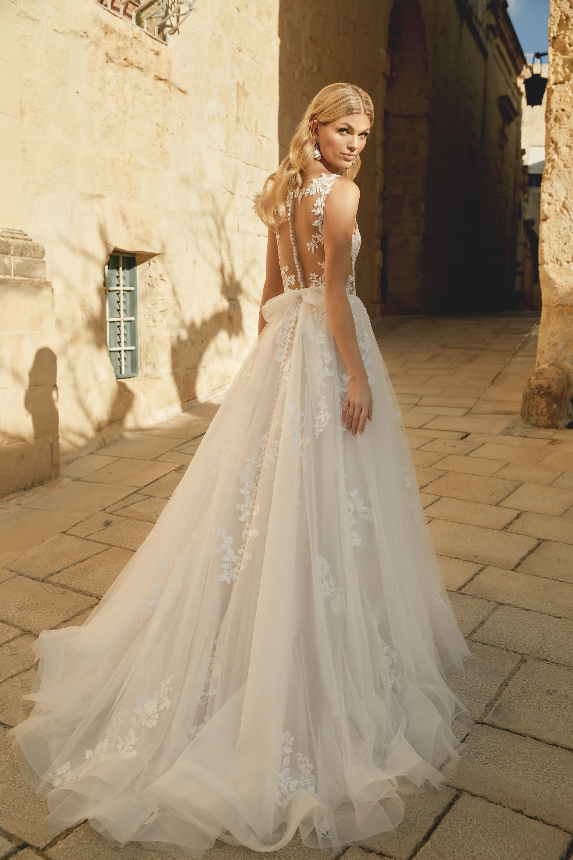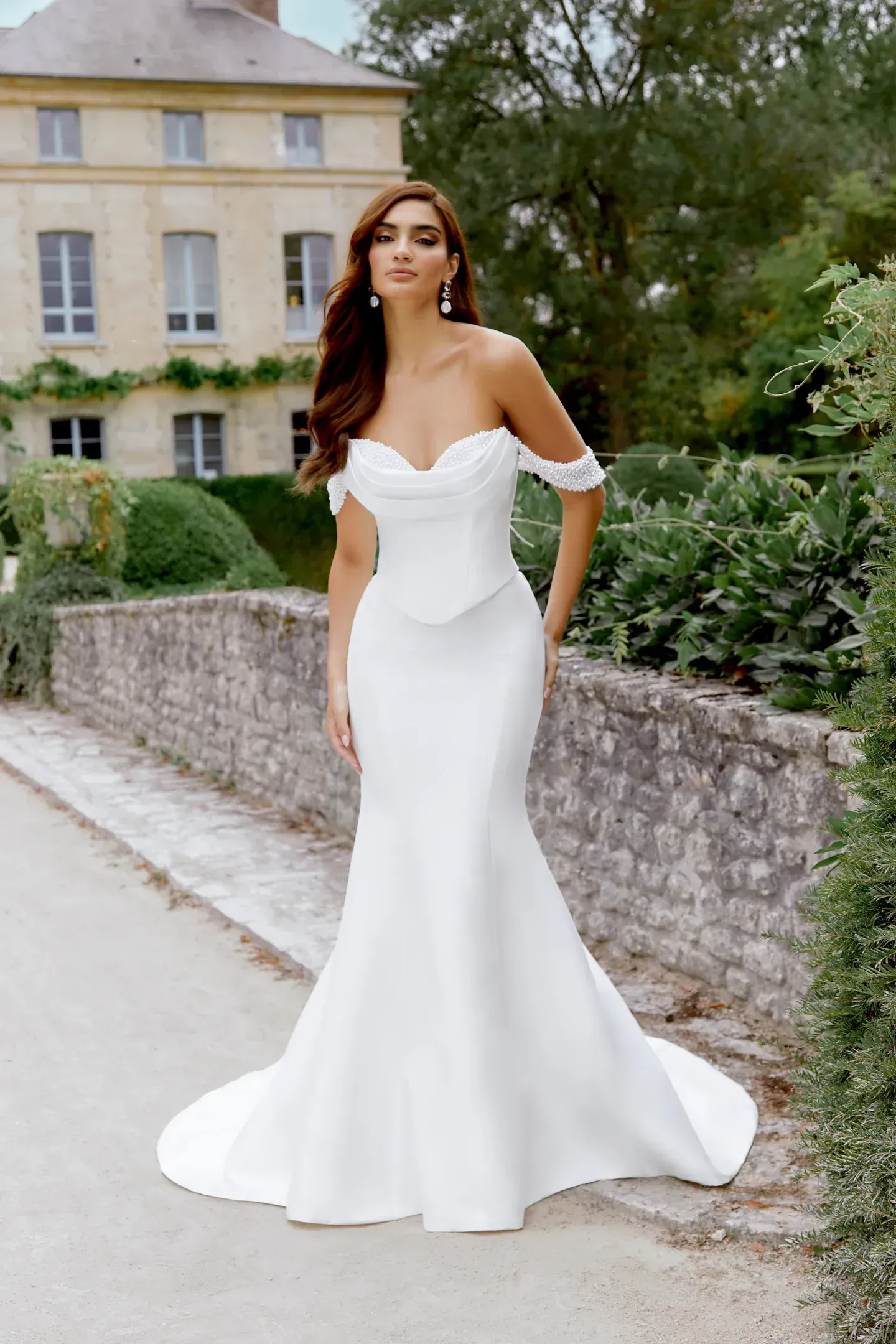 Silhouettes like fit and flare, ballgowns, A-line and mermaid. Fabrics of lace, tulle, satin, mikado, and crepe