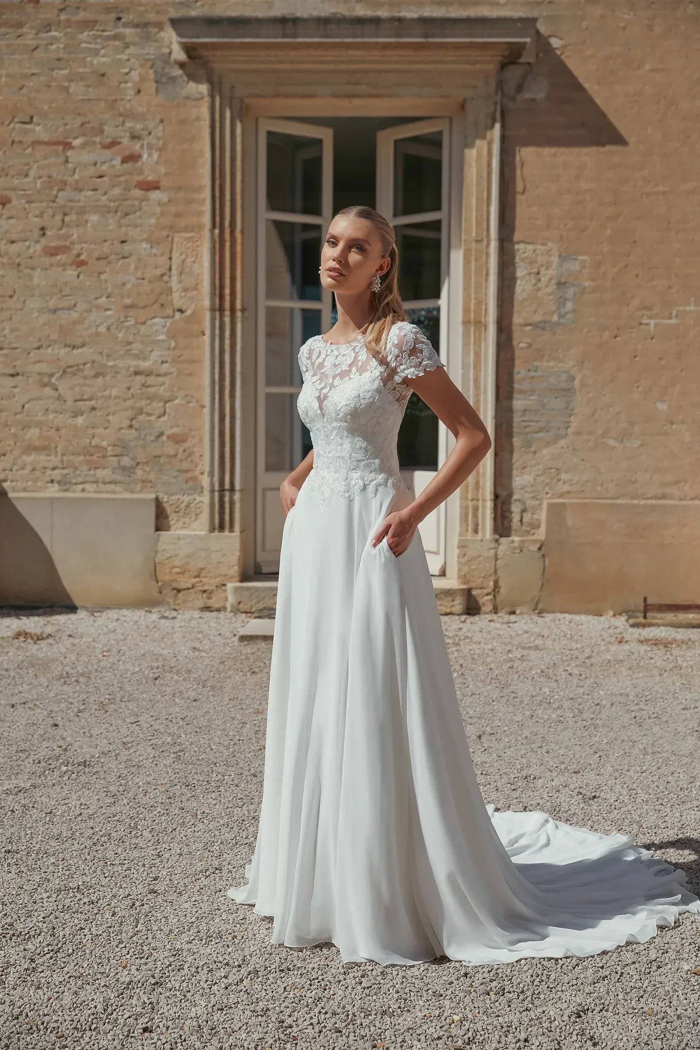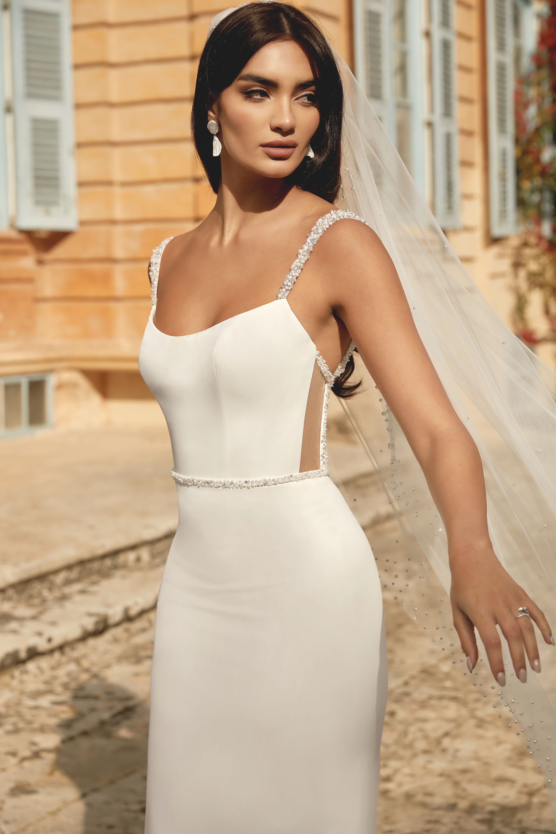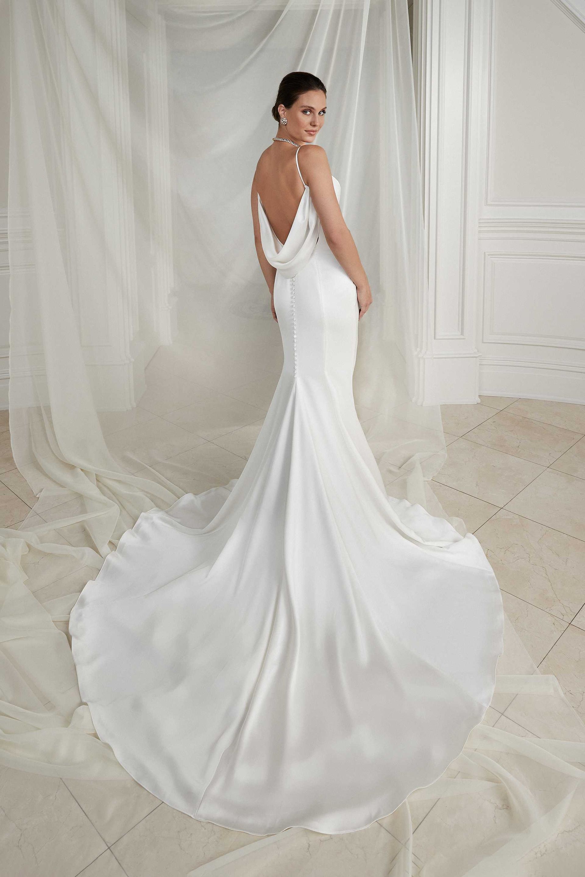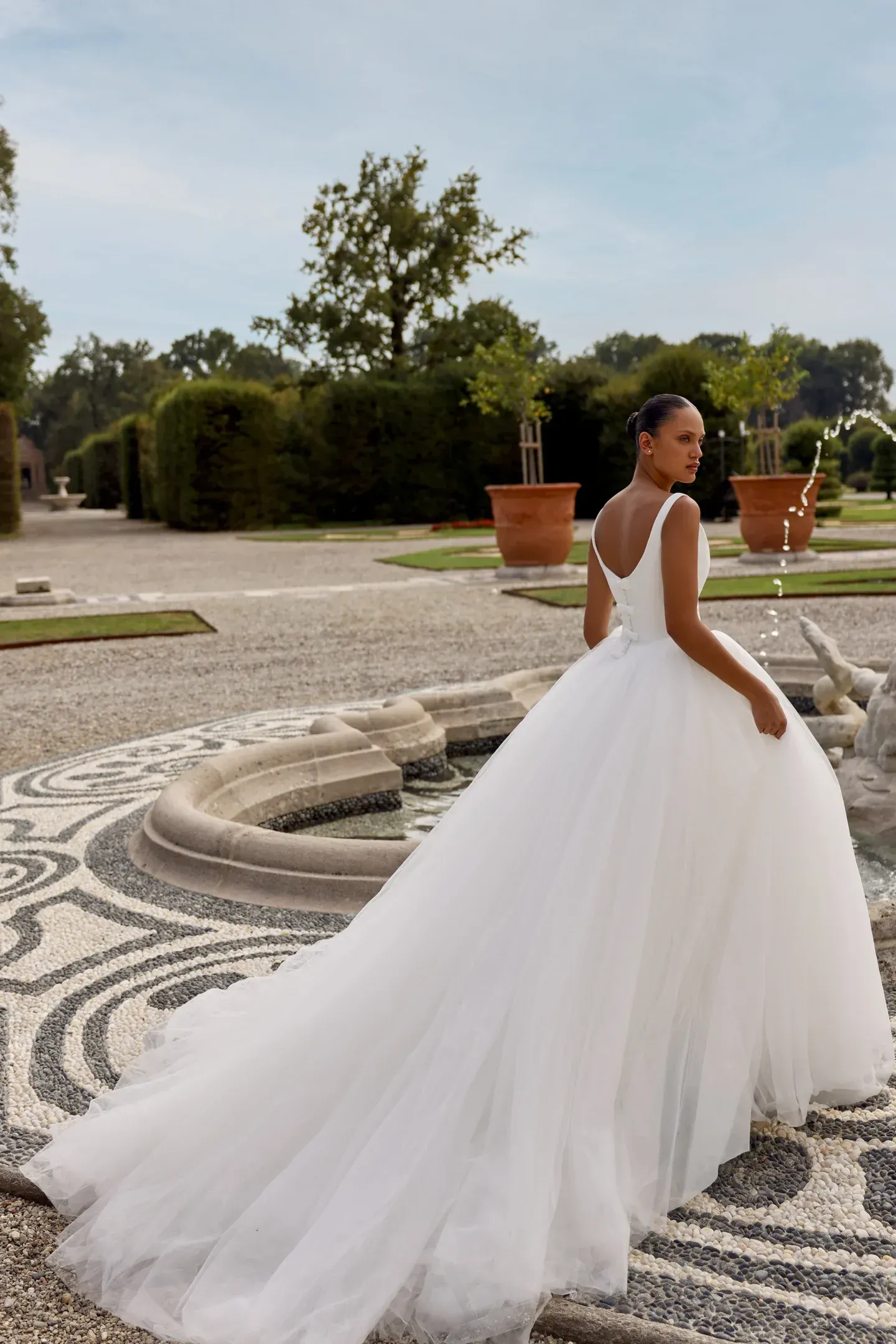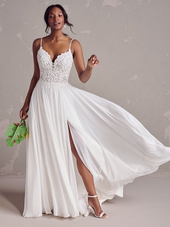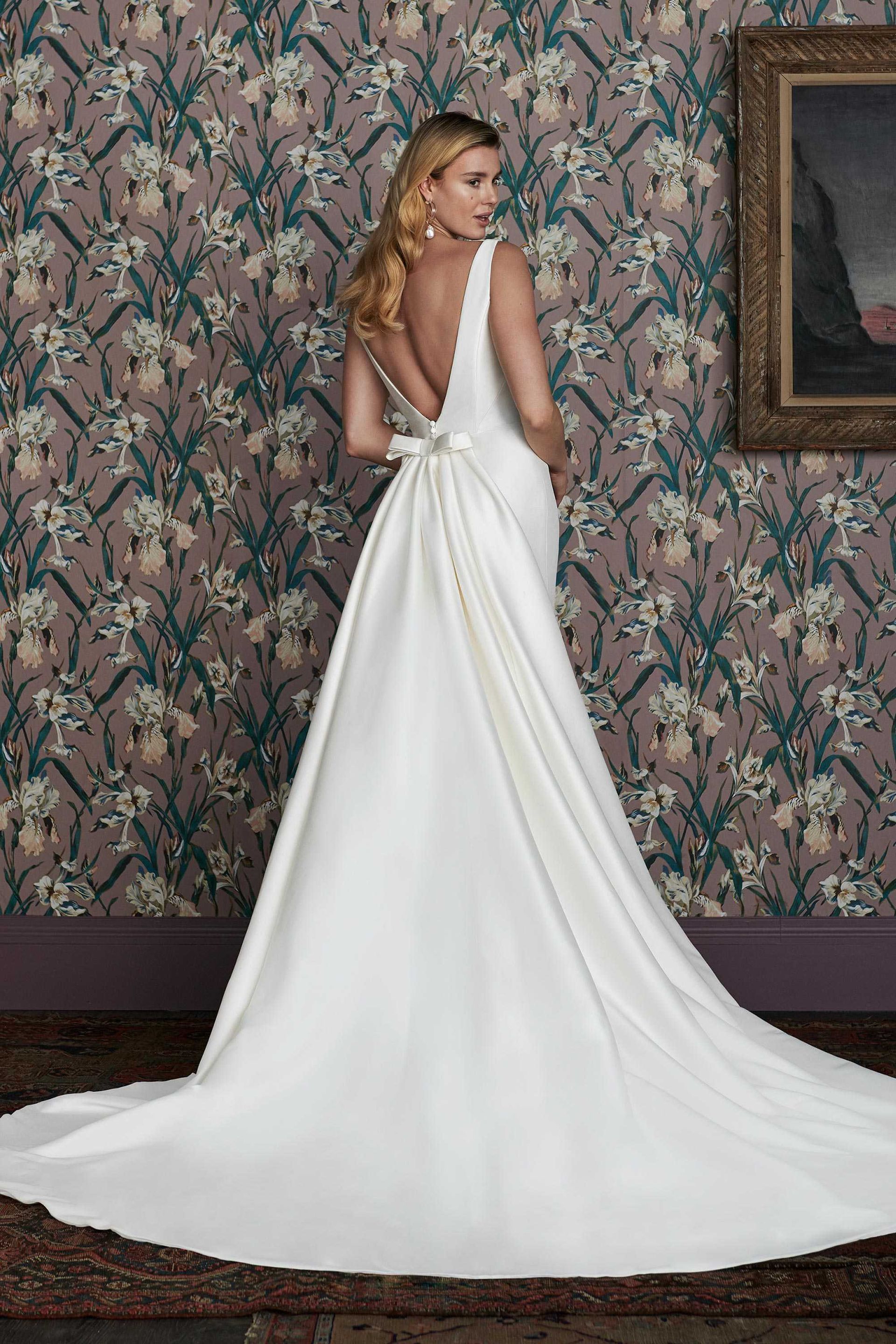 Silhouettes like fit and flare, ballgowns, A-line and mermaid. Fabrics of lace, tulle, satin, mikado, and crepe